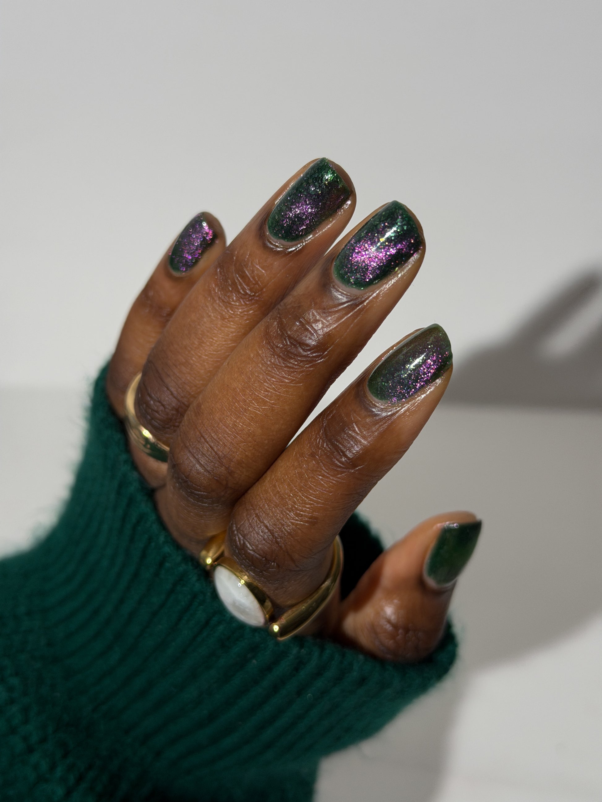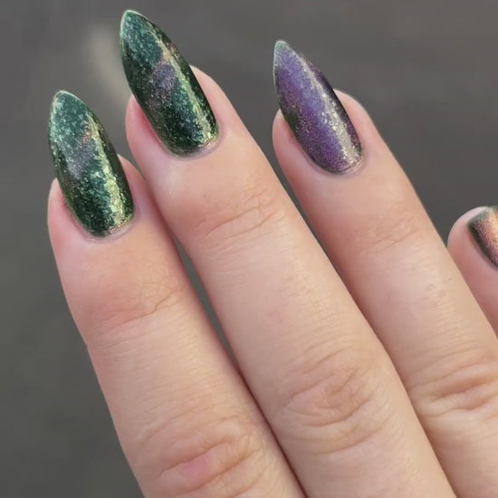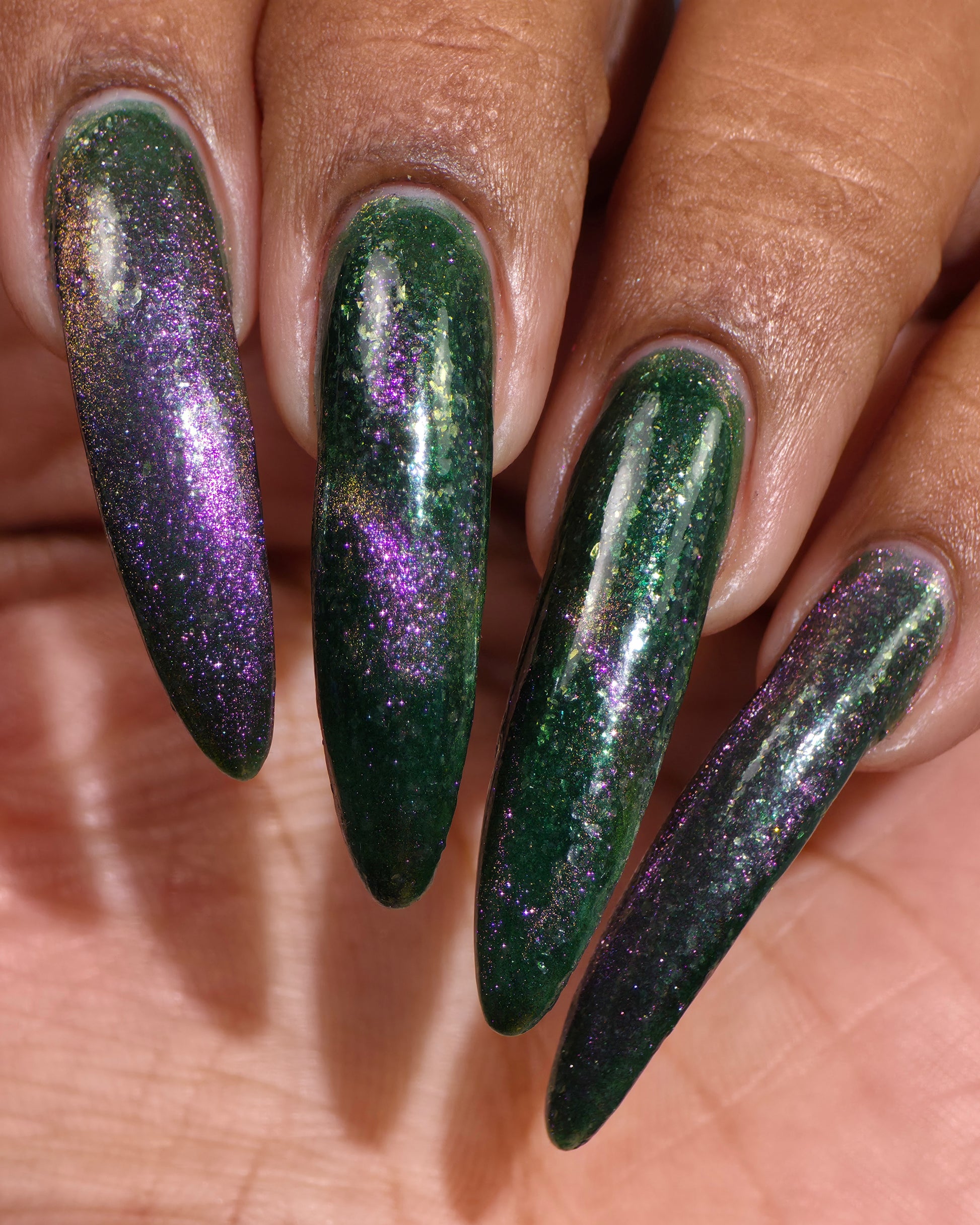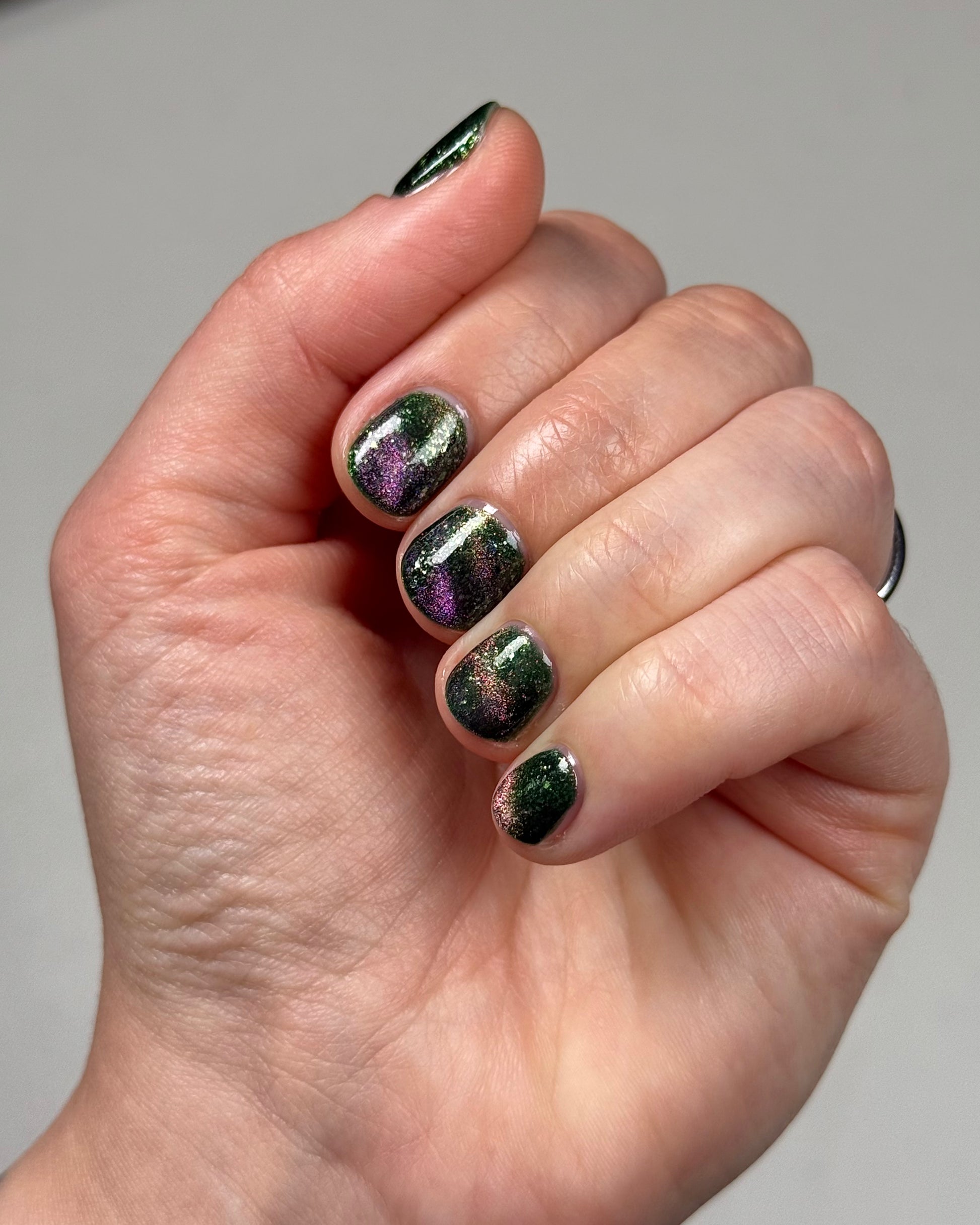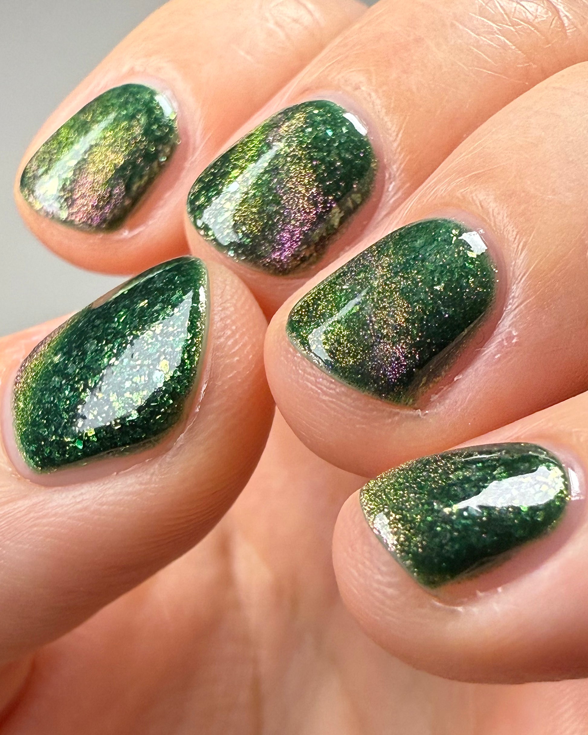 Arcadia is a deep green jelly base with mini gold flakes and a pink to gold to green magnetic pigment. This polish is inspired by Sleep Token’s Even in Arcadia.