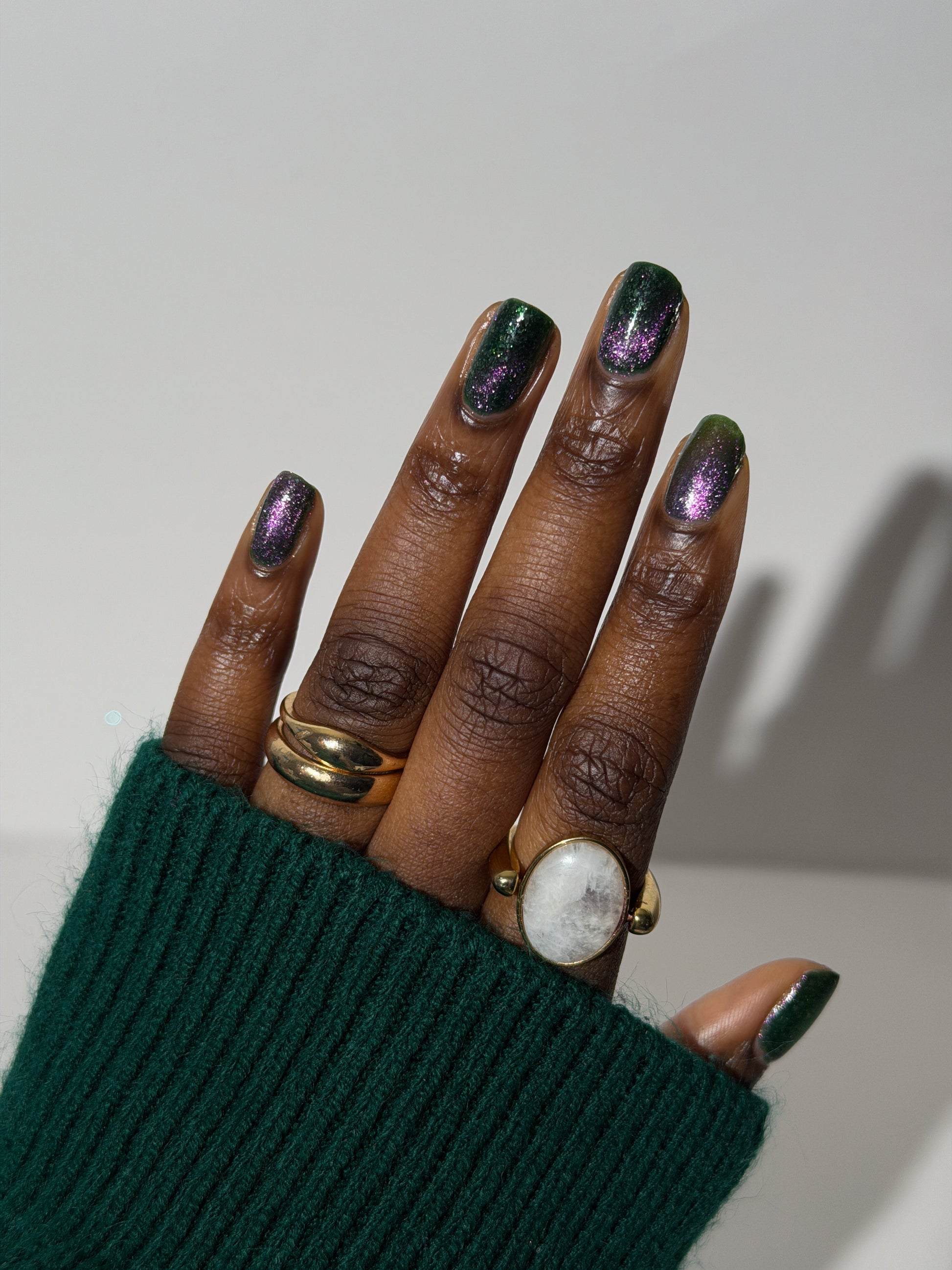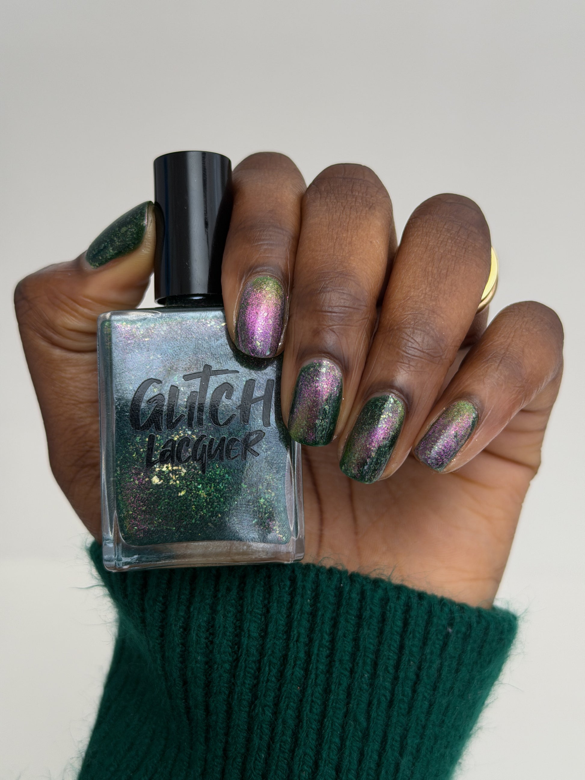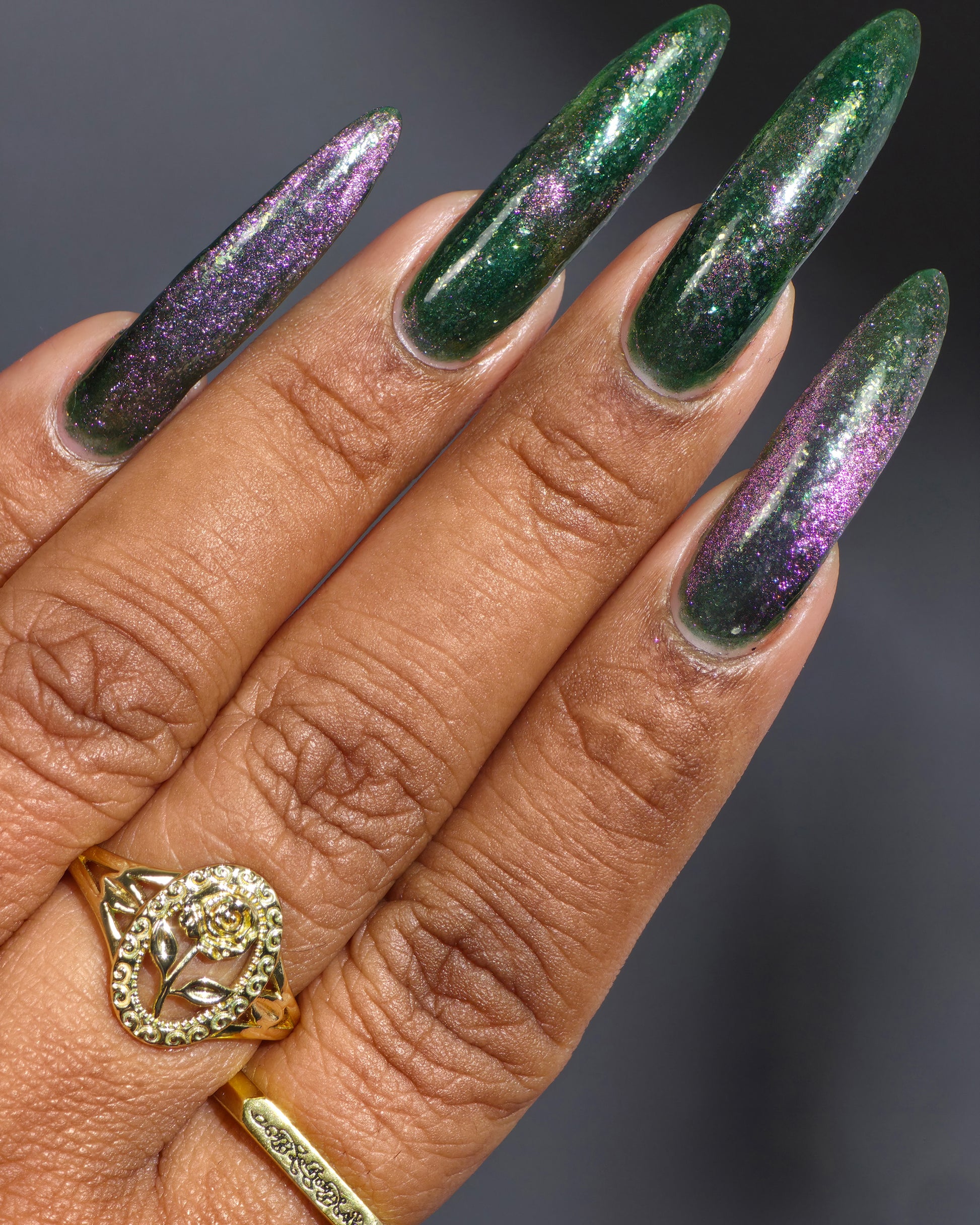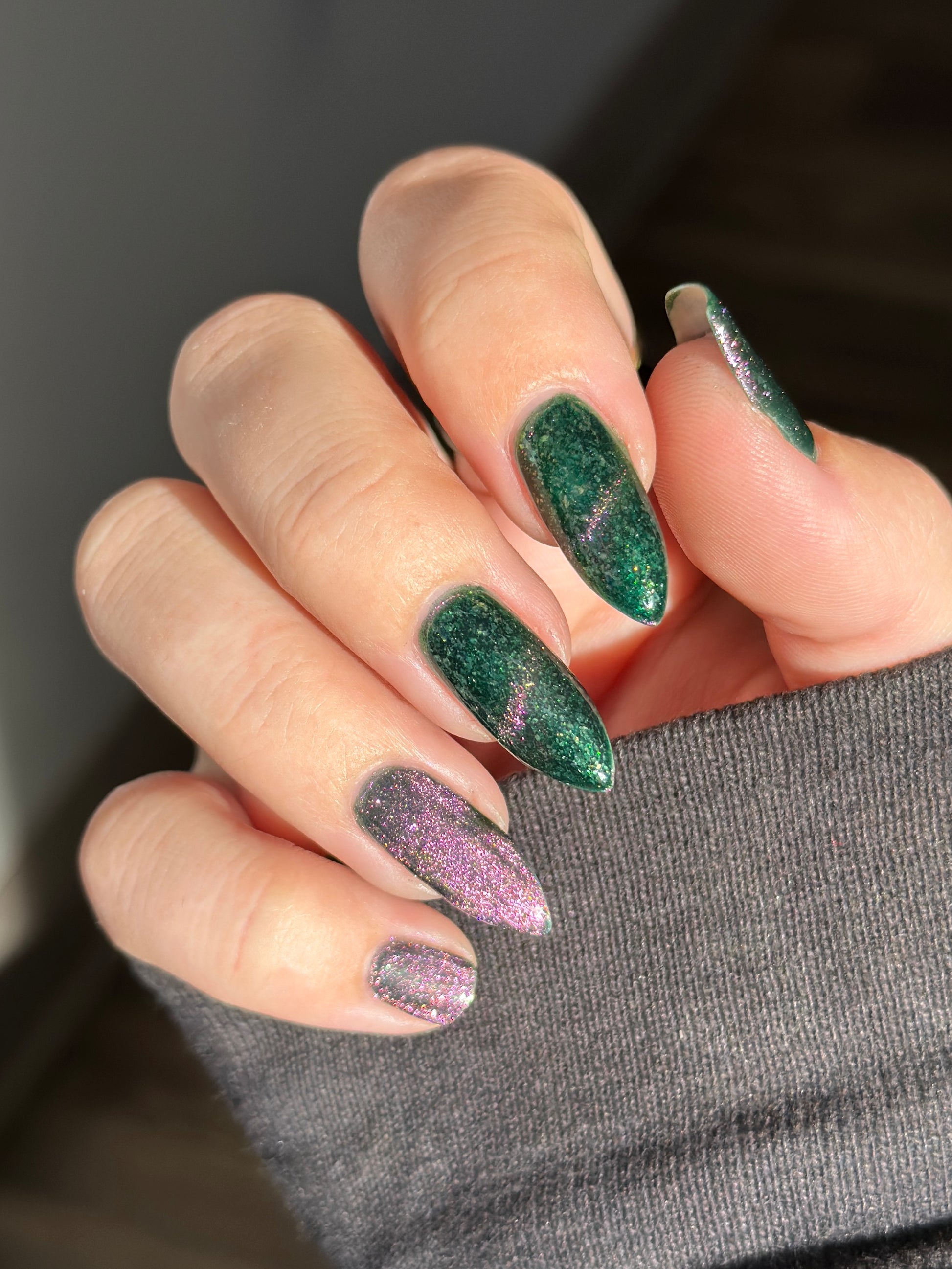 Arcadia is a deep green jelly base with mini gold flakes and a pink to gold to green magnetic pigment. This polish is inspired by Sleep Token’s Even in Arcadia.