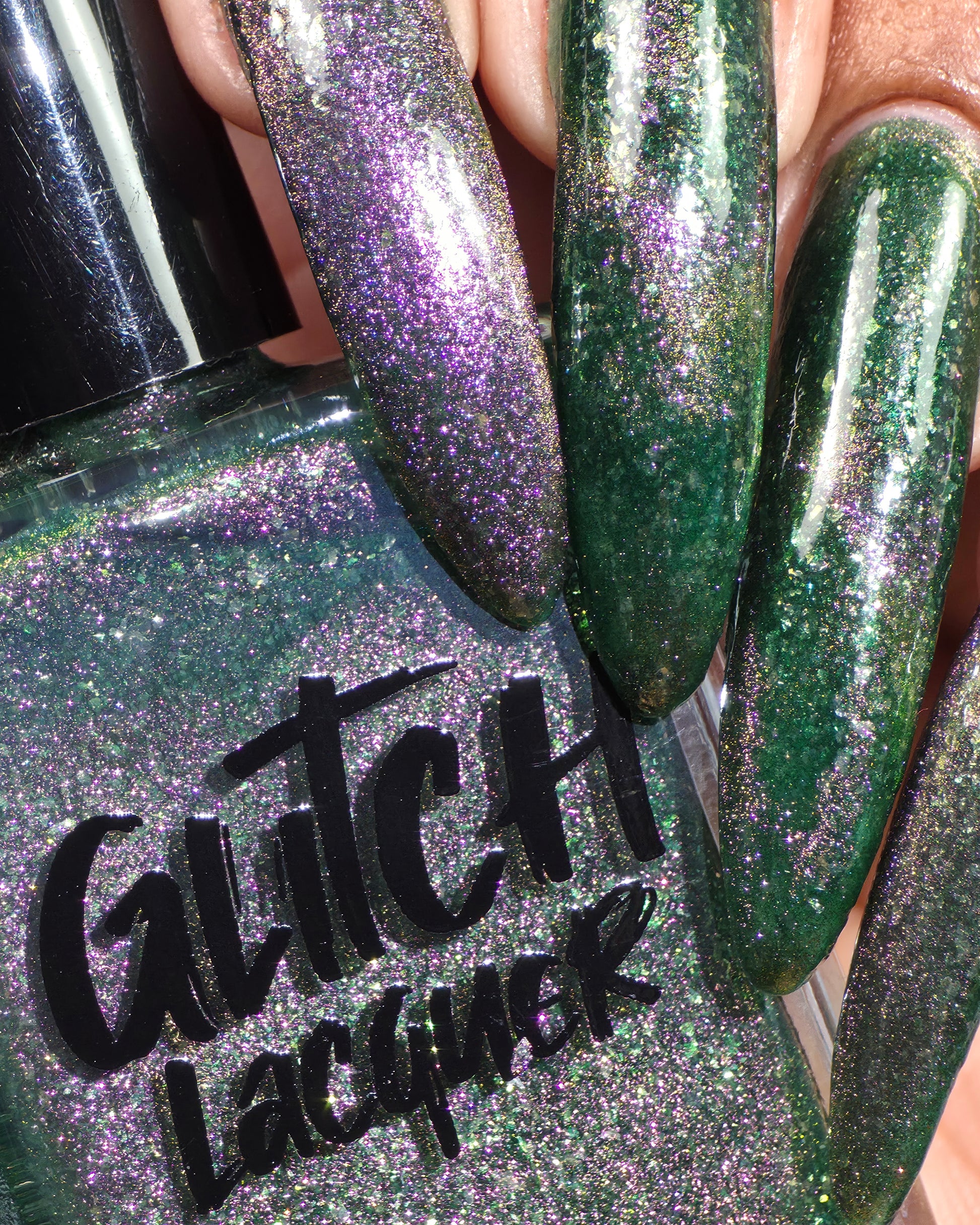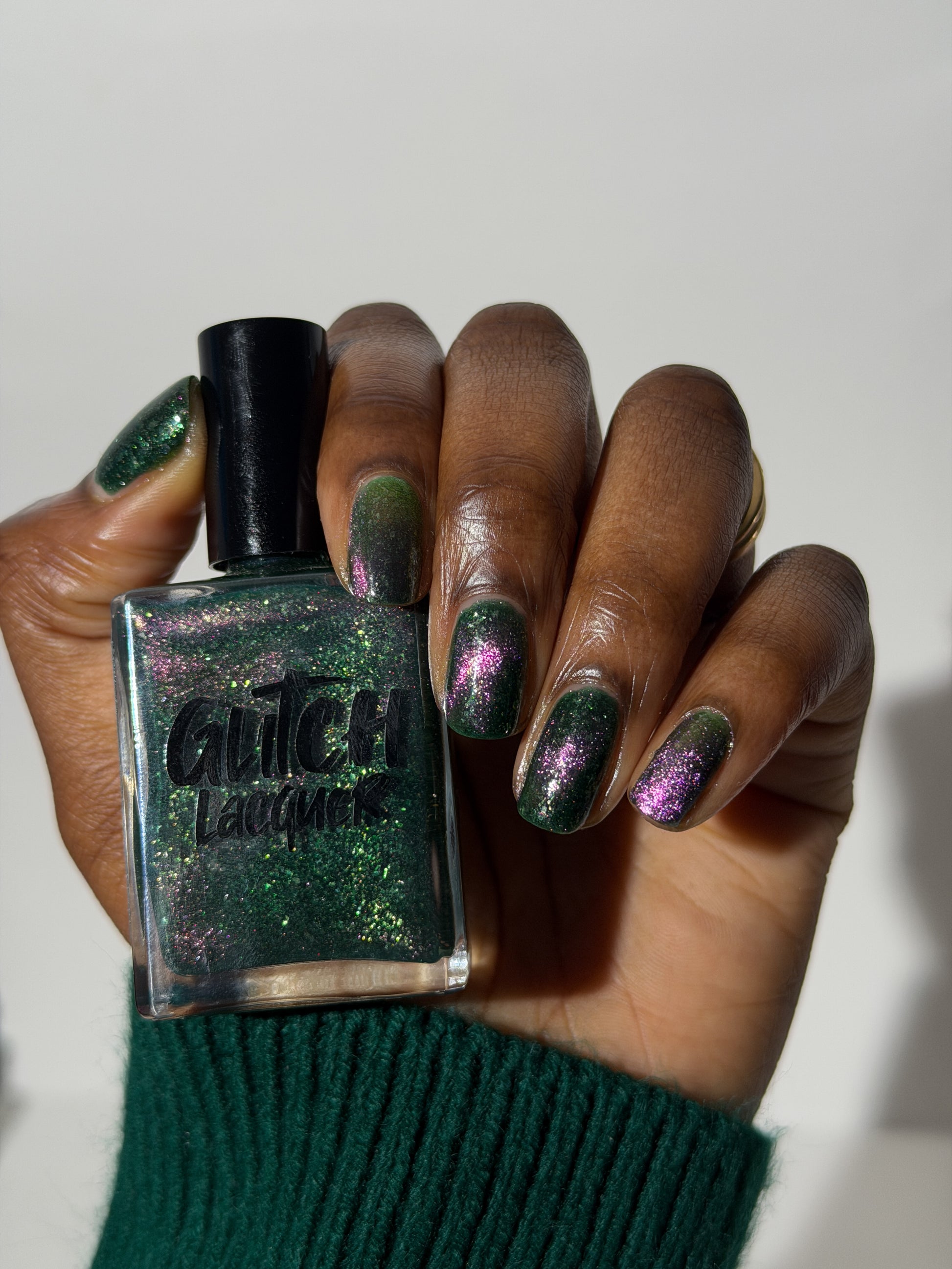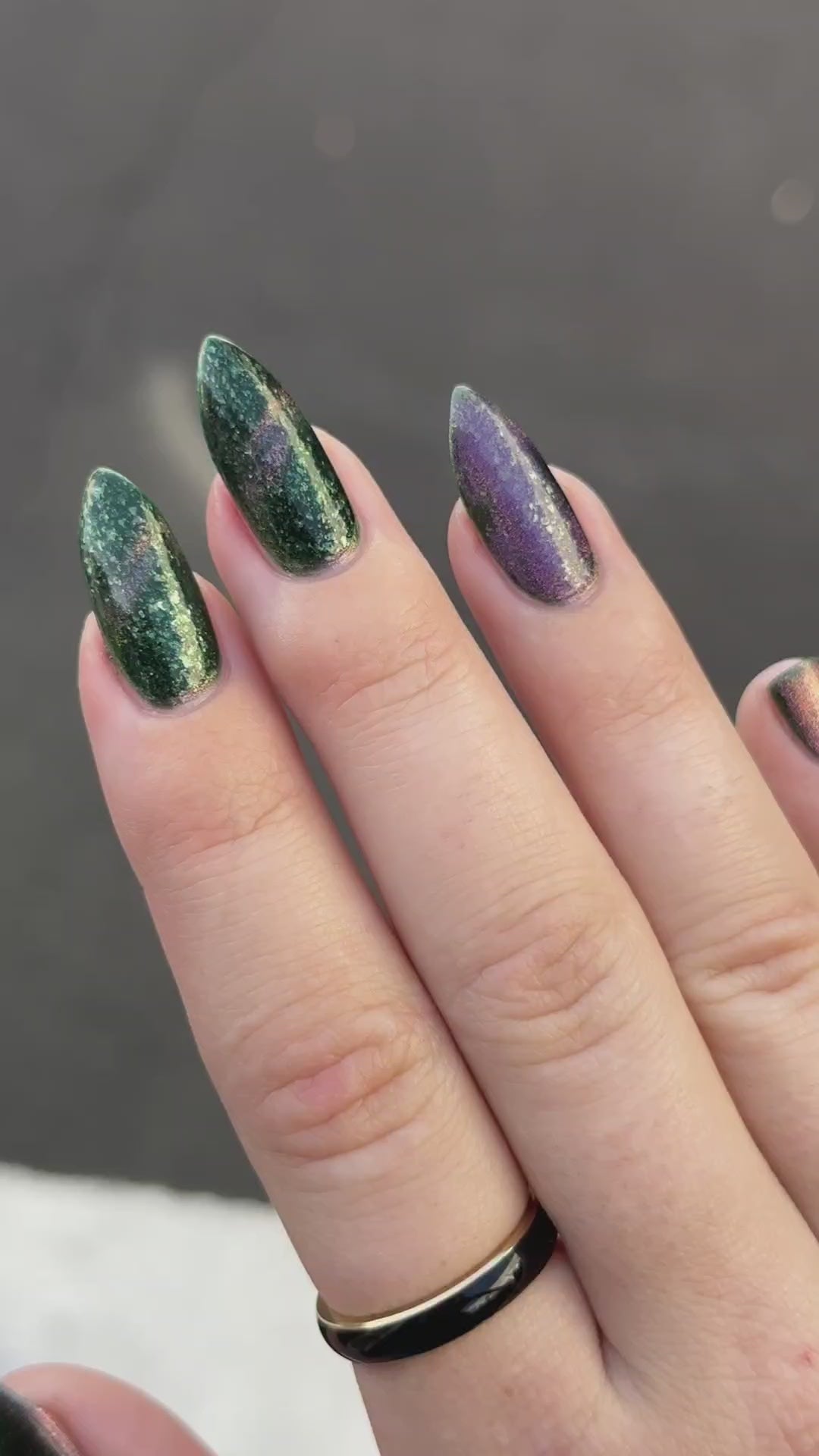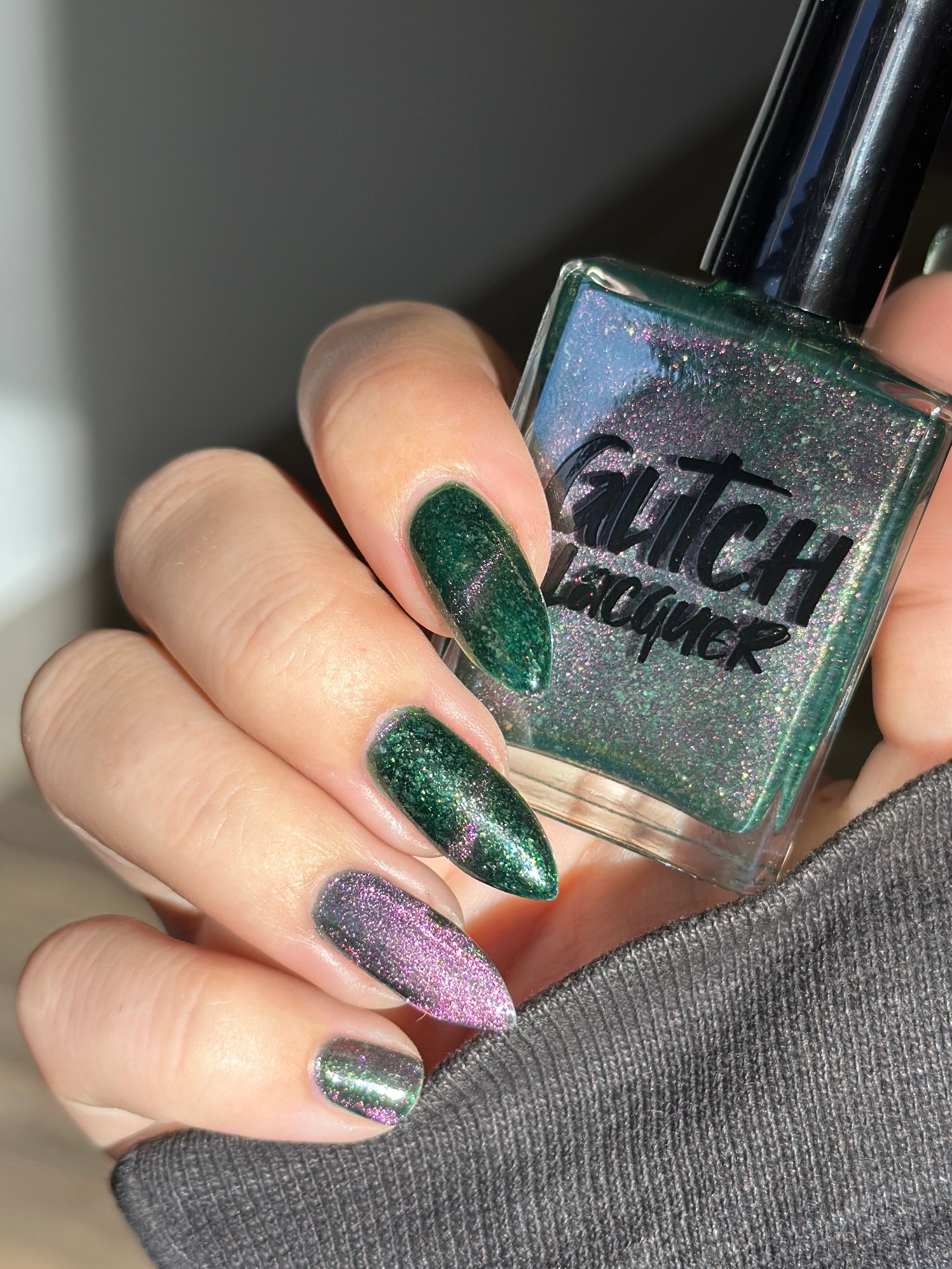 Arcadia is a deep green jelly base with mini gold flakes and a pink to gold to green magnetic pigment. This polish is inspired by Sleep Token’s Even in Arcadia.