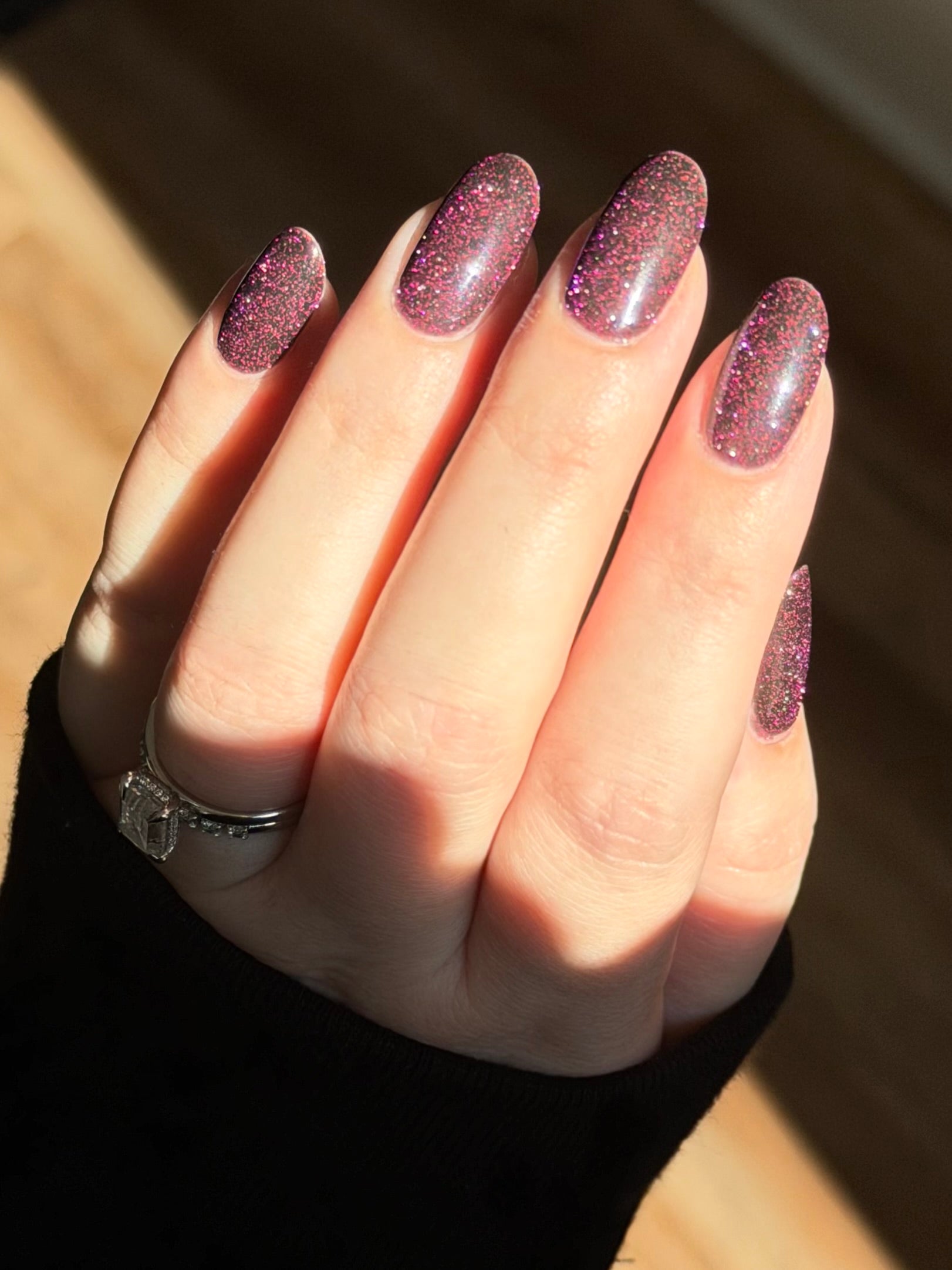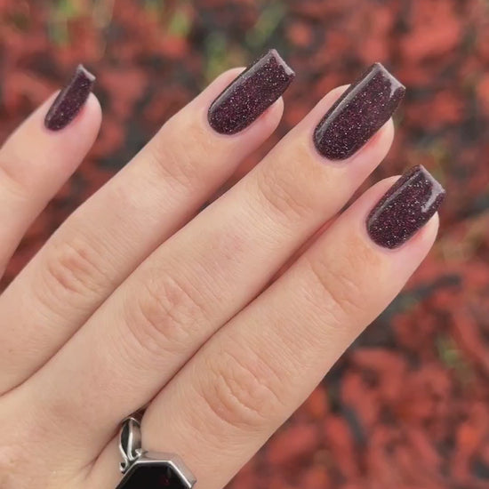 Black Dahlia is a soft black base packed with hot pink reflective glitter. A smoothing top coat is recommended for this polish.