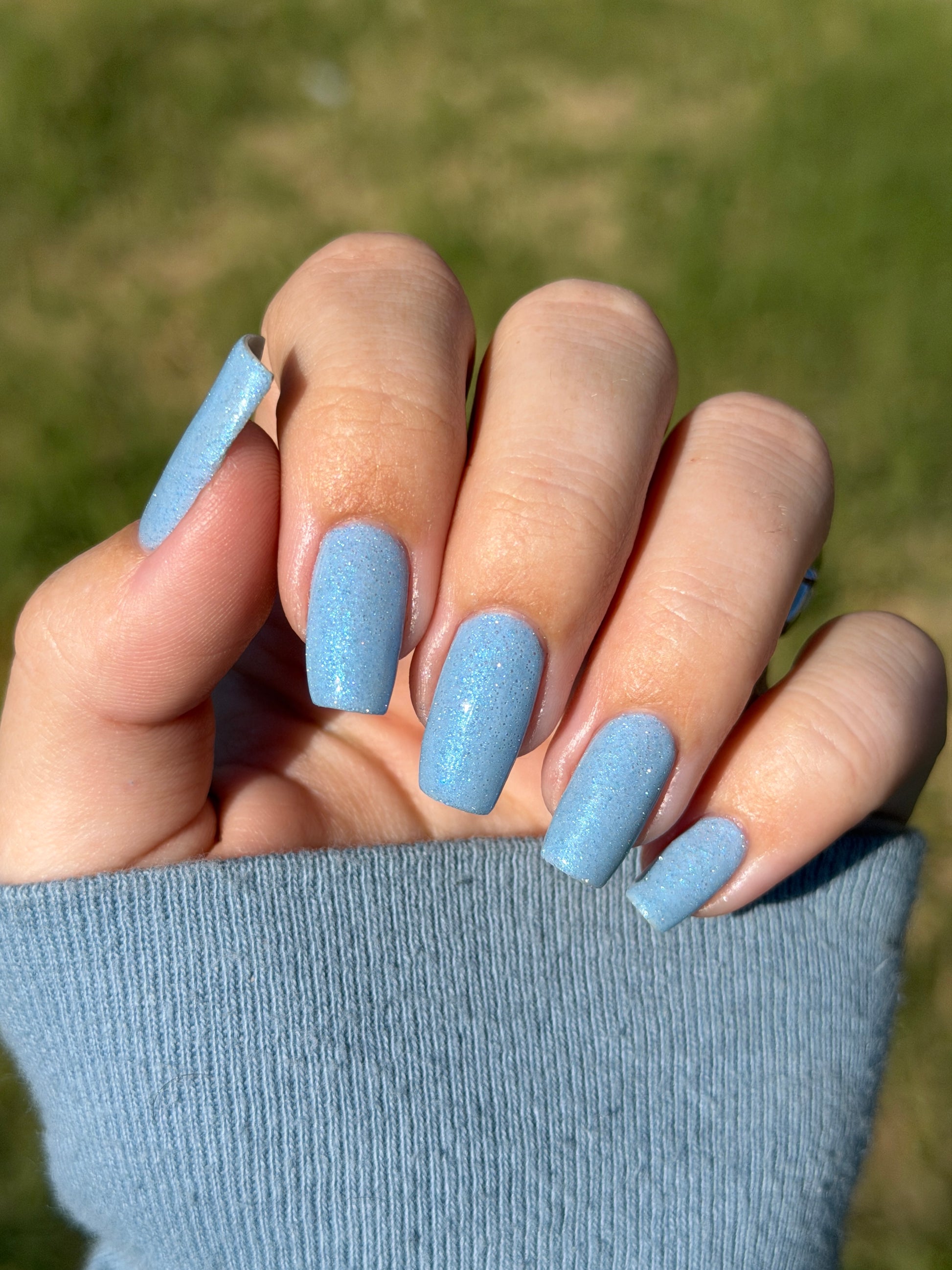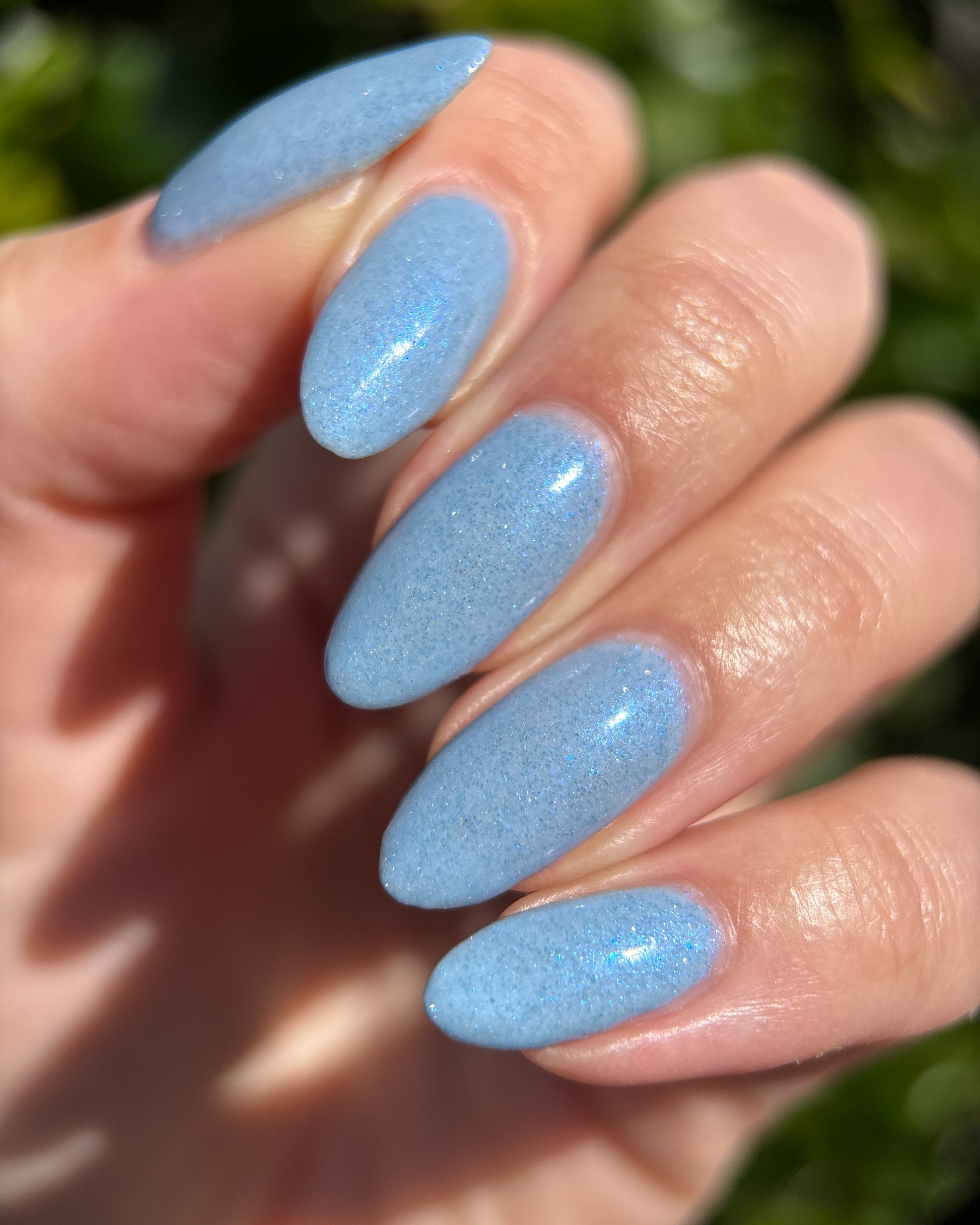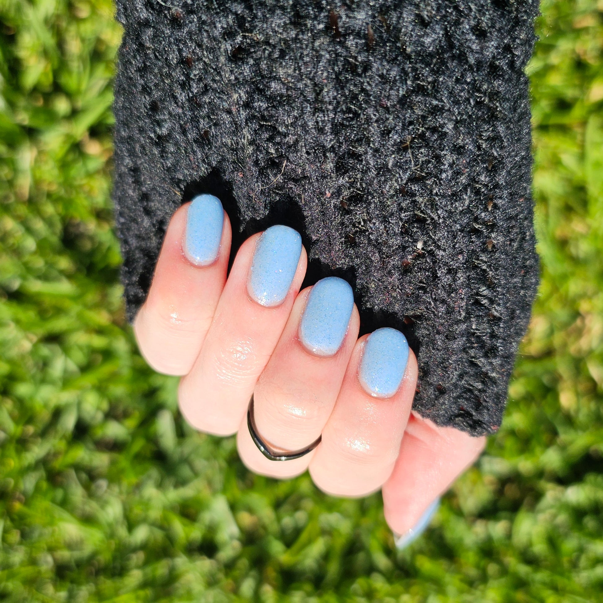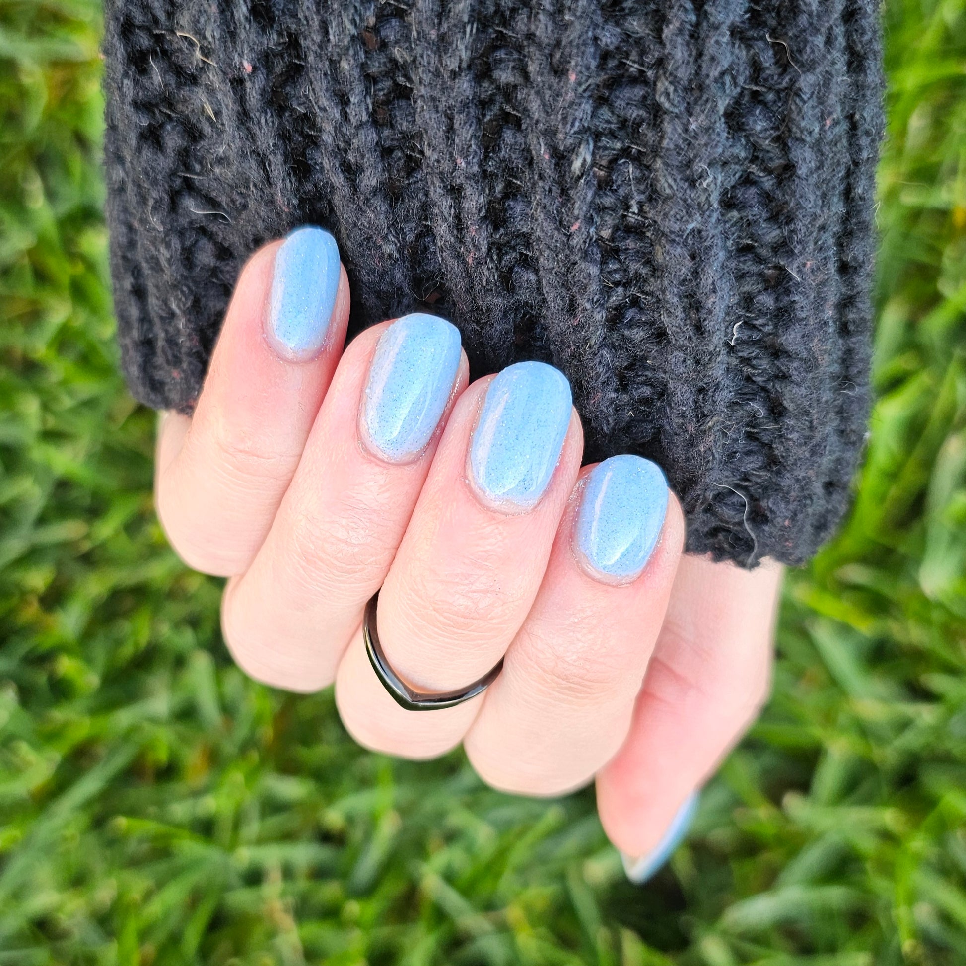By Any Means Necessary is a light blue, with a hint of grey, polish with a subtle blue to purple sheen, blue-grey reflective glitters, and iridescent blue-green glitters. Due to the nature of the glitters, it is recommended to use a smoothing top coat.