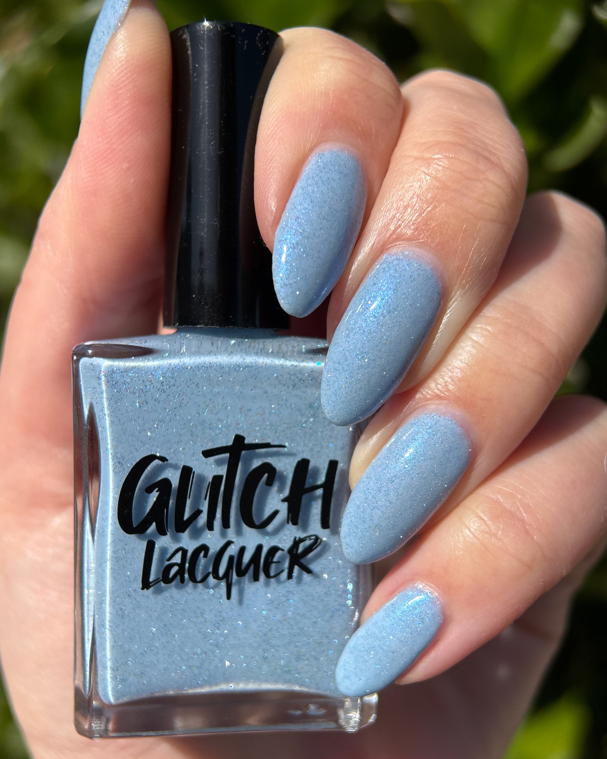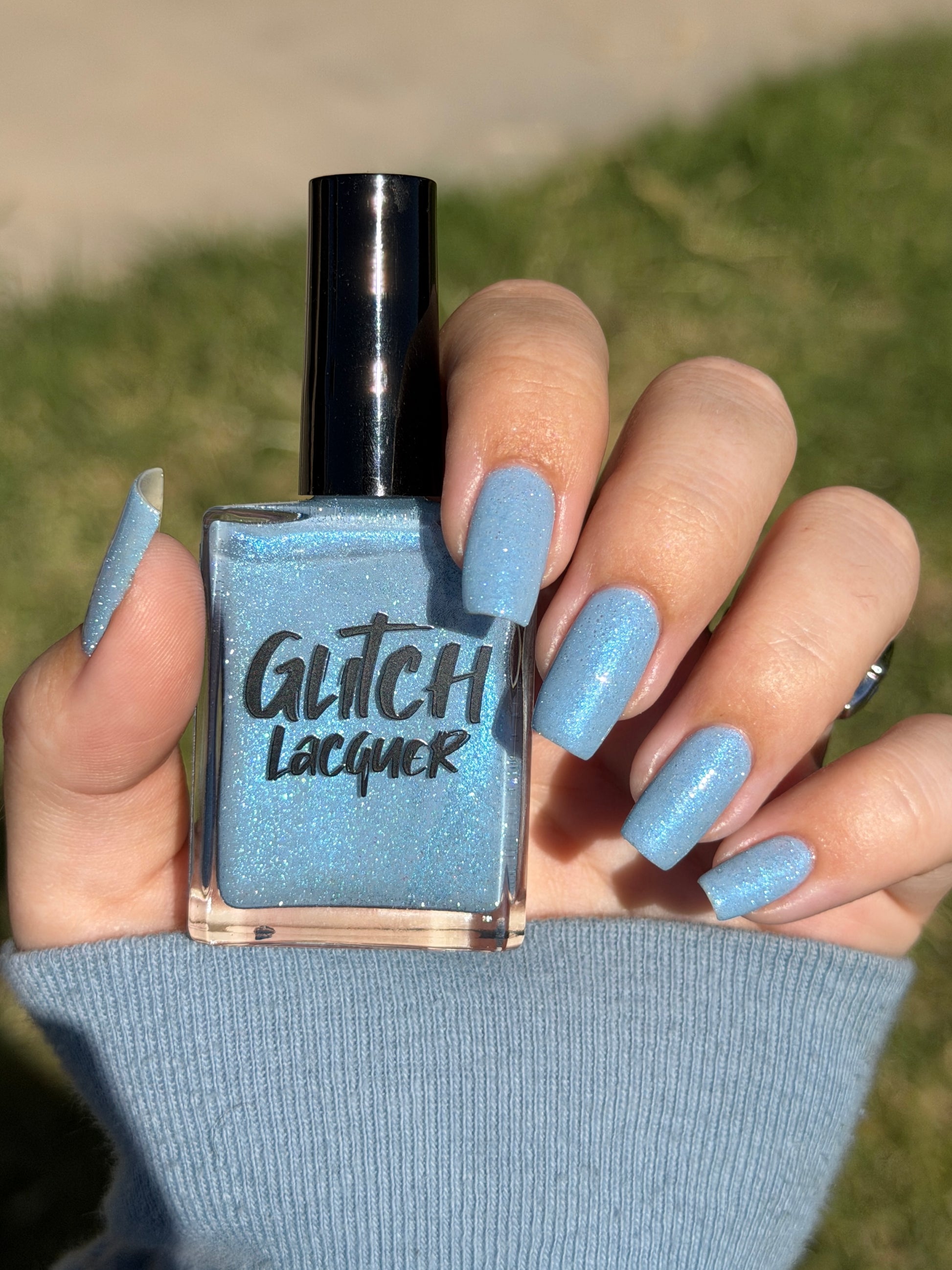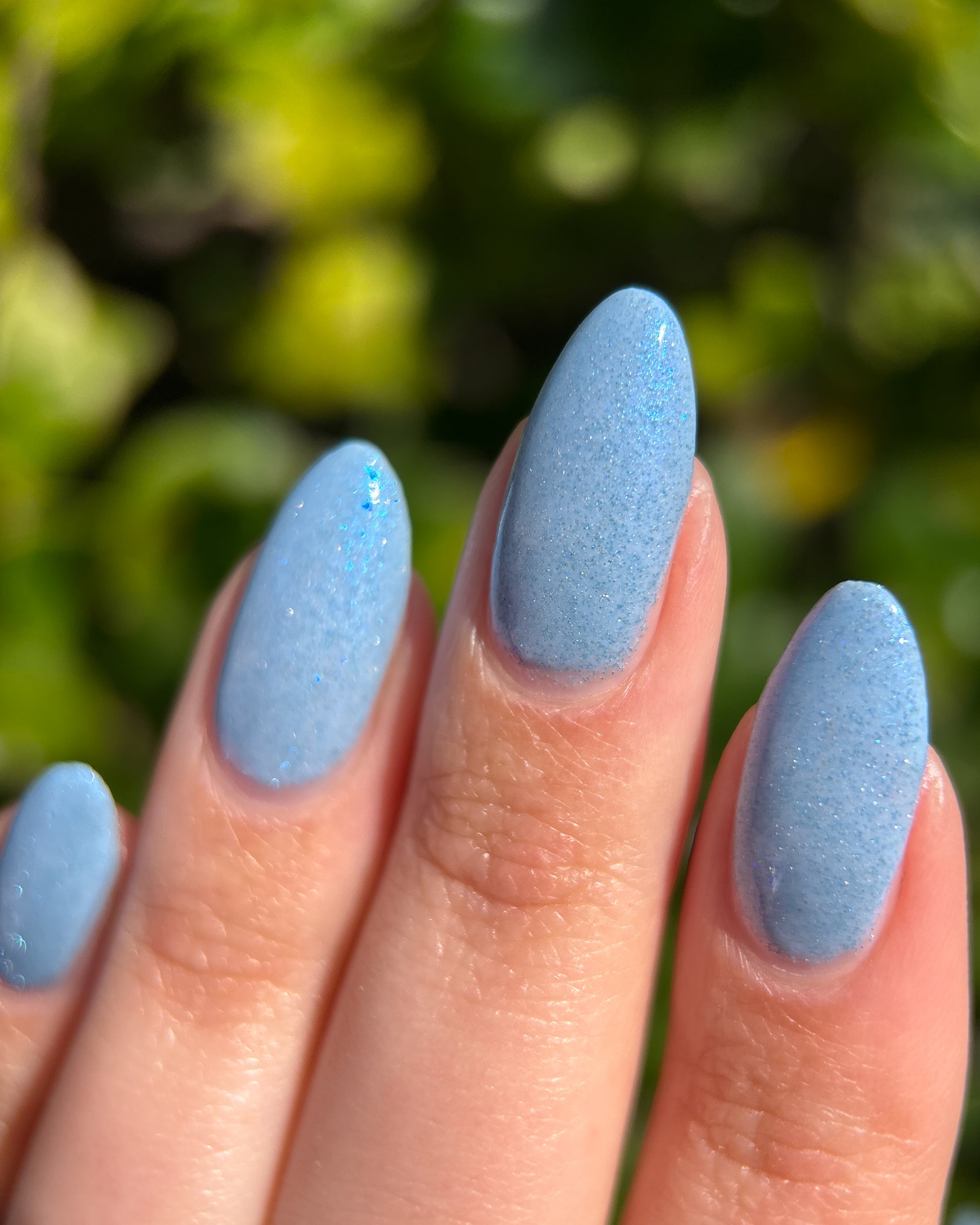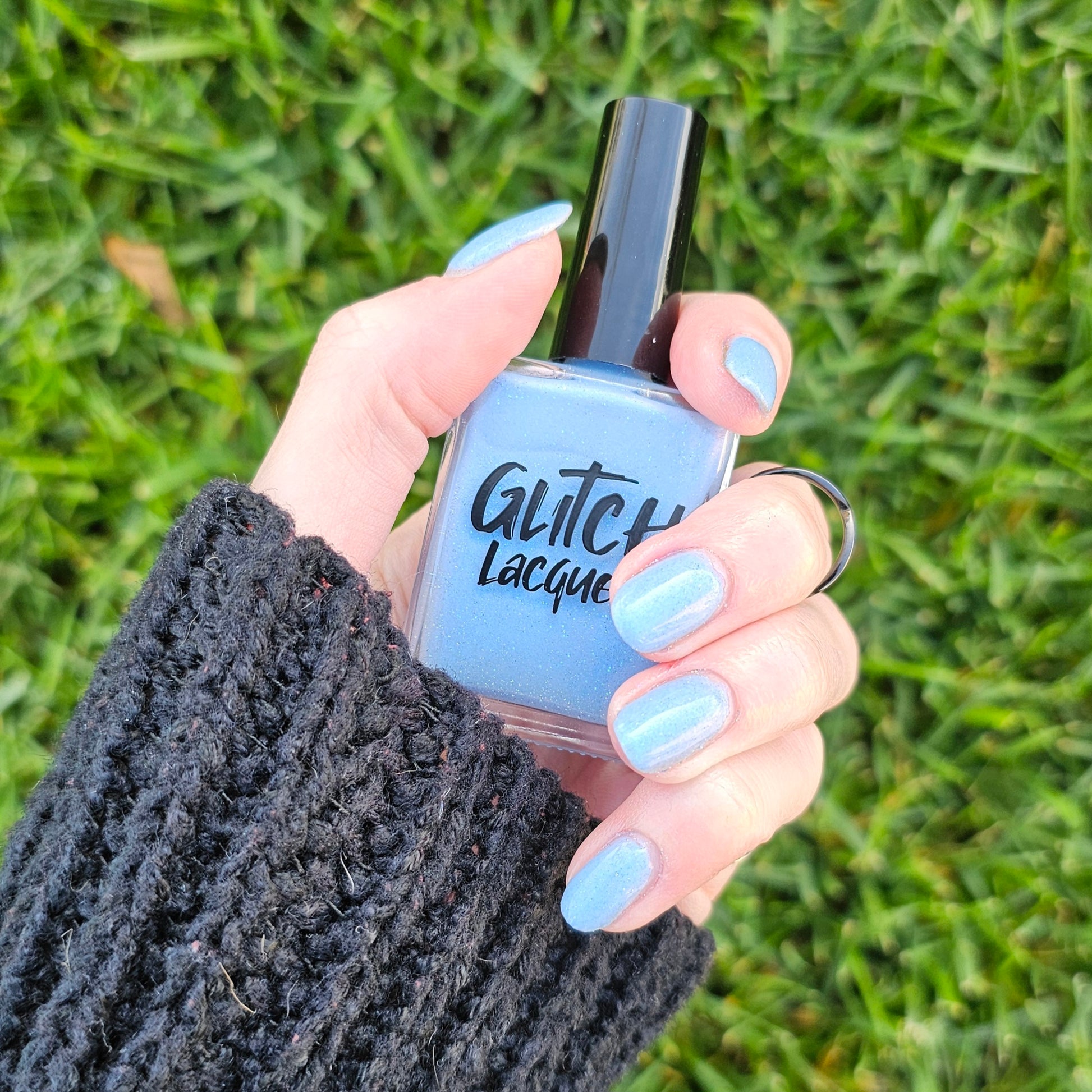 By Any Means Necessary is a light blue, with a hint of grey, polish with a subtle blue to purple sheen, blue-grey reflective glitters, and iridescent blue-green glitters. Due to the nature of the glitters, it is recommended to use a smoothing top coat.
