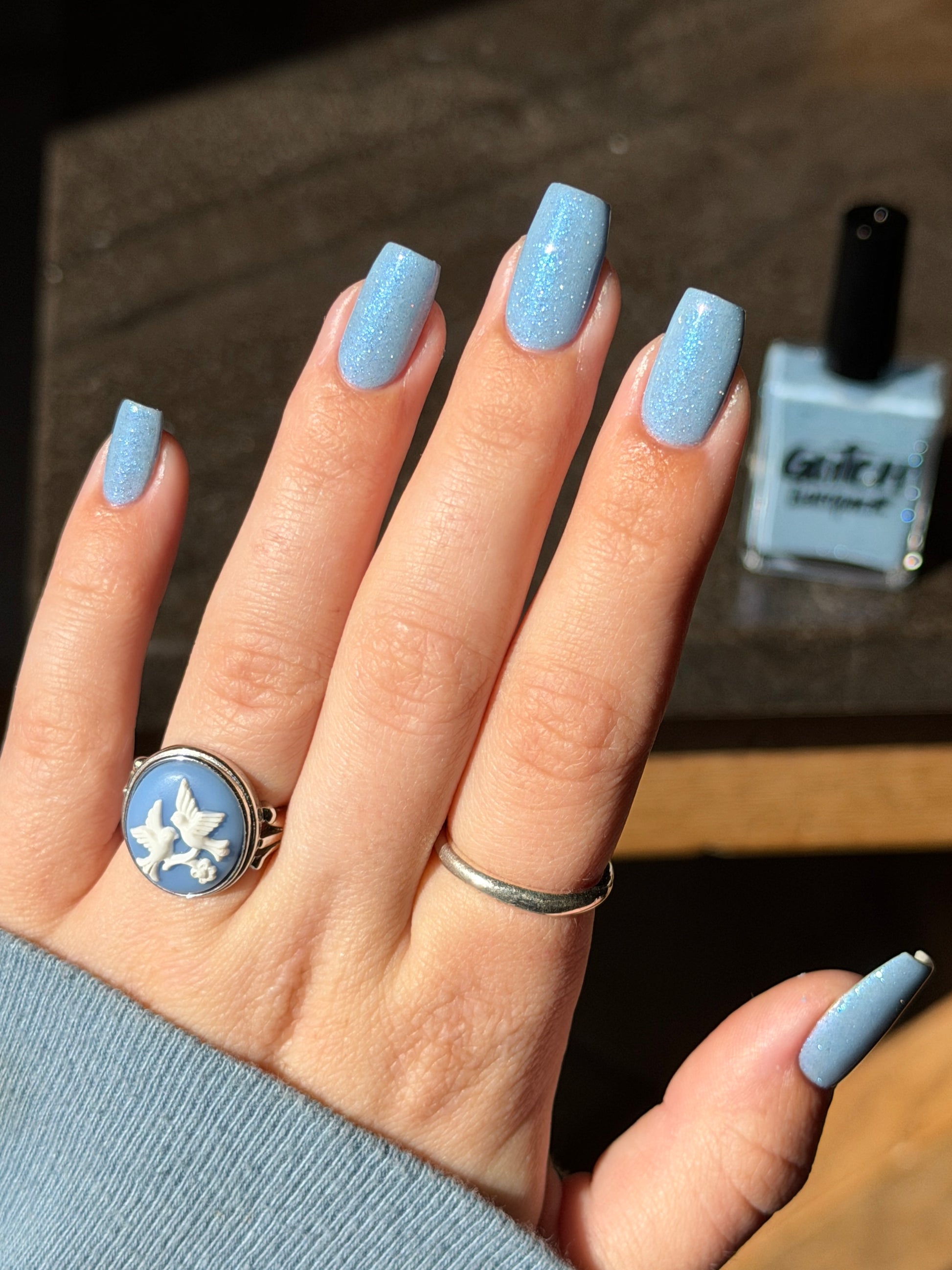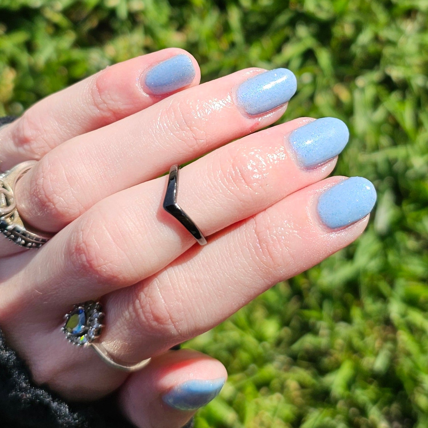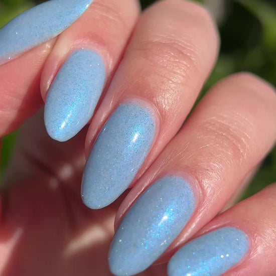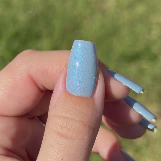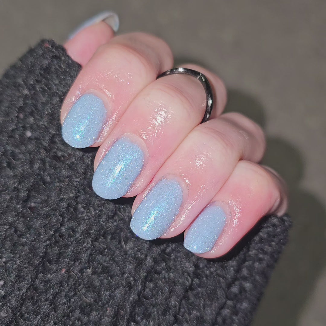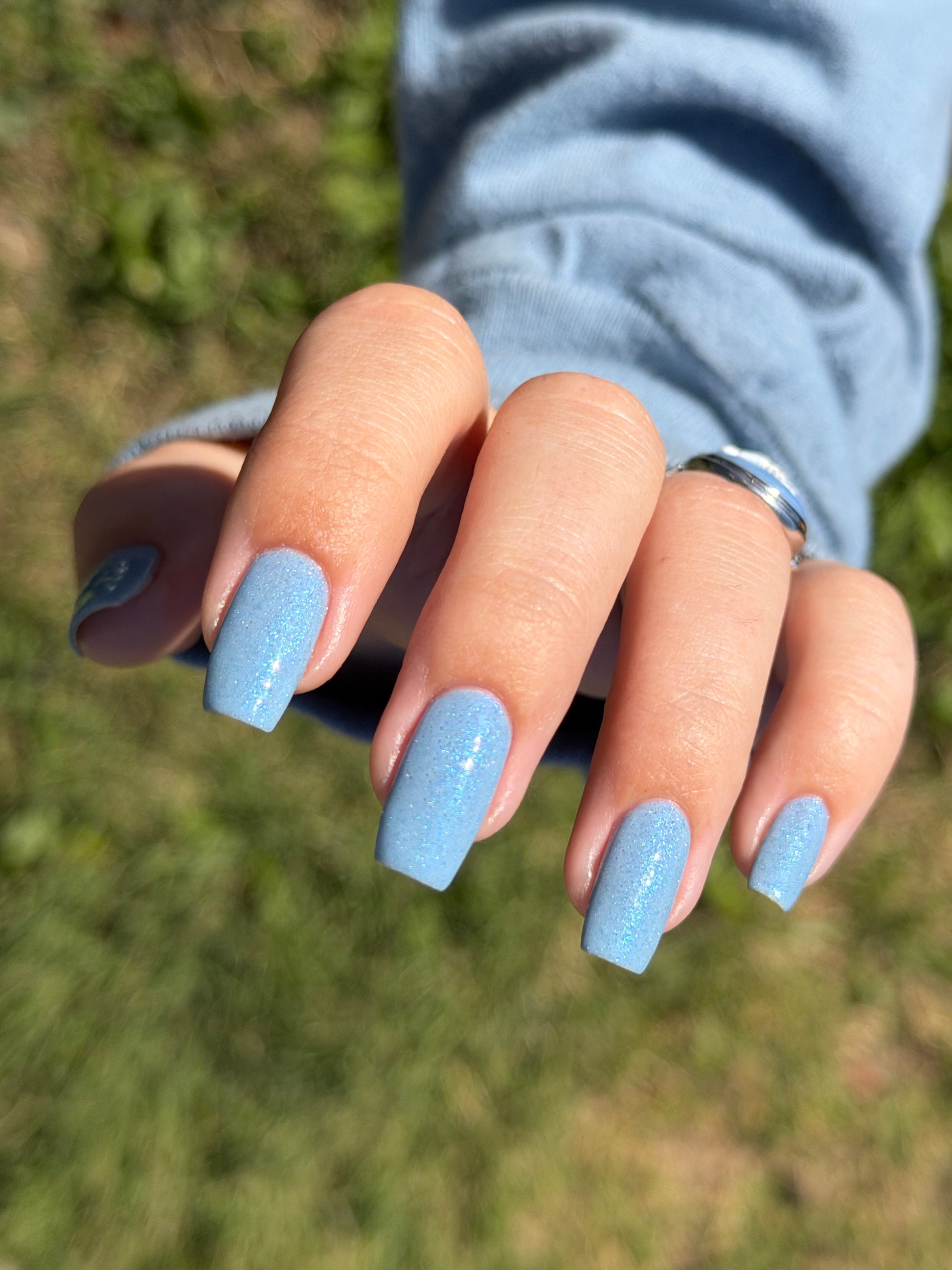 By Any Means Necessary is a light blue, with a hint of grey, polish with a subtle blue to purple sheen, blue-grey reflective glitters, and iridescent blue-green glitters. Due to the nature of the glitters, it is recommended to use a smoothing top coat.