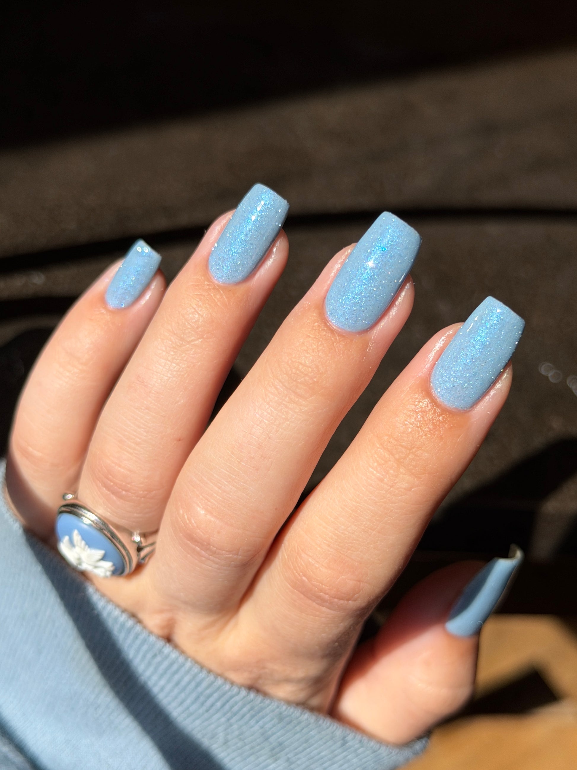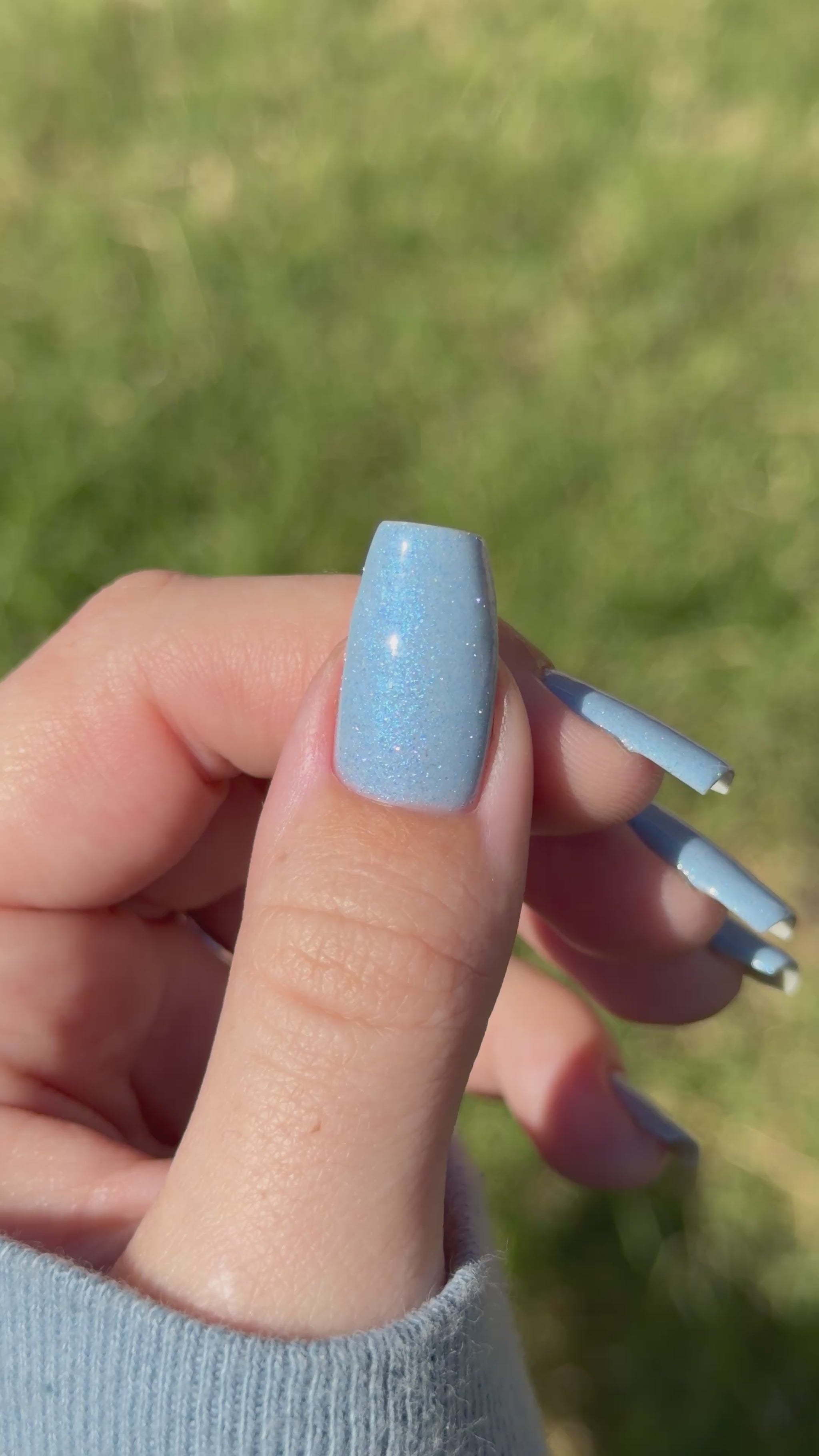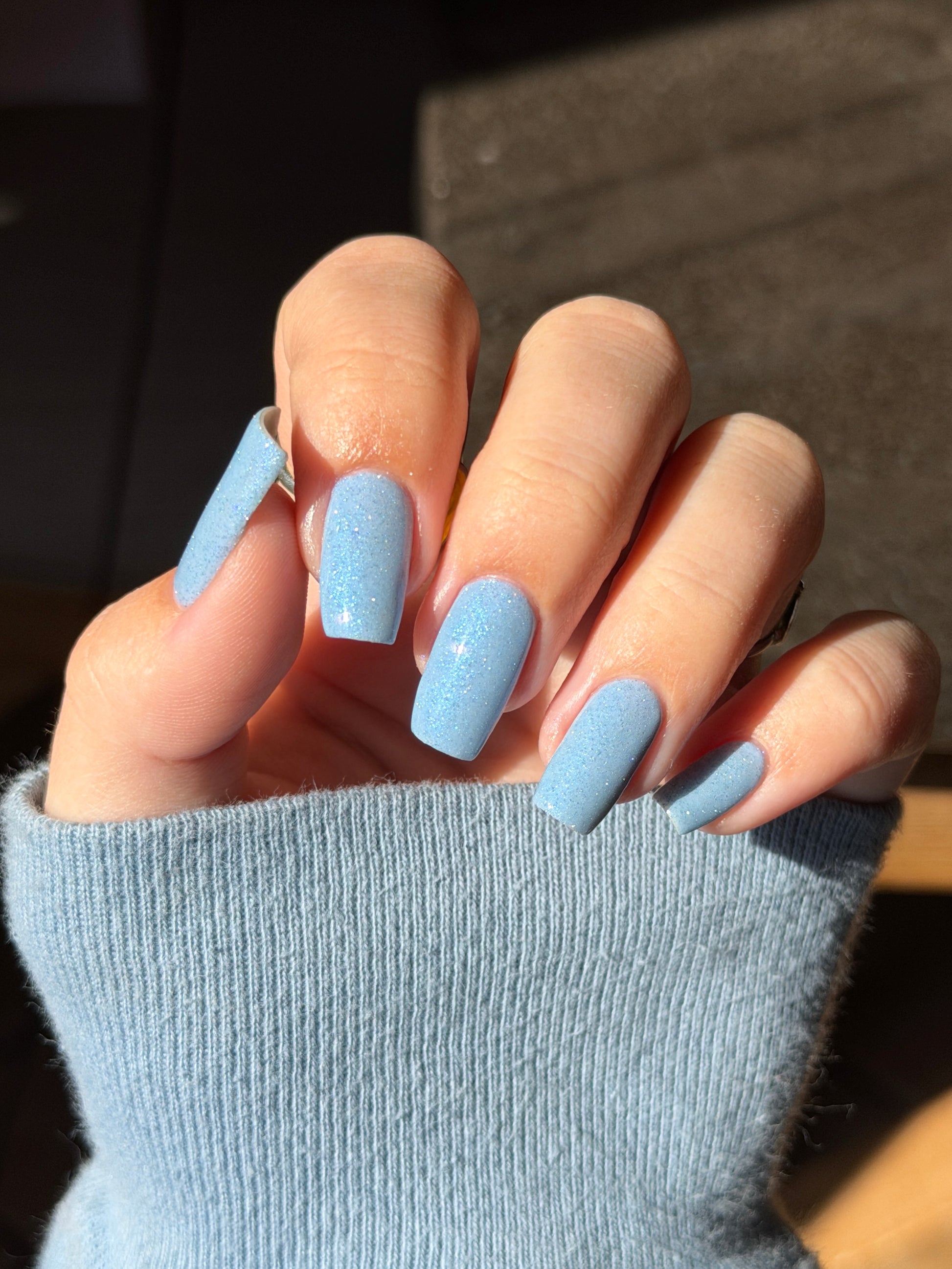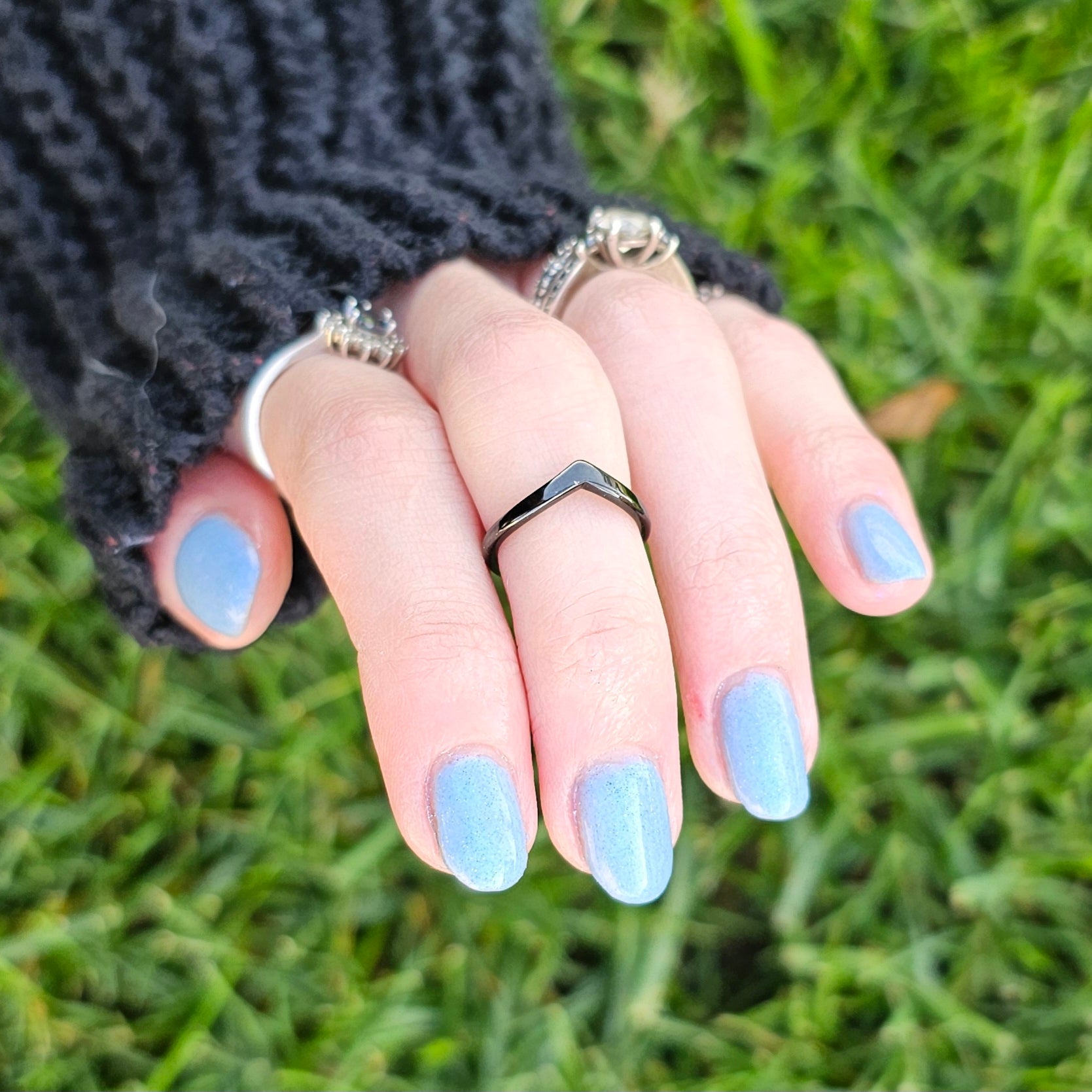 By Any Means Necessary is a light blue, with a hint of grey, polish with a subtle blue to purple sheen, blue-grey reflective glitters, and iridescent blue-green glitters. Due to the nature of the glitters, it is recommended to use a smoothing top coat.