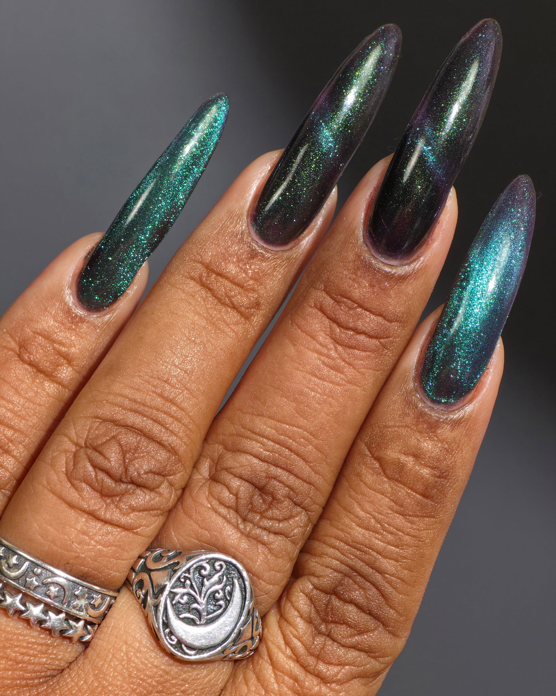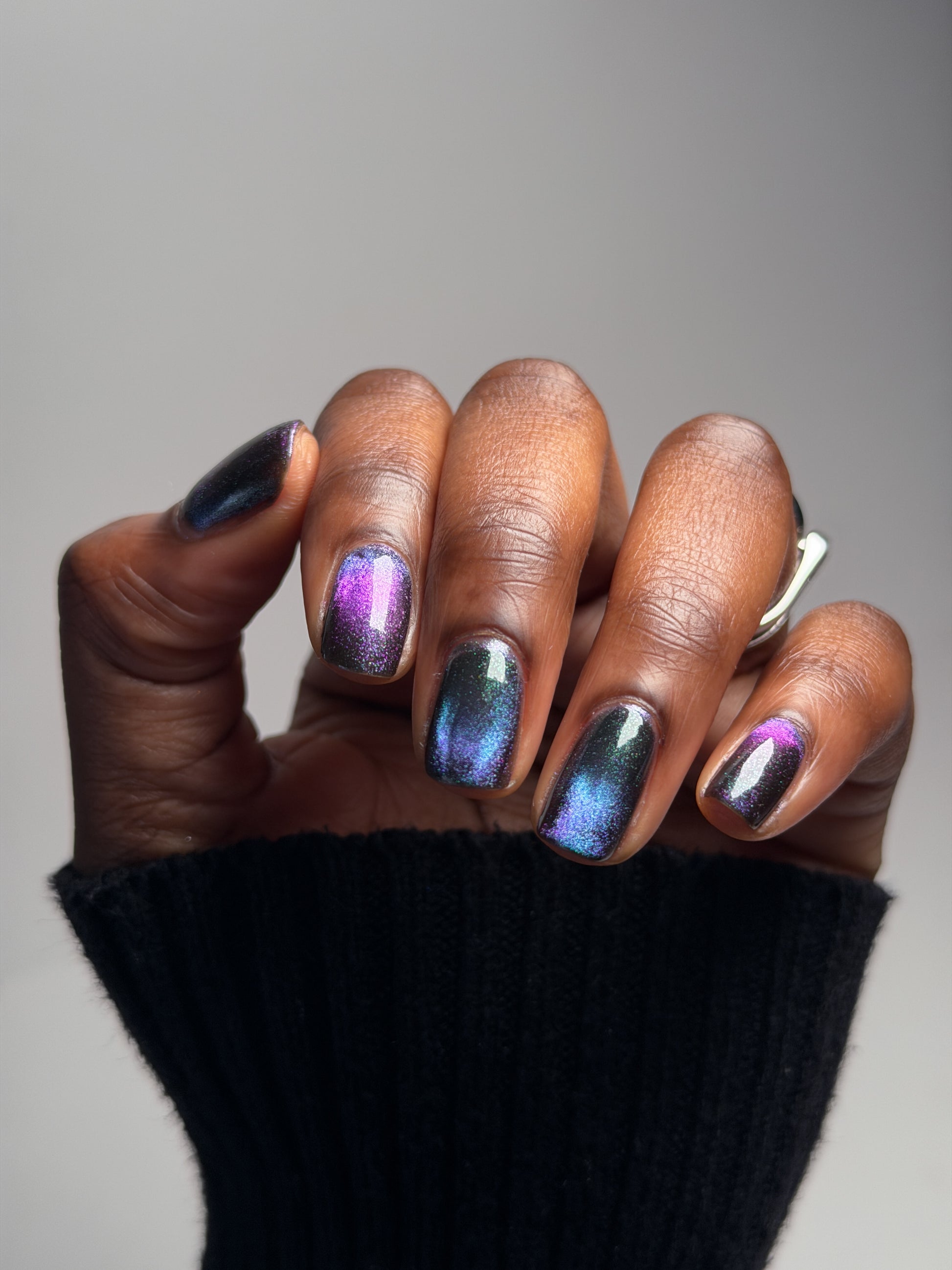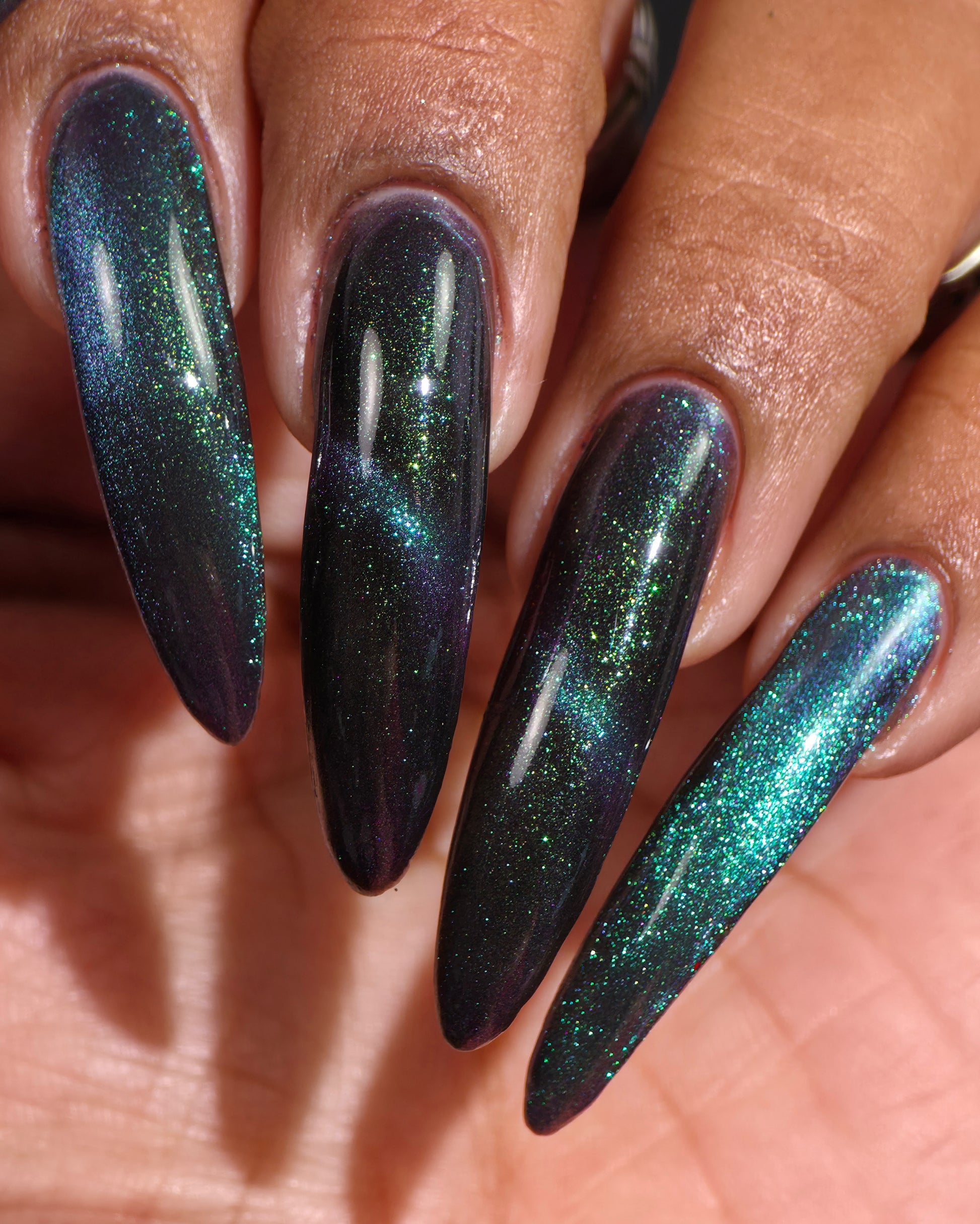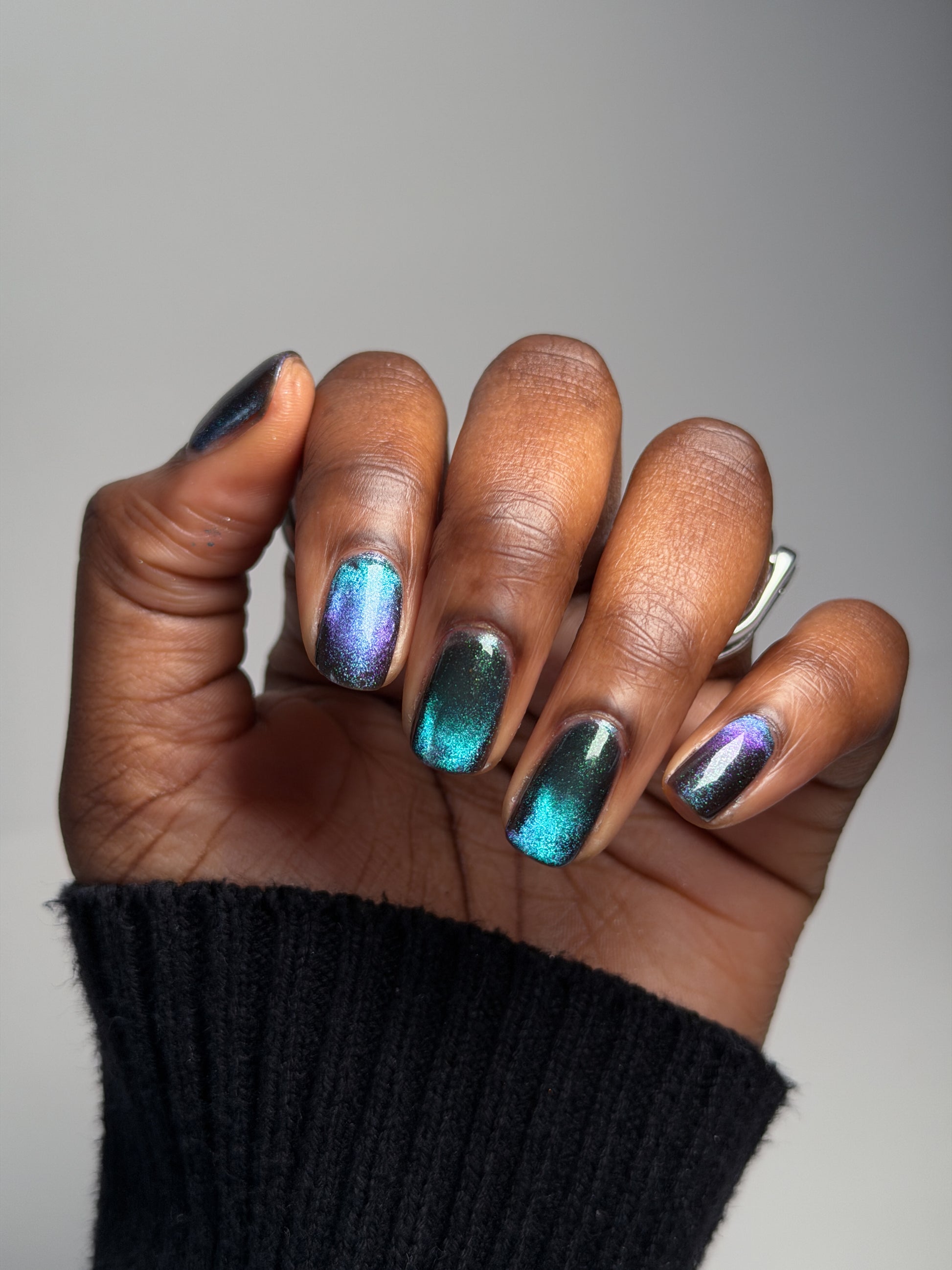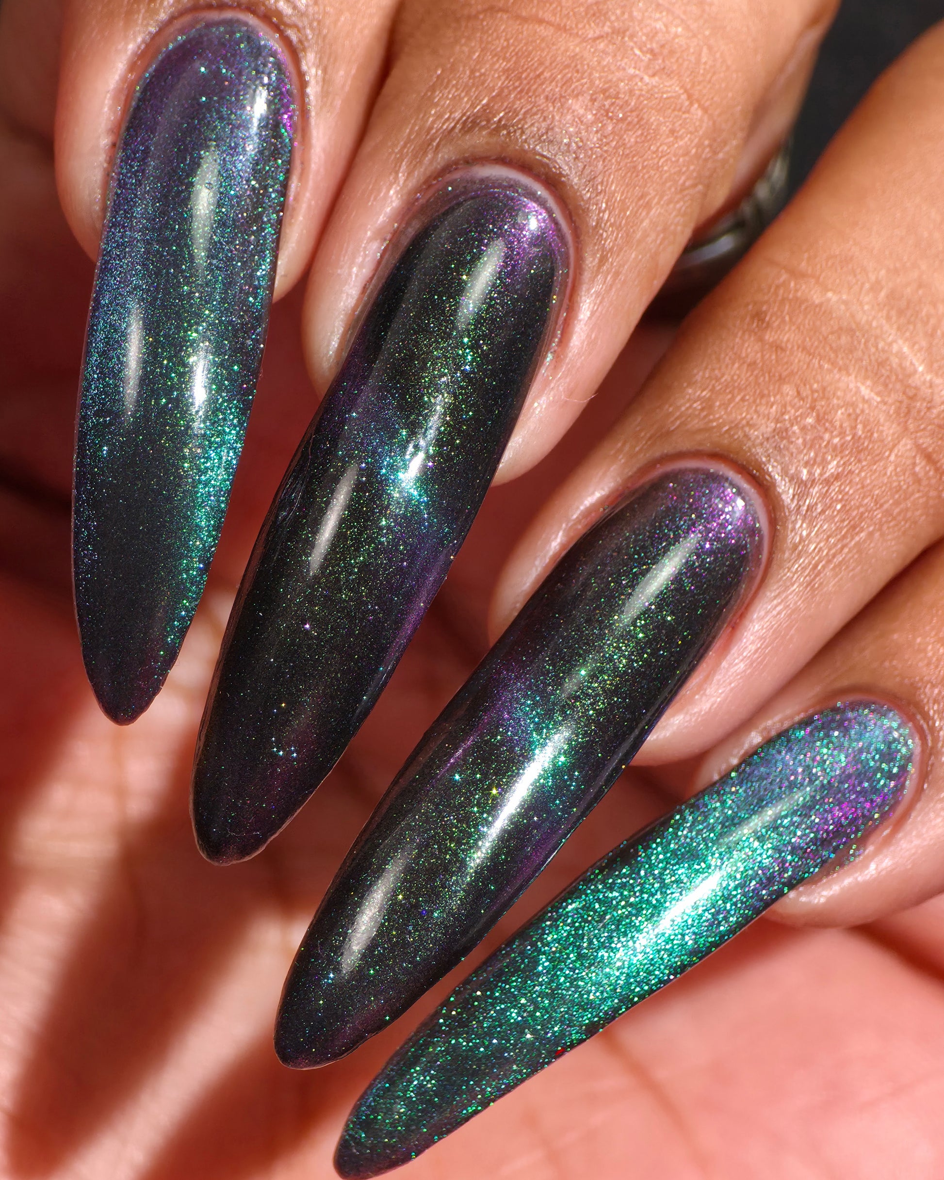 Celestial Bodies is a black base with green sparkles and a blue, purple, & red multichrome magnetic pigment.
