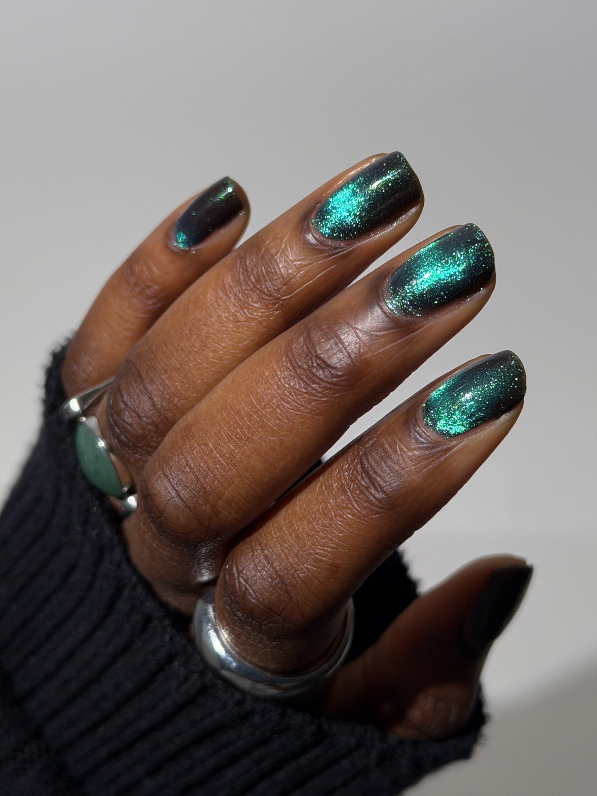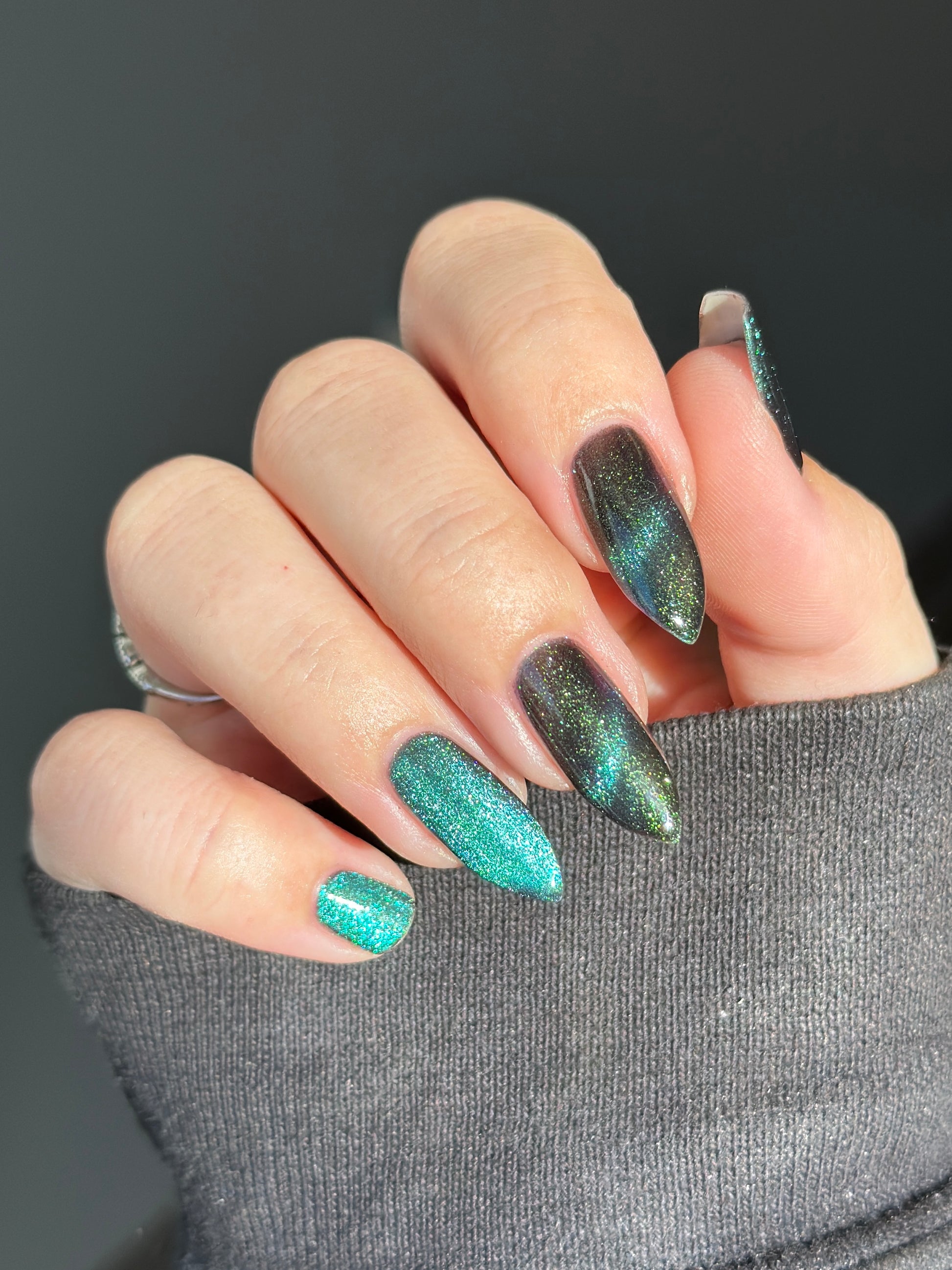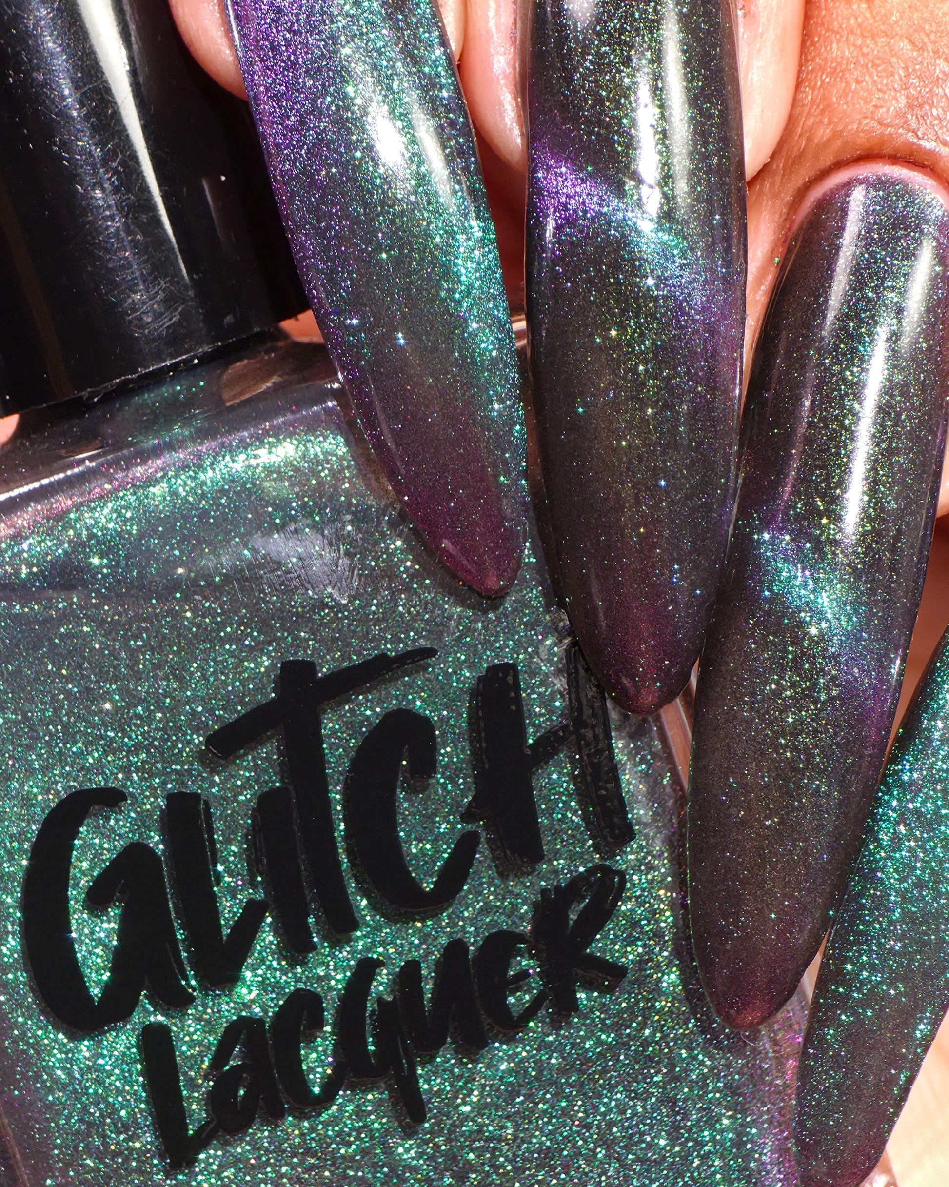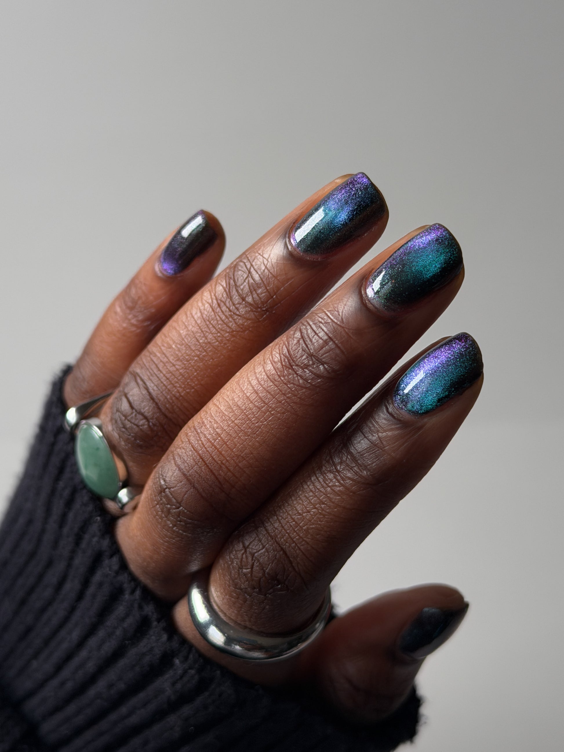 Celestial Bodies is a black base with green sparkles and a blue, purple, & red multichrome magnetic pigment.
