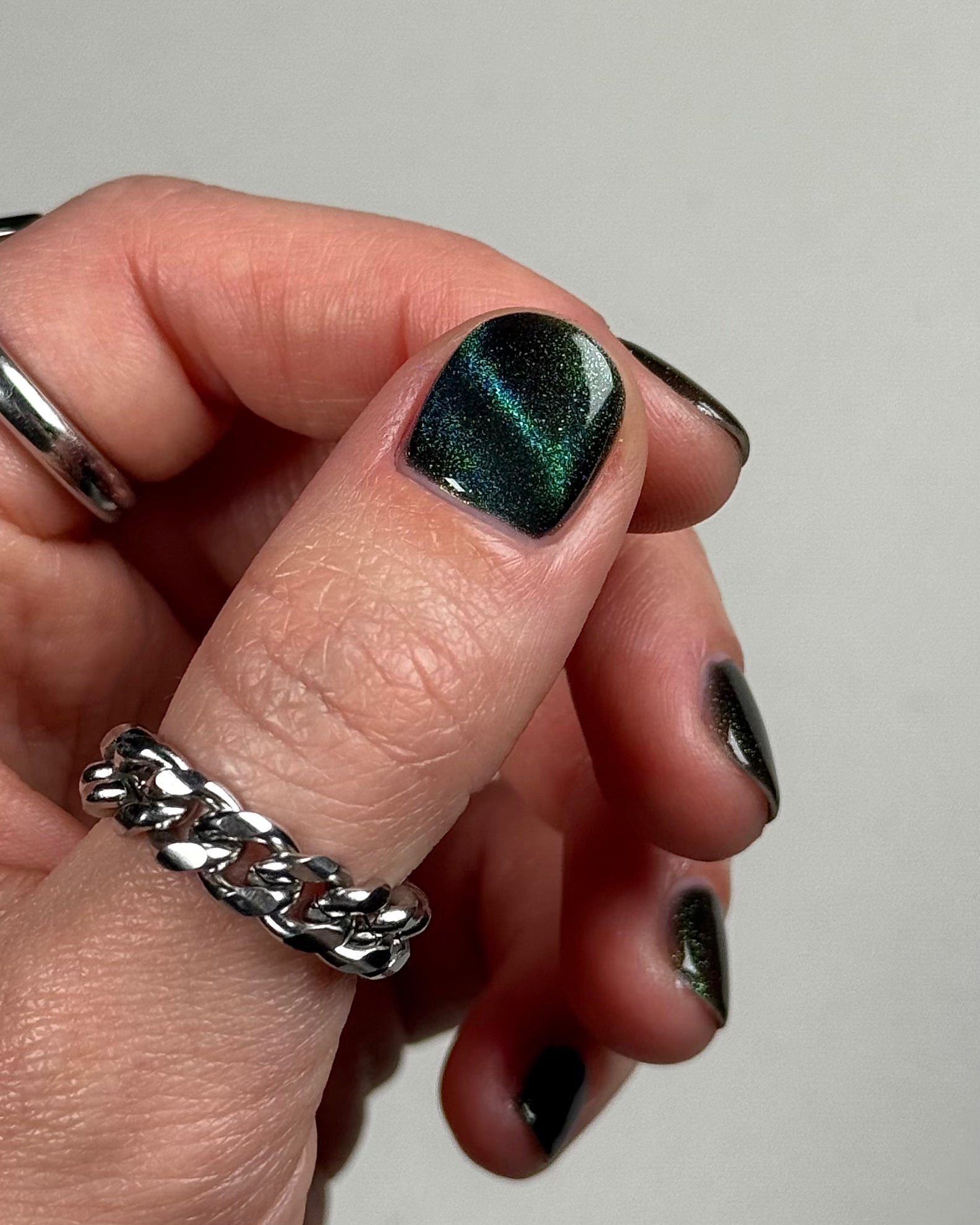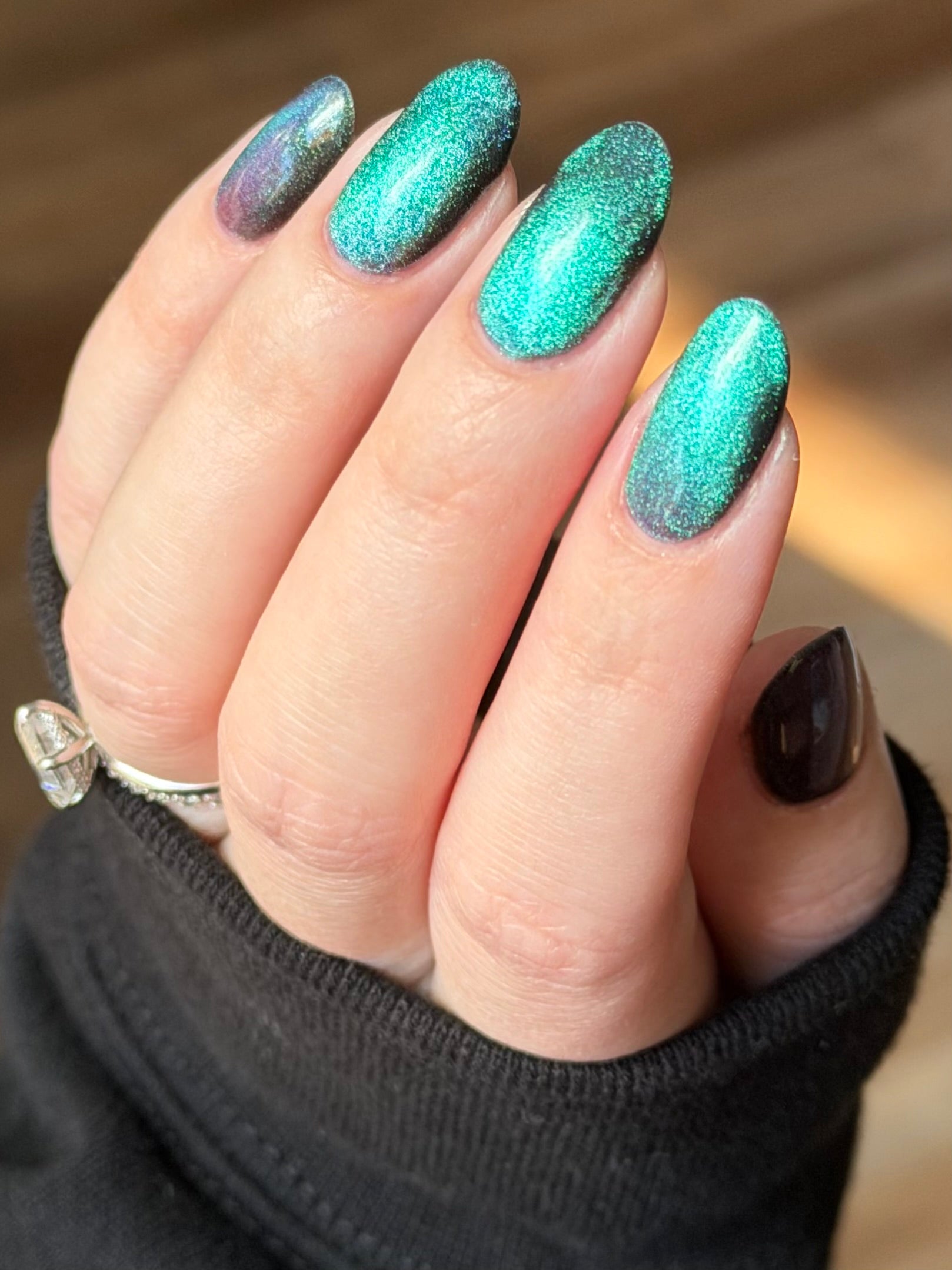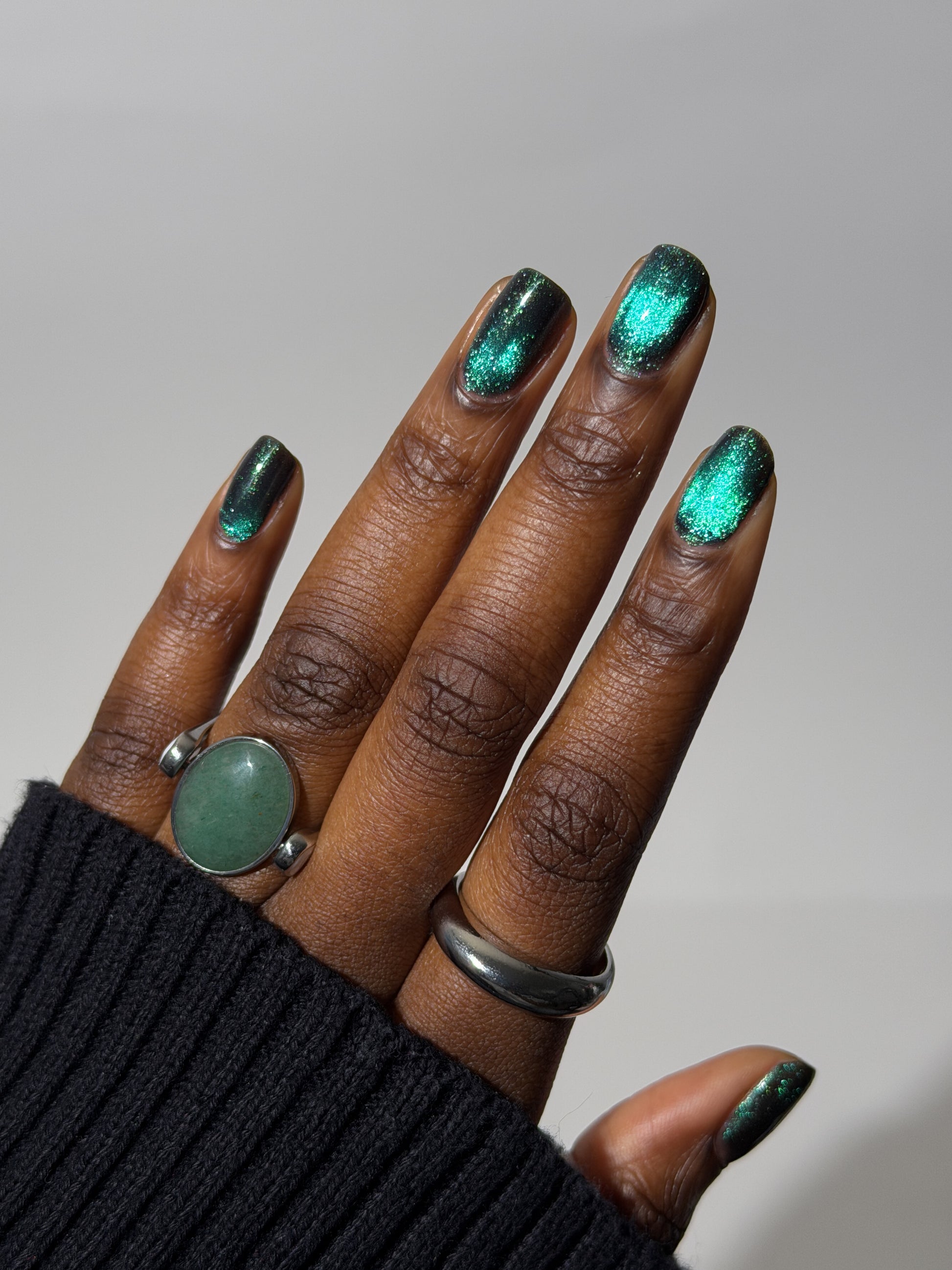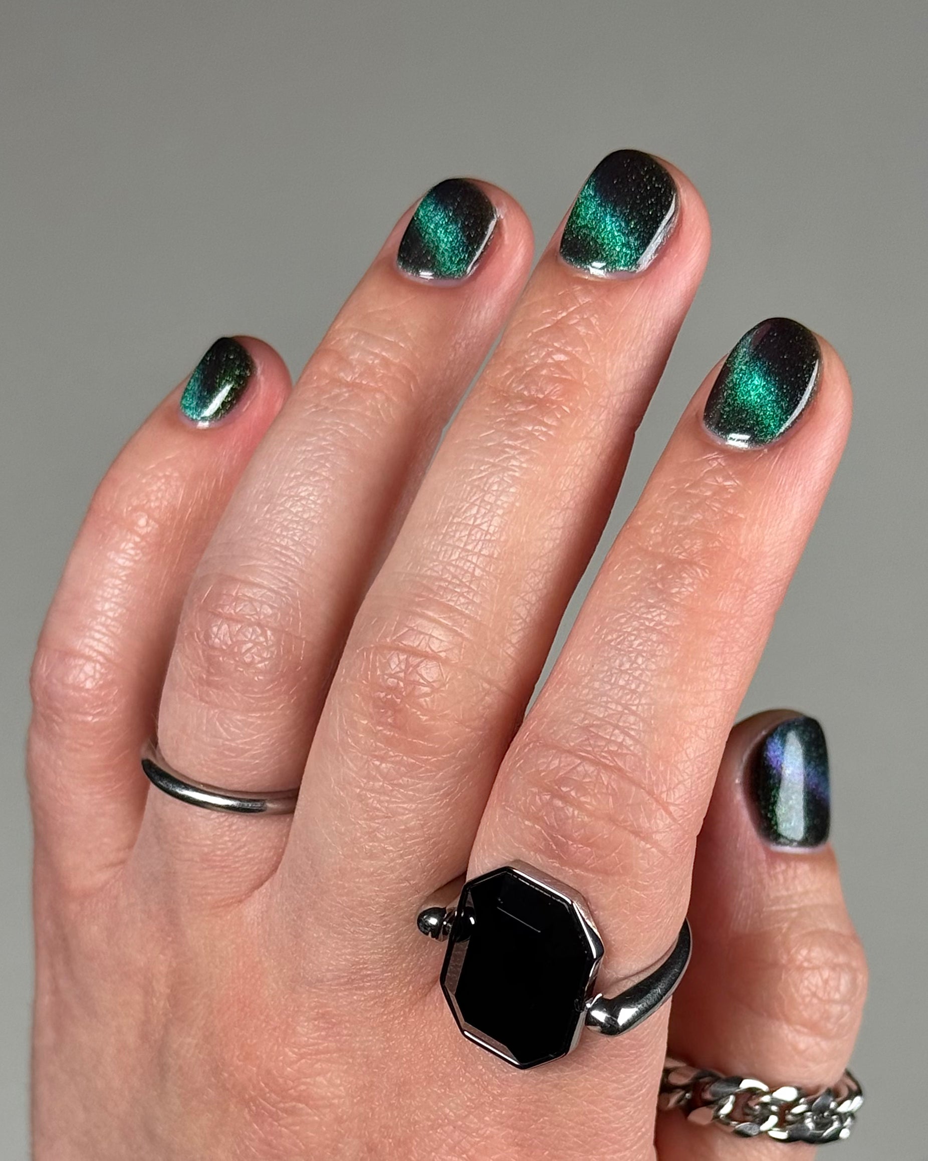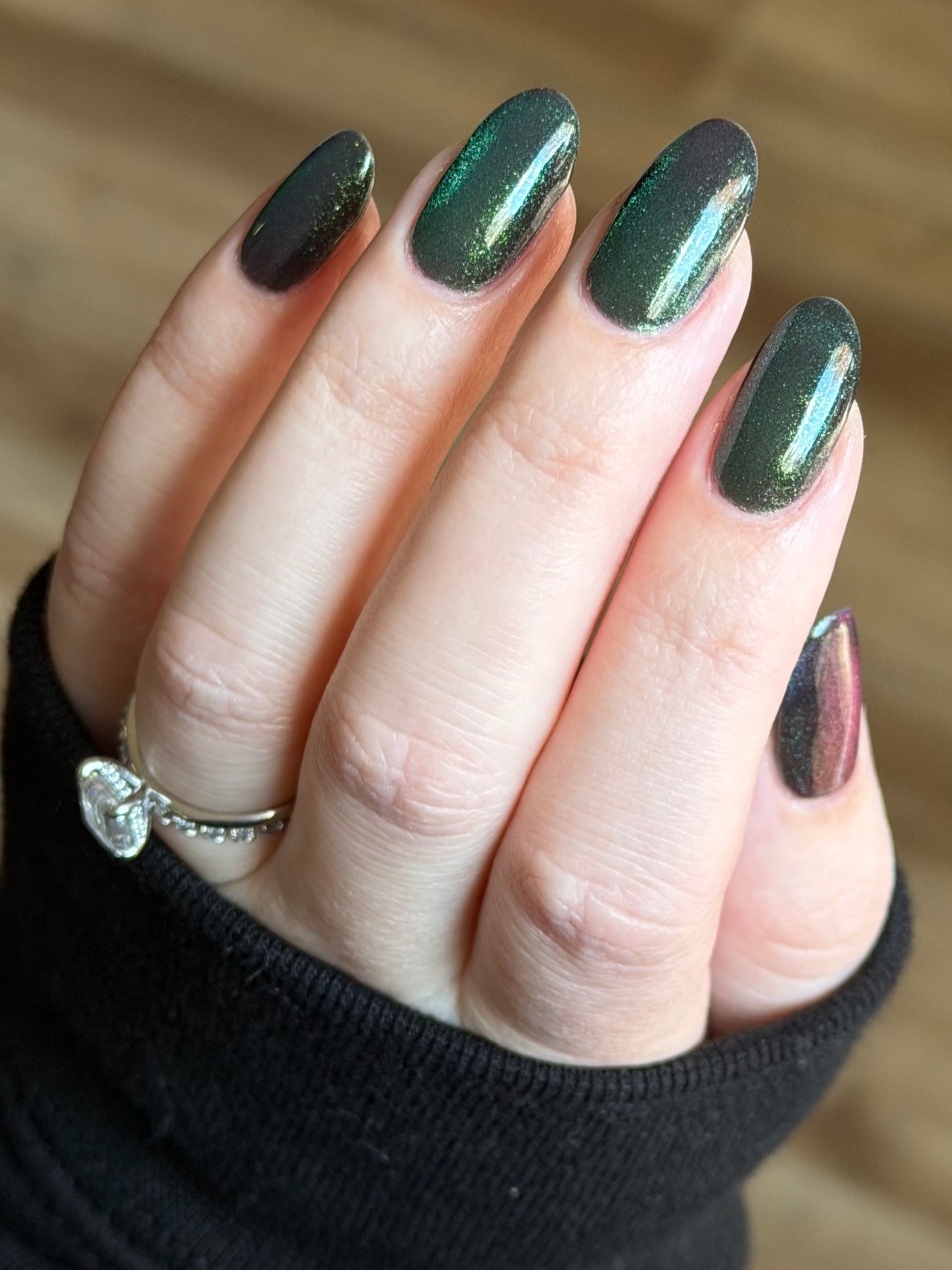 Celestial Bodies is a black base with green sparkles and a blue, purple, & red multichrome magnetic pigment.