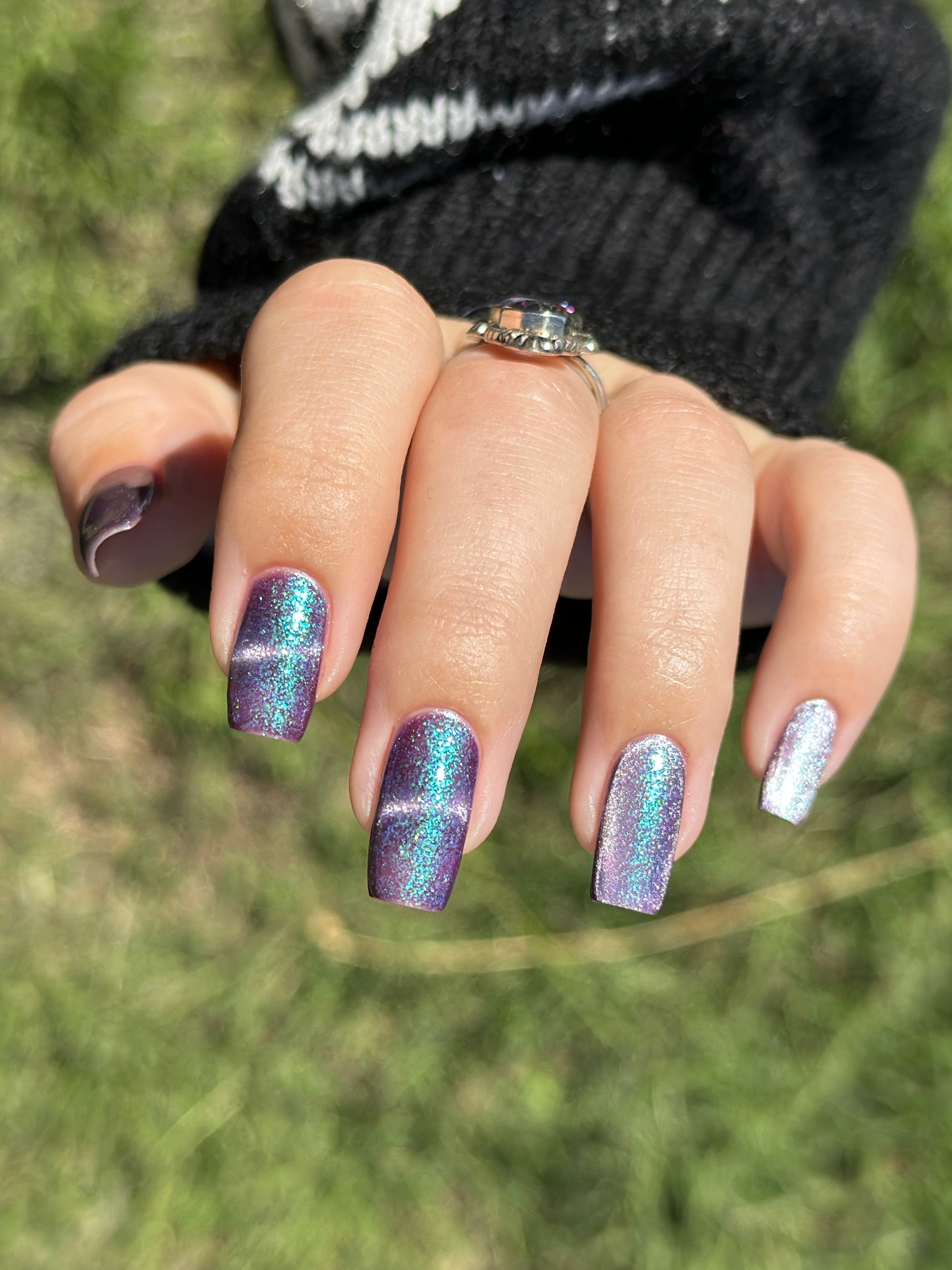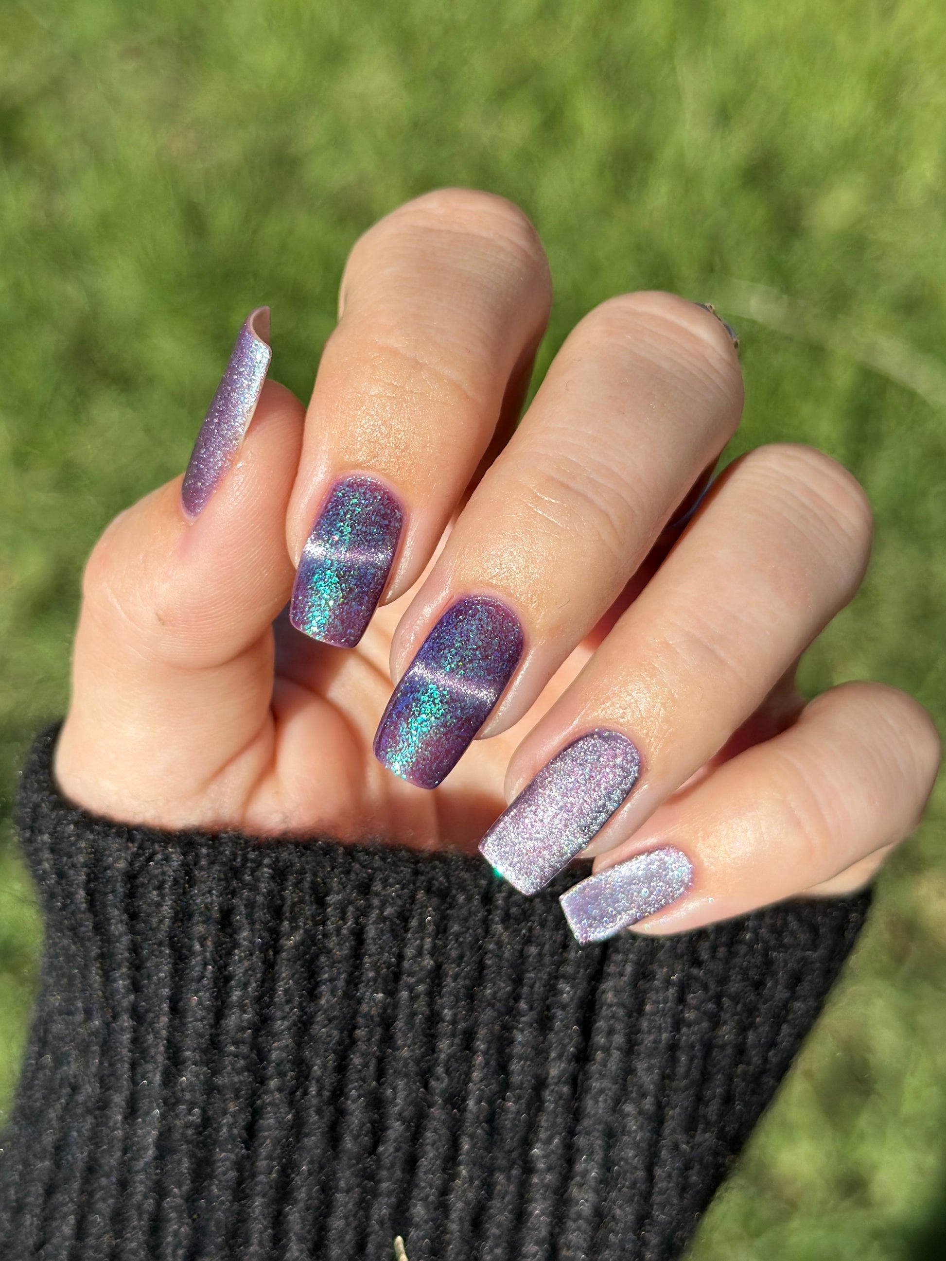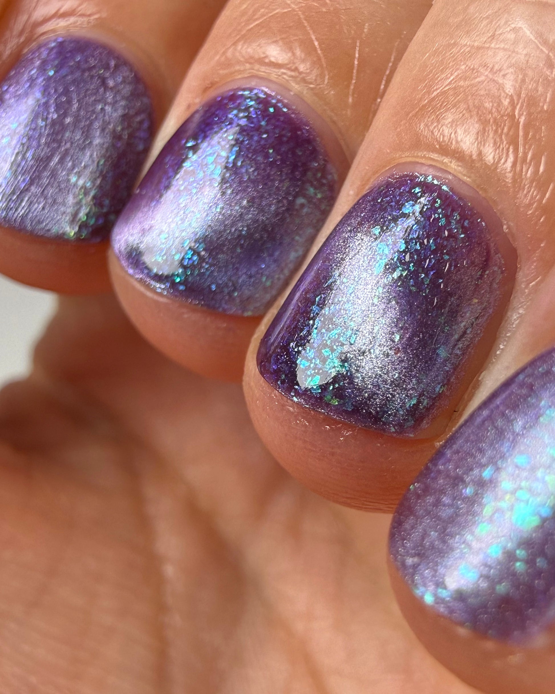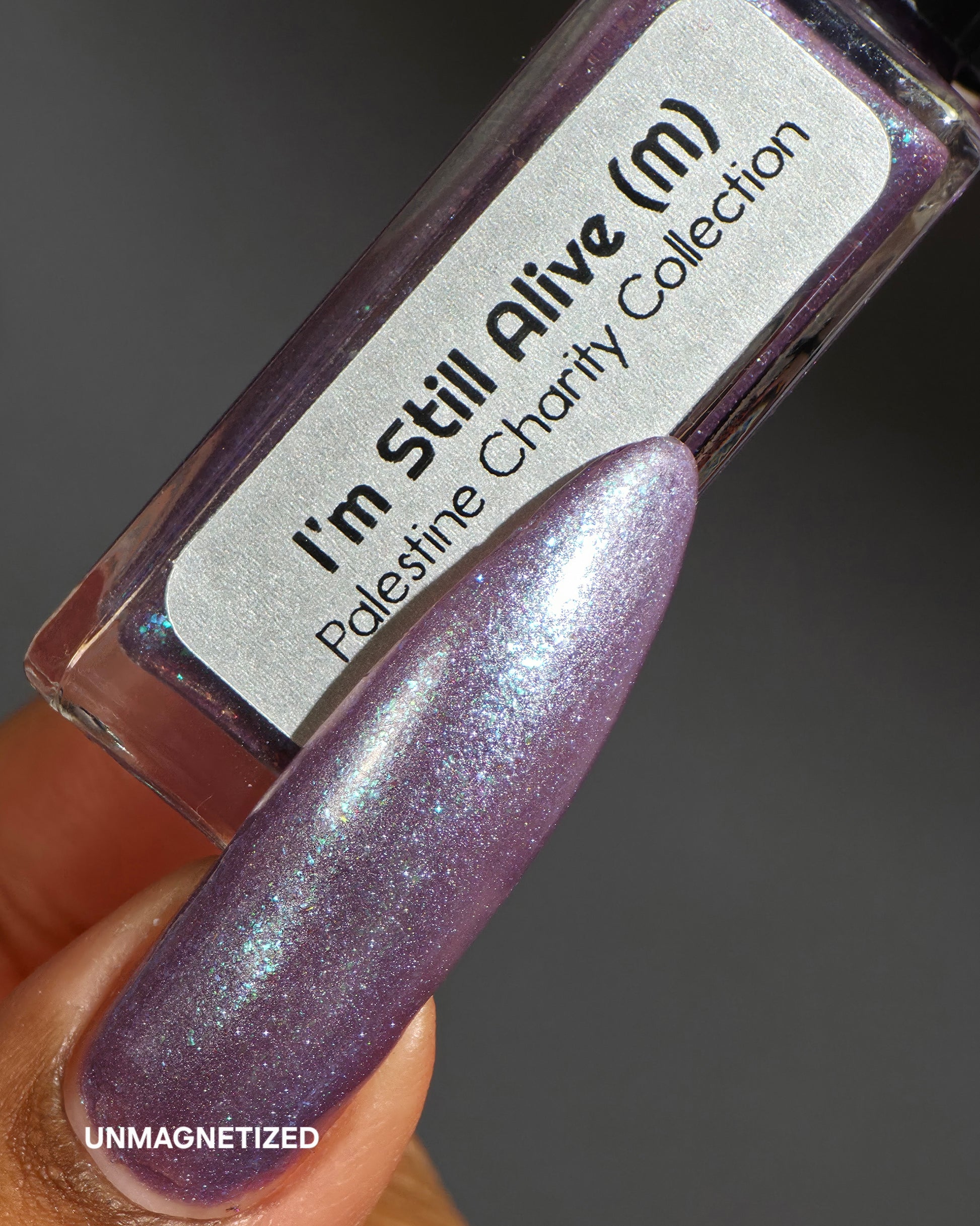 I’m Still Alive has a purple base, micro flakes that shift between teal, blue, and purple, and a prominent silver magnetic pigment.