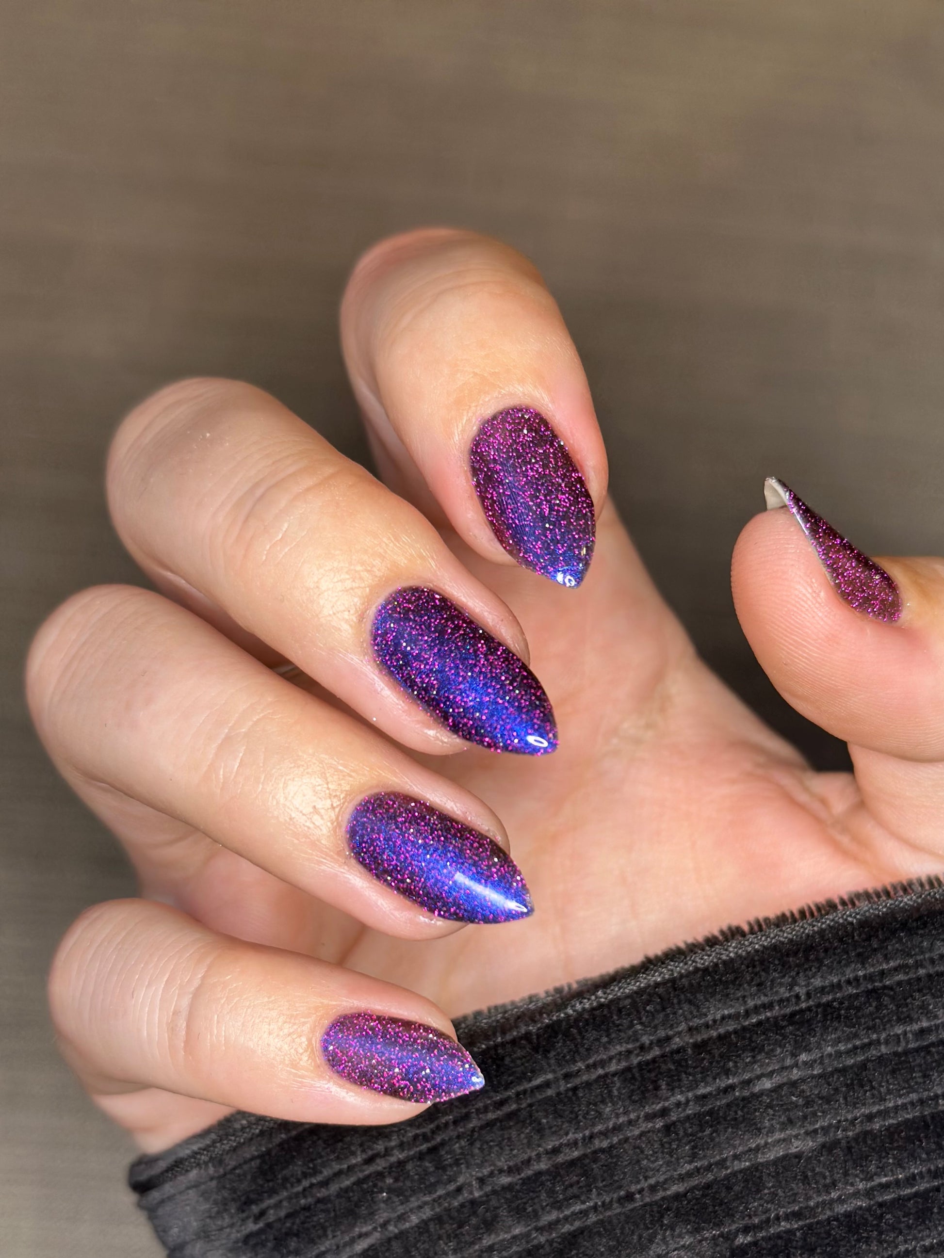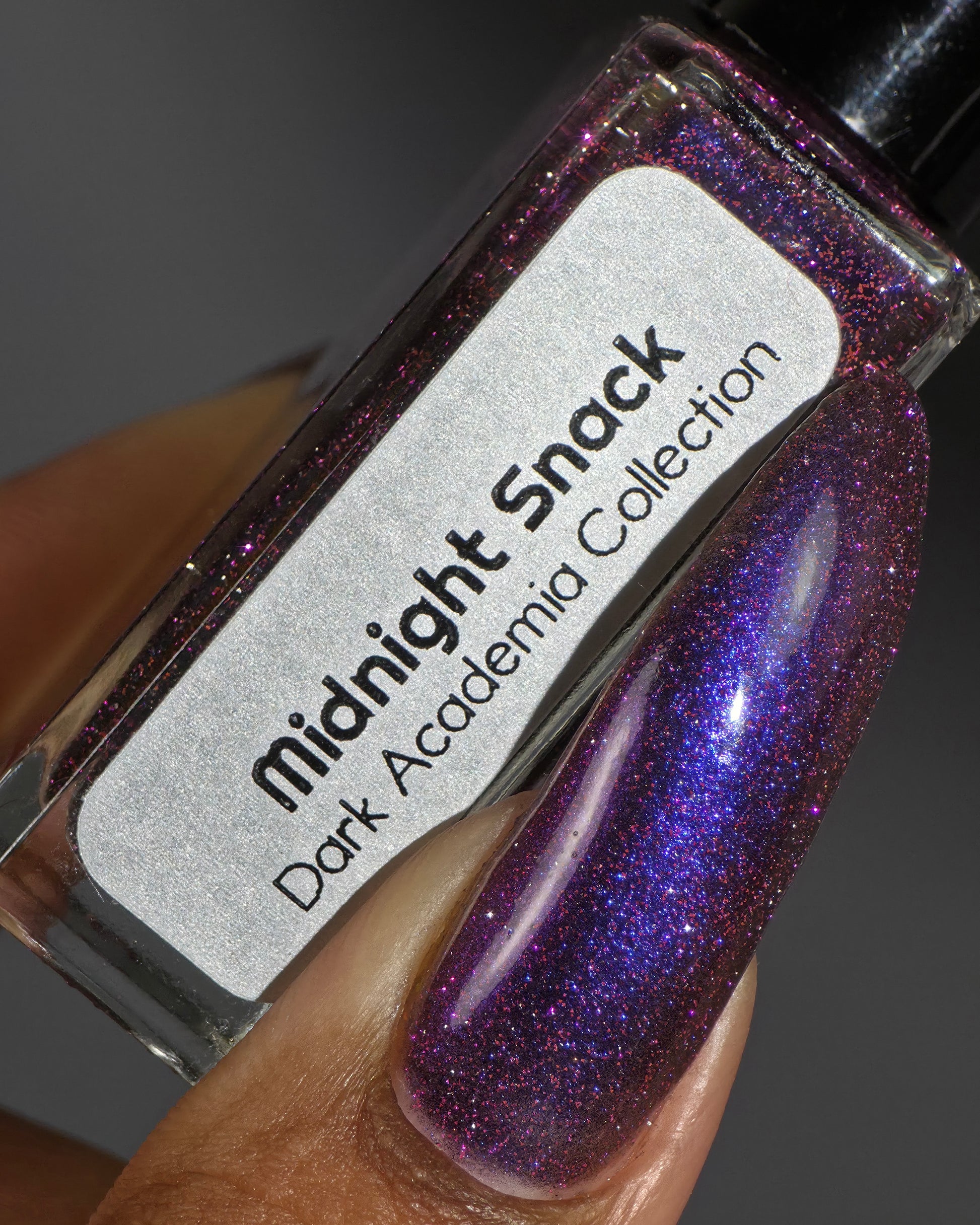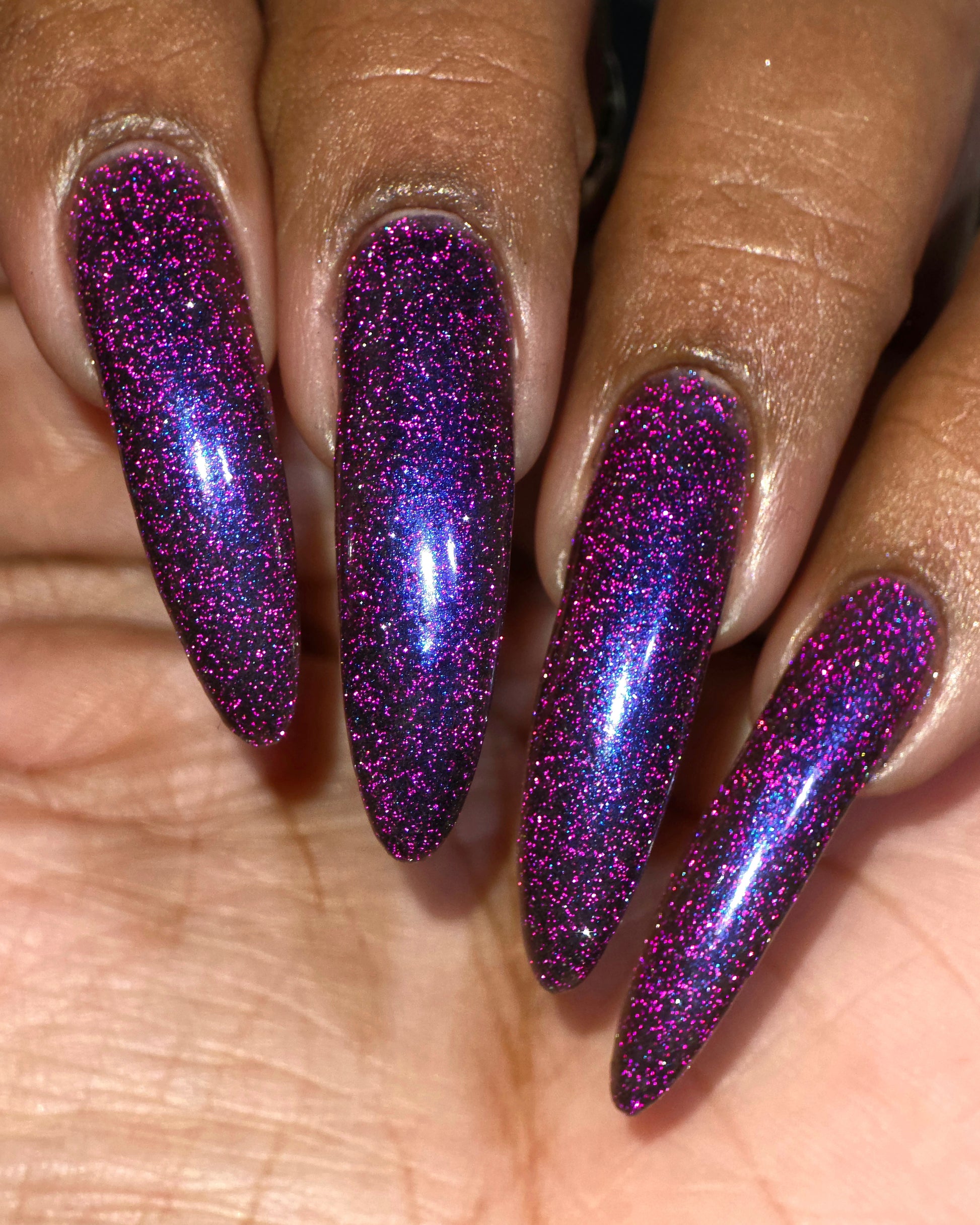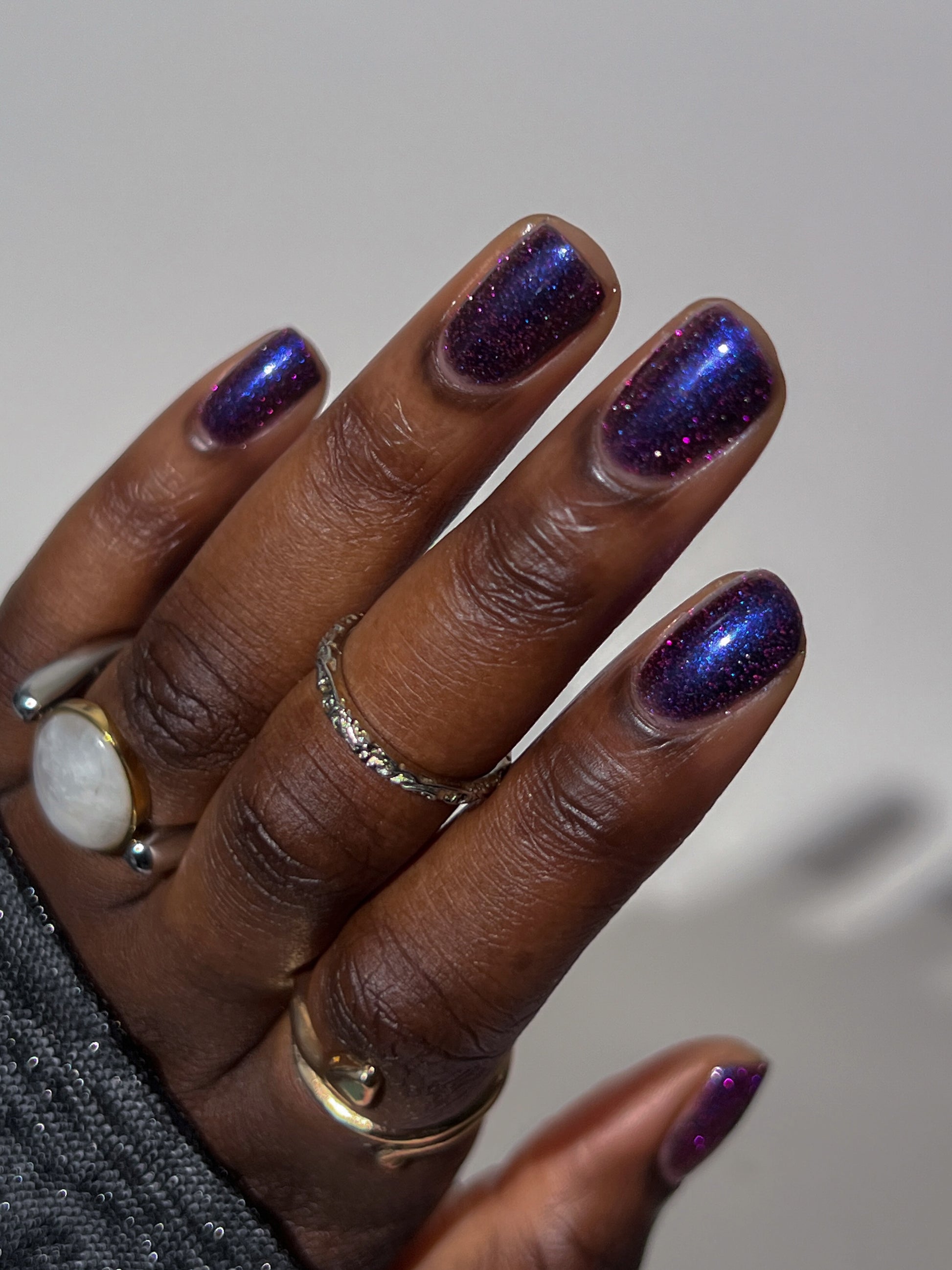 A blue multichrome that shifts to purple, red, and orange, plus pink reflective glitter. This polish is indulgent, just like a midnight snack should be.
