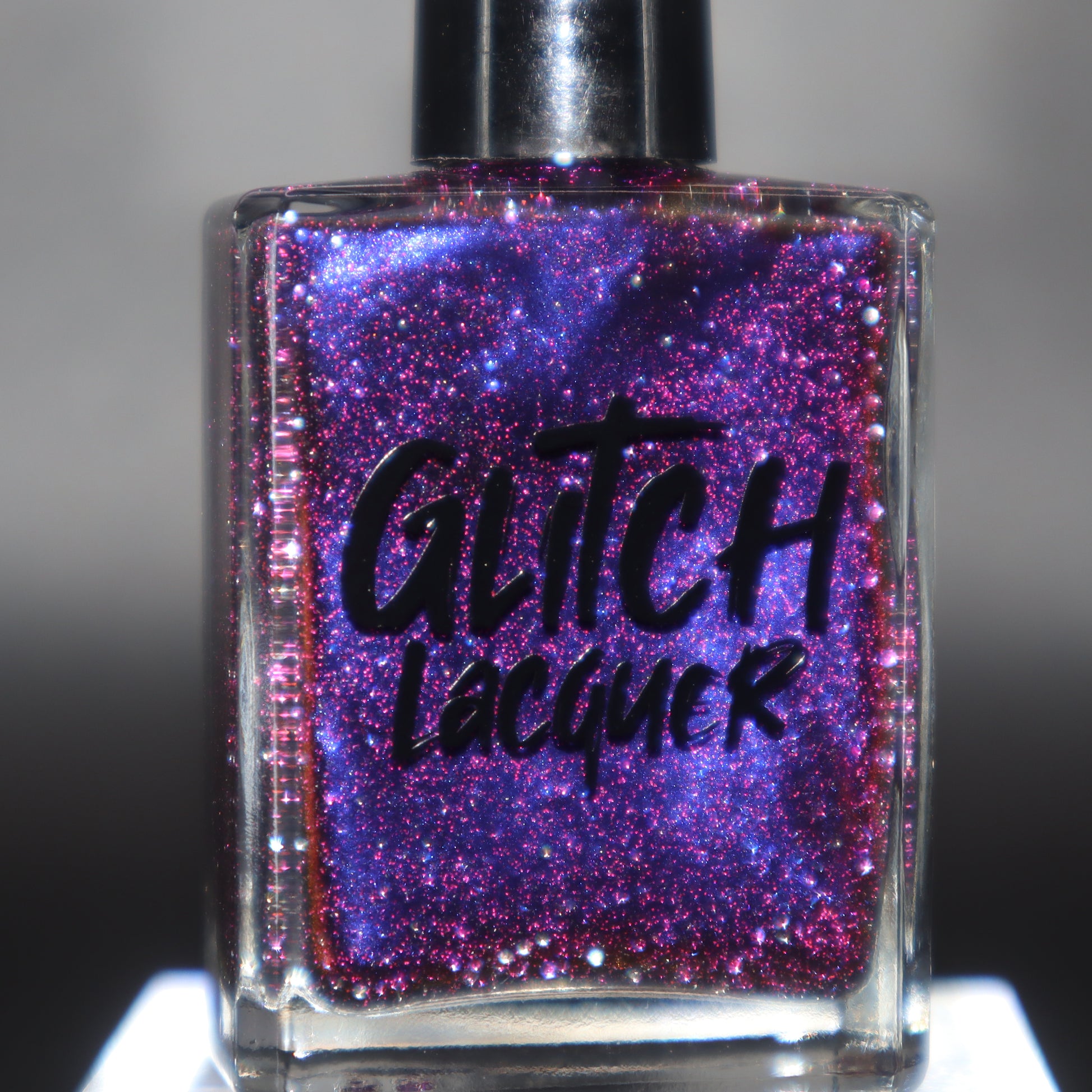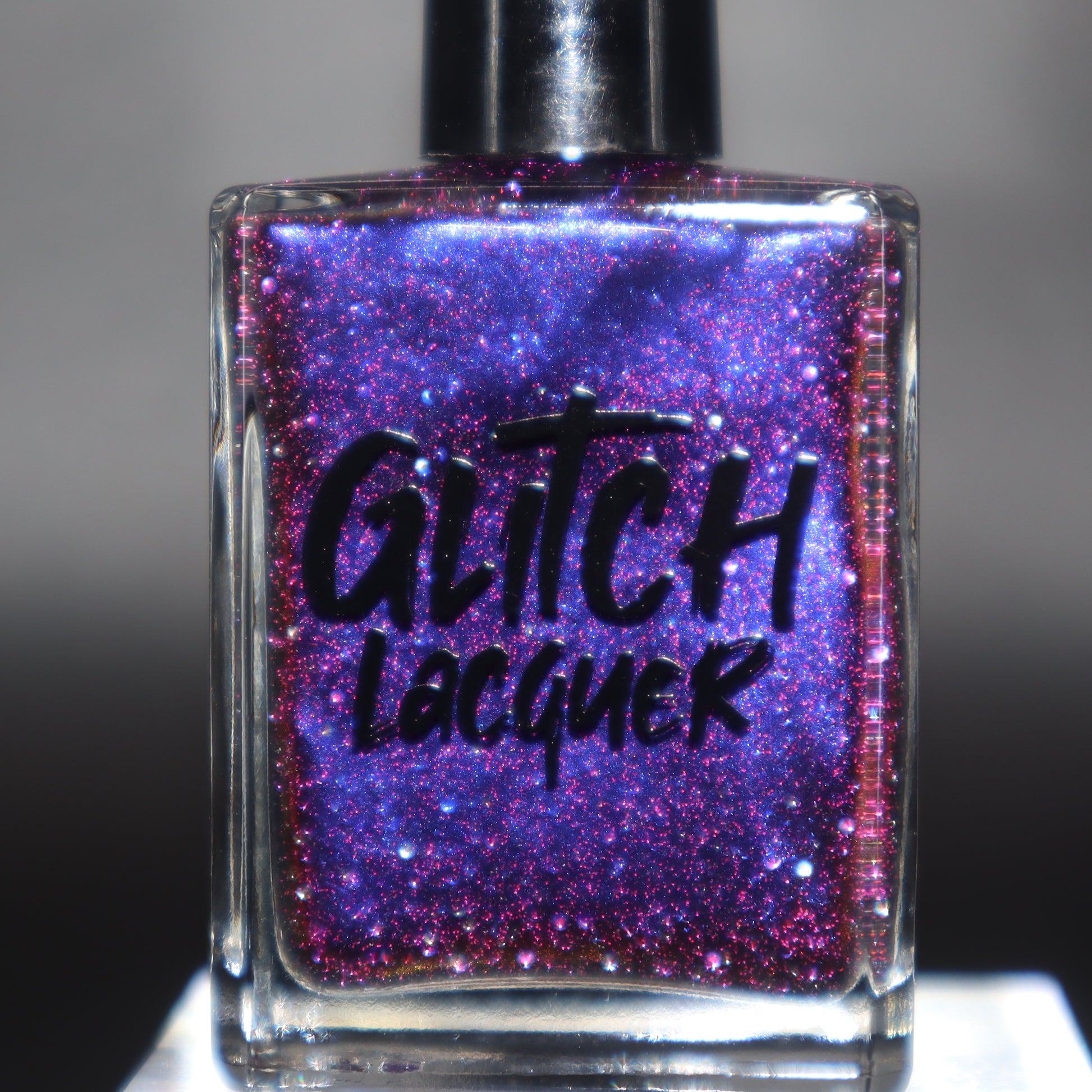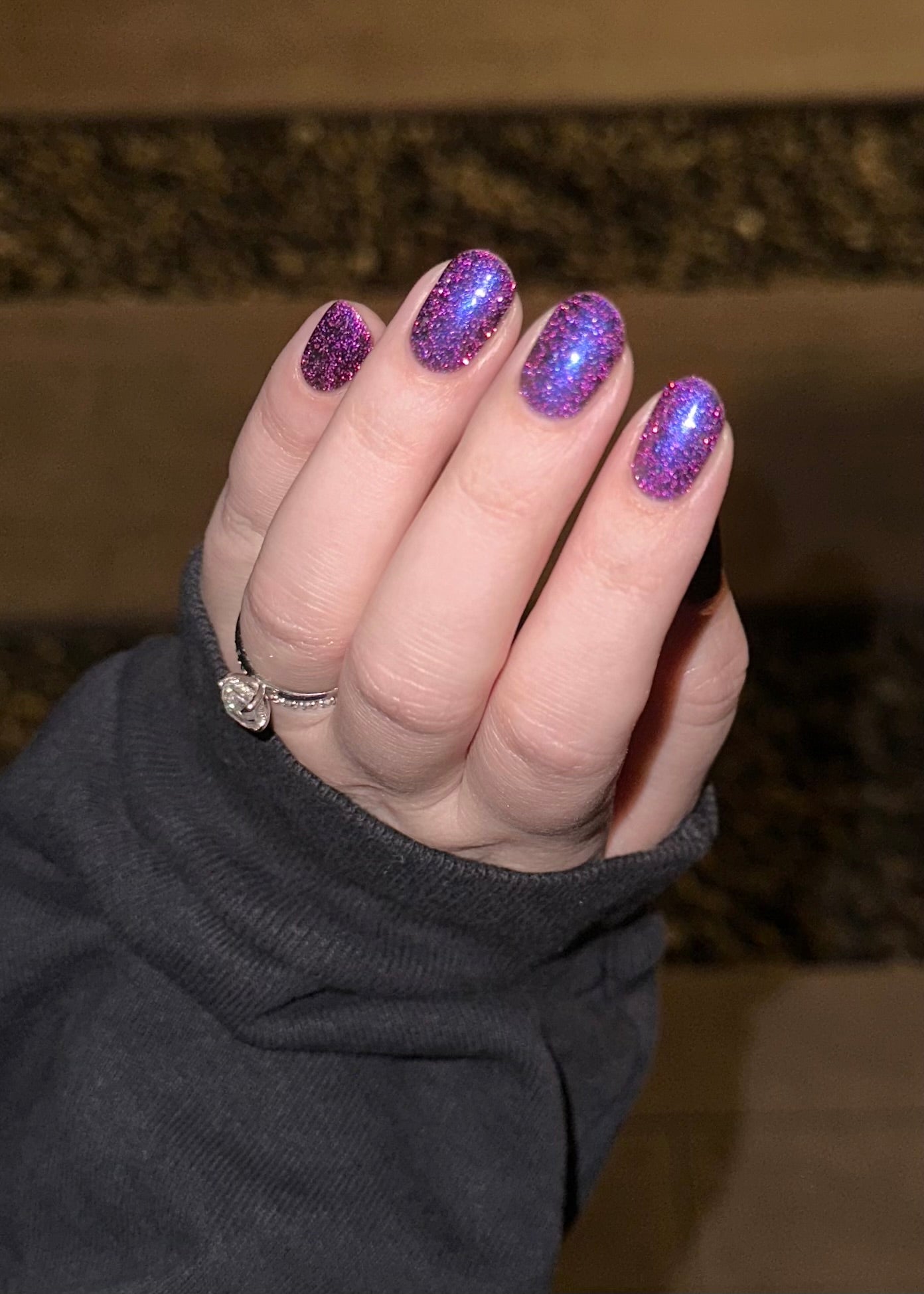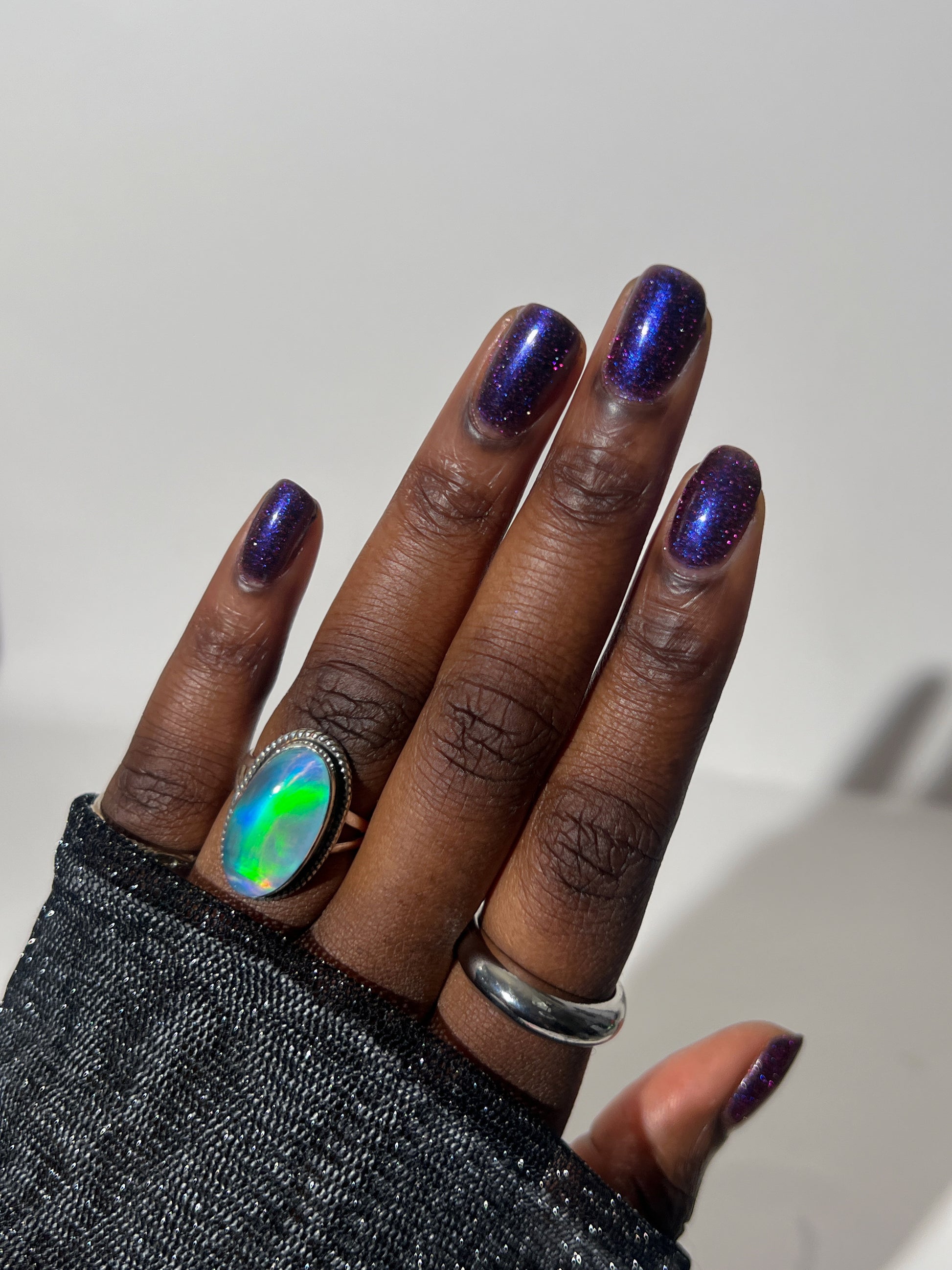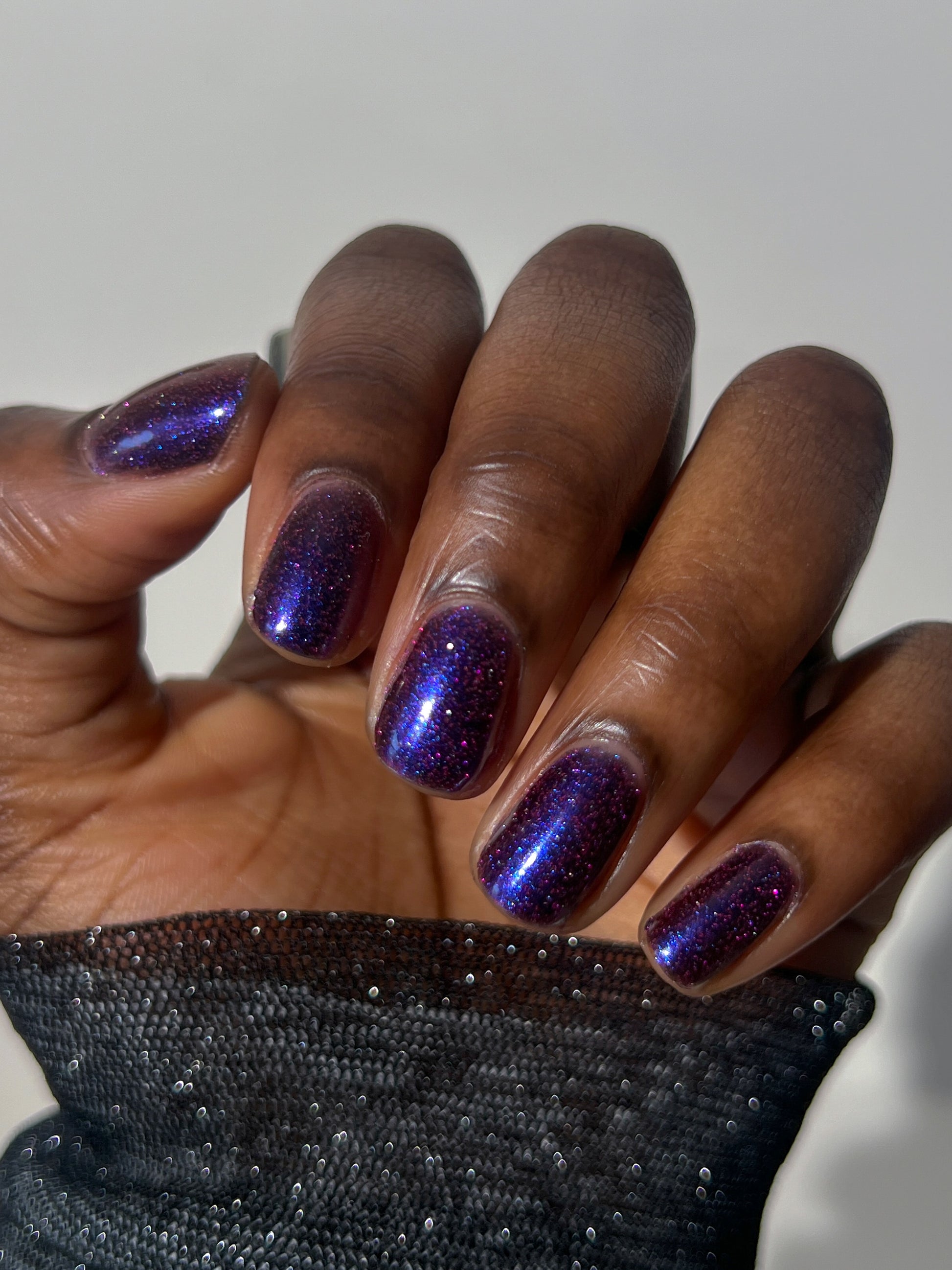 A blue multichrome that shifts to purple, red, and orange, plus pink reflective glitter. This polish is indulgent, just like a midnight snack should be.