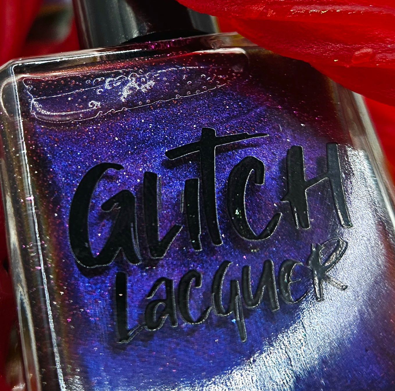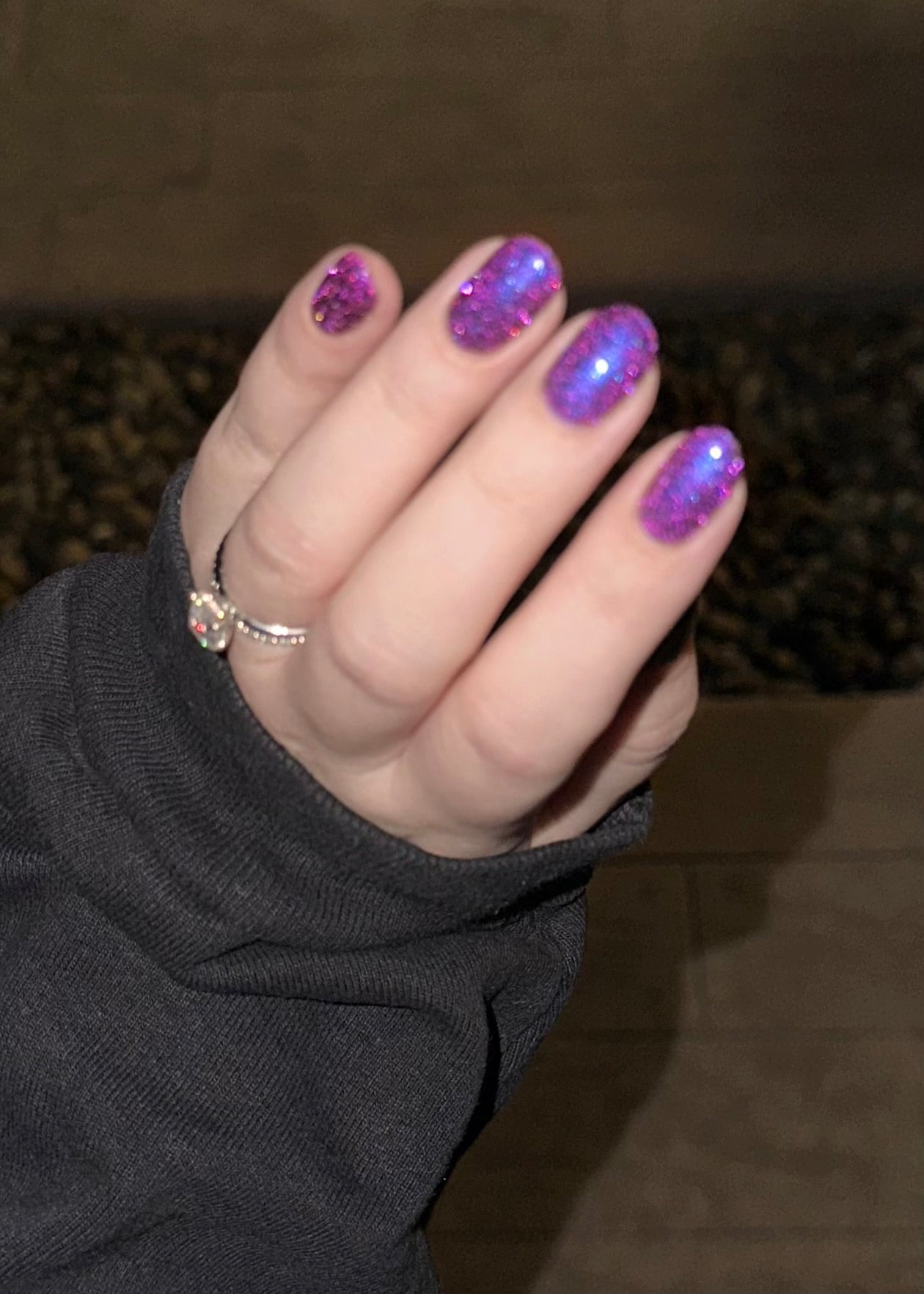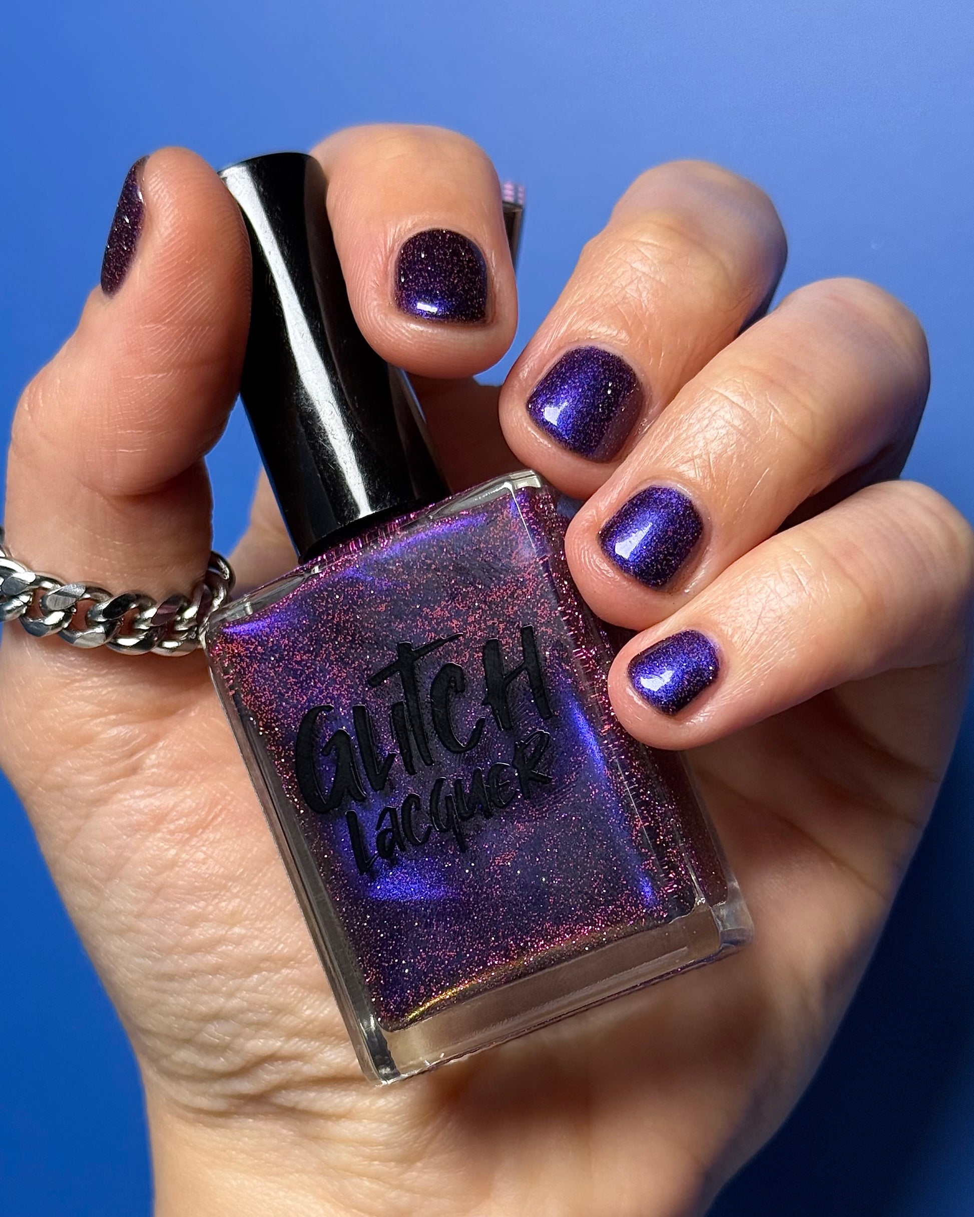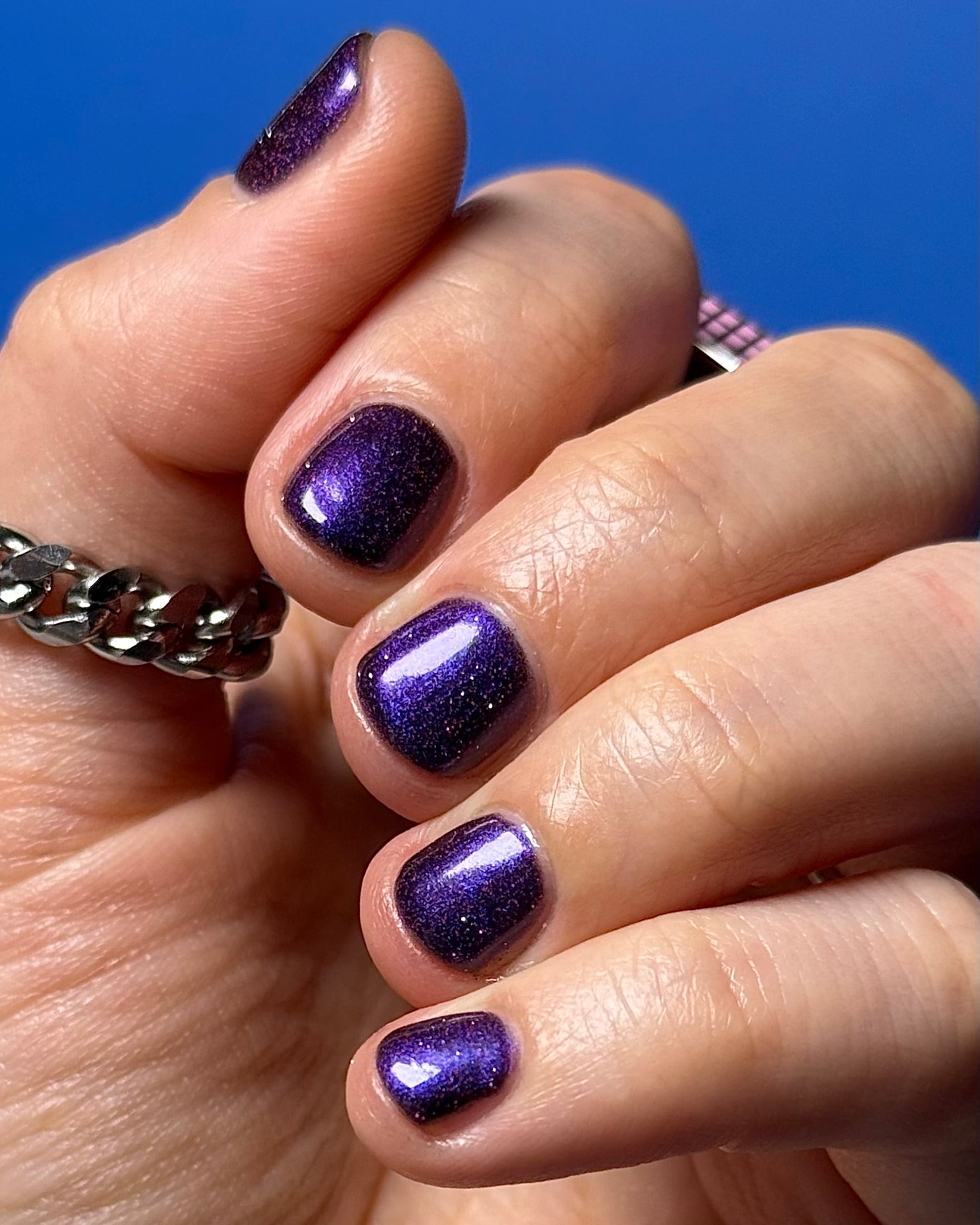 A blue multichrome that shifts to purple, red, and orange, plus pink reflective glitter. This polish is indulgent, just like a midnight snack should be.