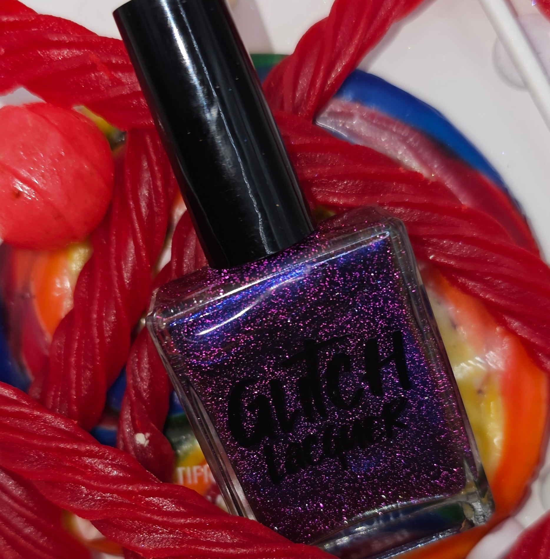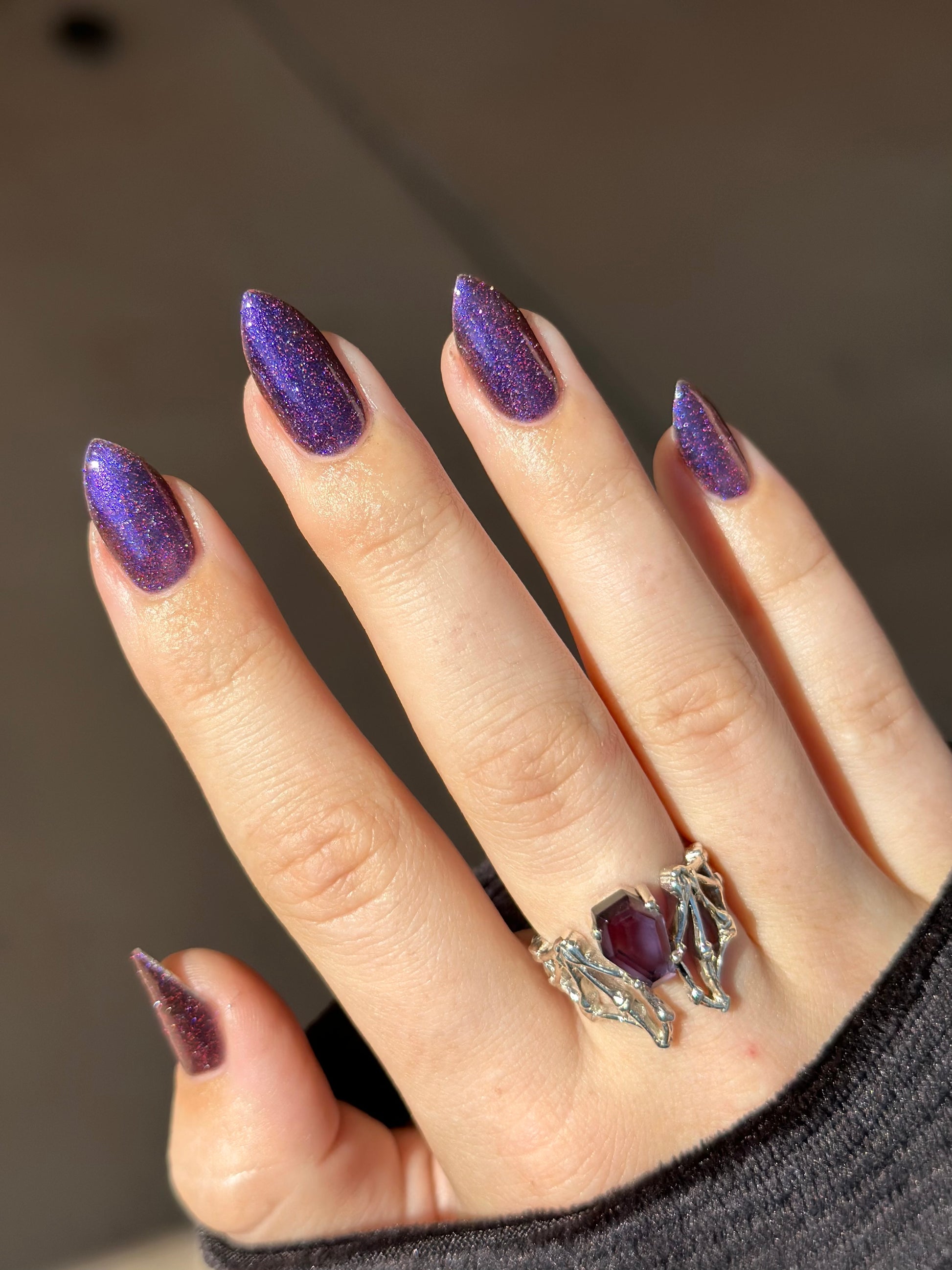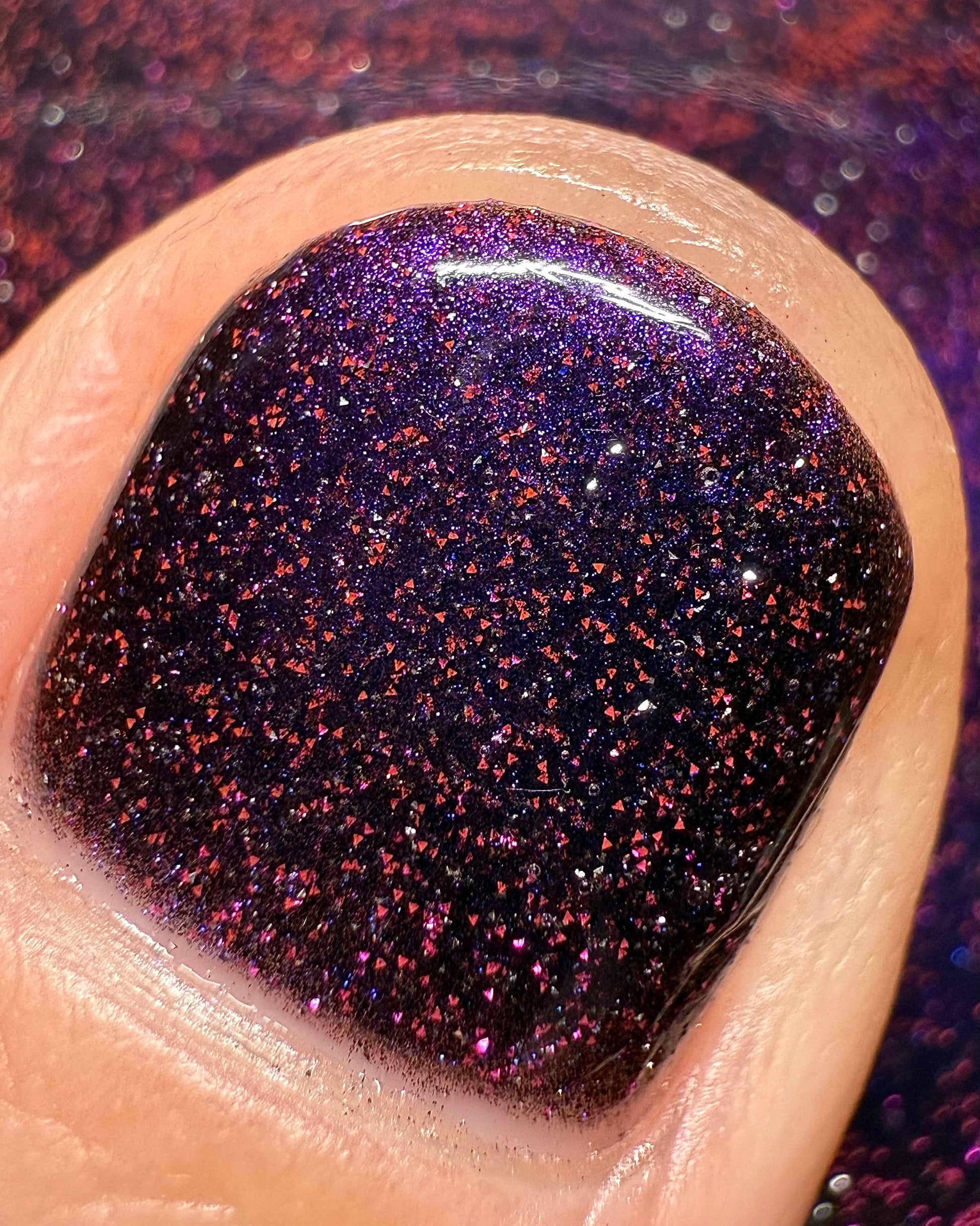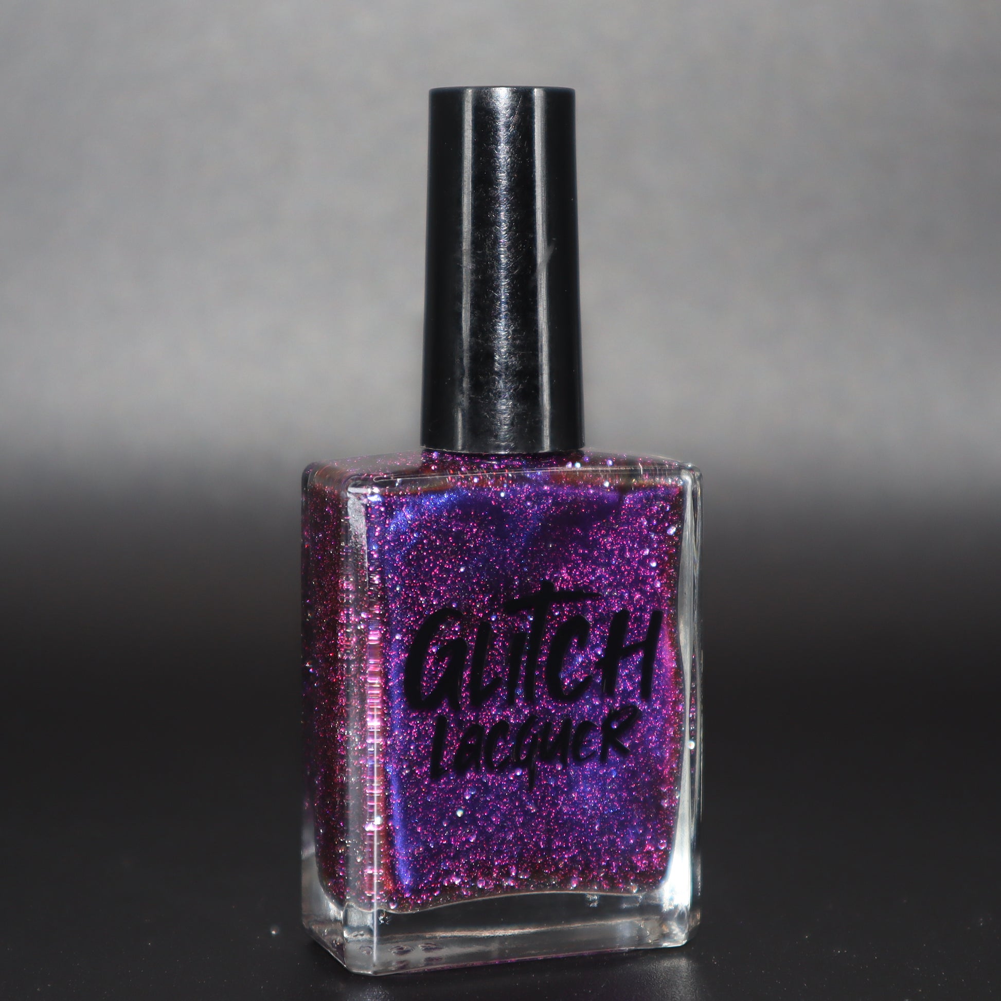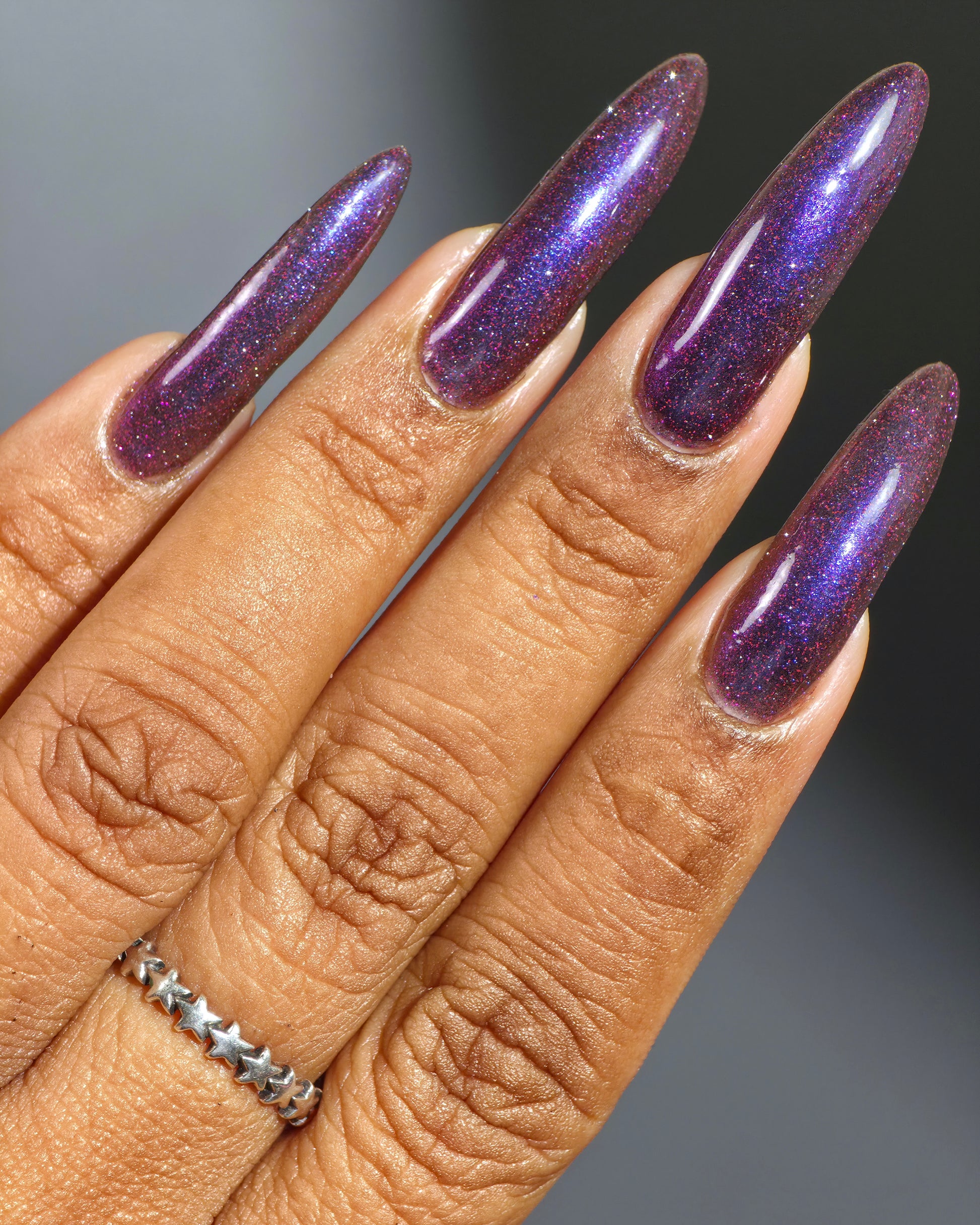 A blue multichrome that shifts to purple, red, and orange, plus pink reflective glitter. This polish is indulgent, just like a midnight snack should be.