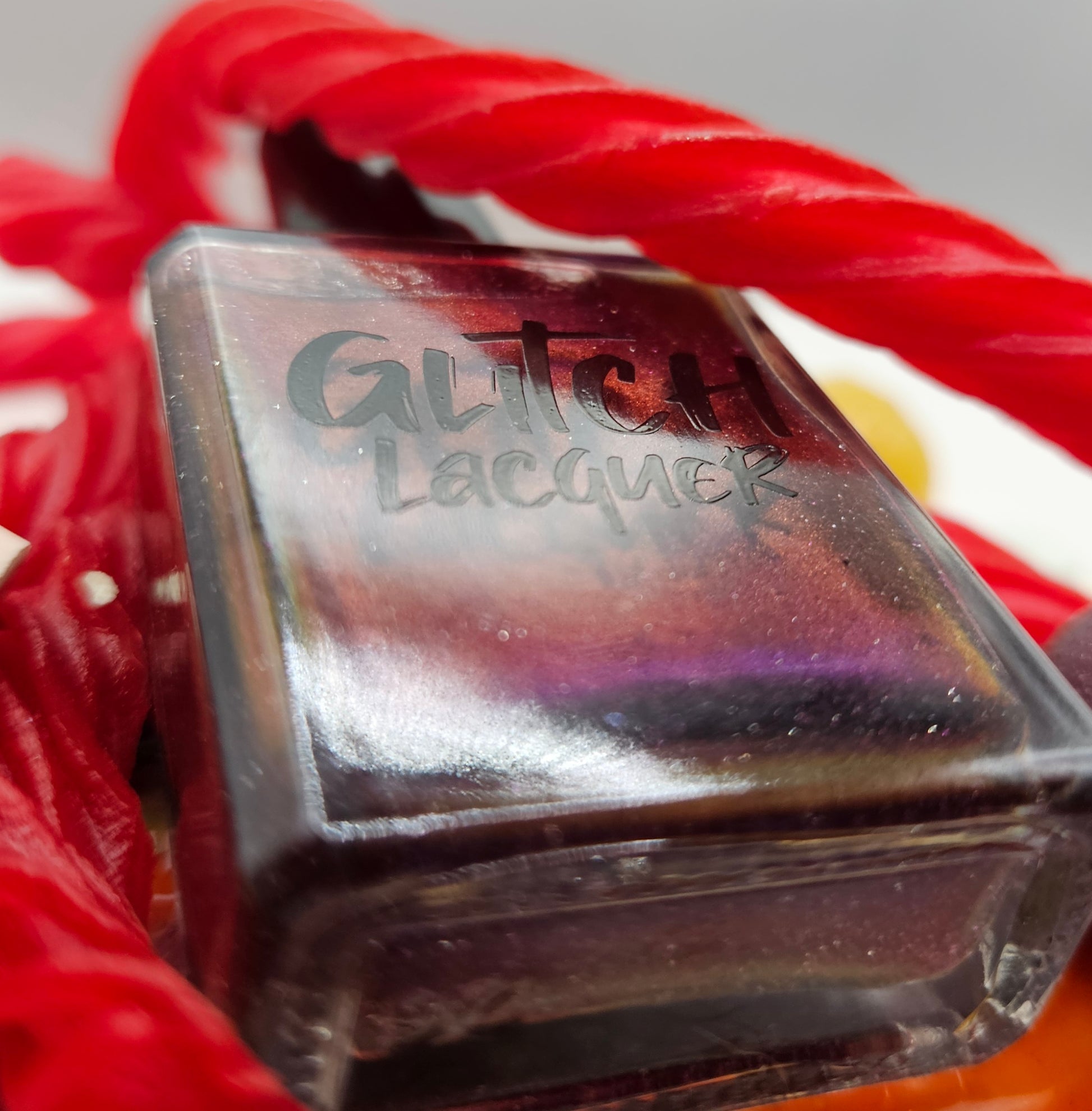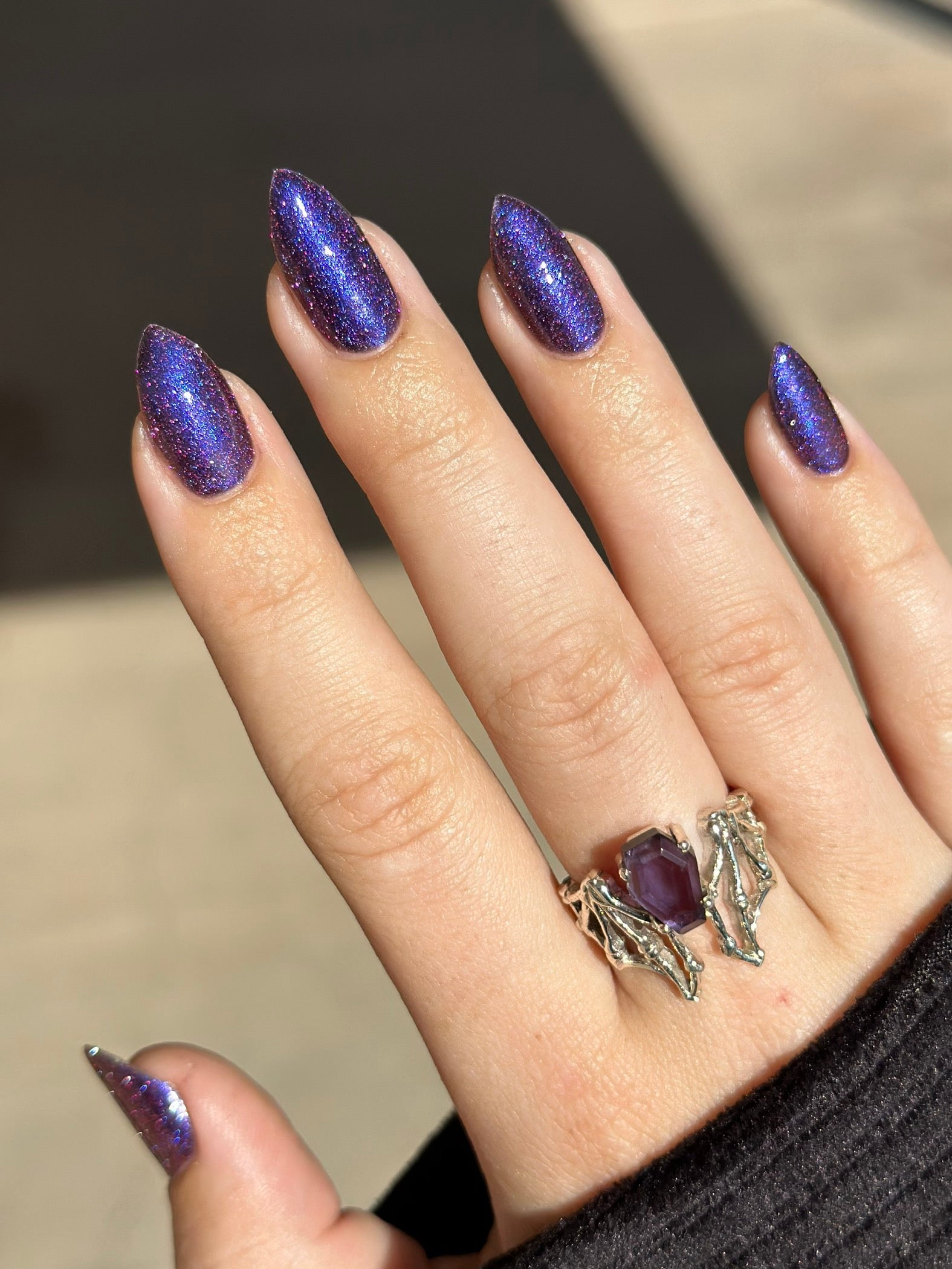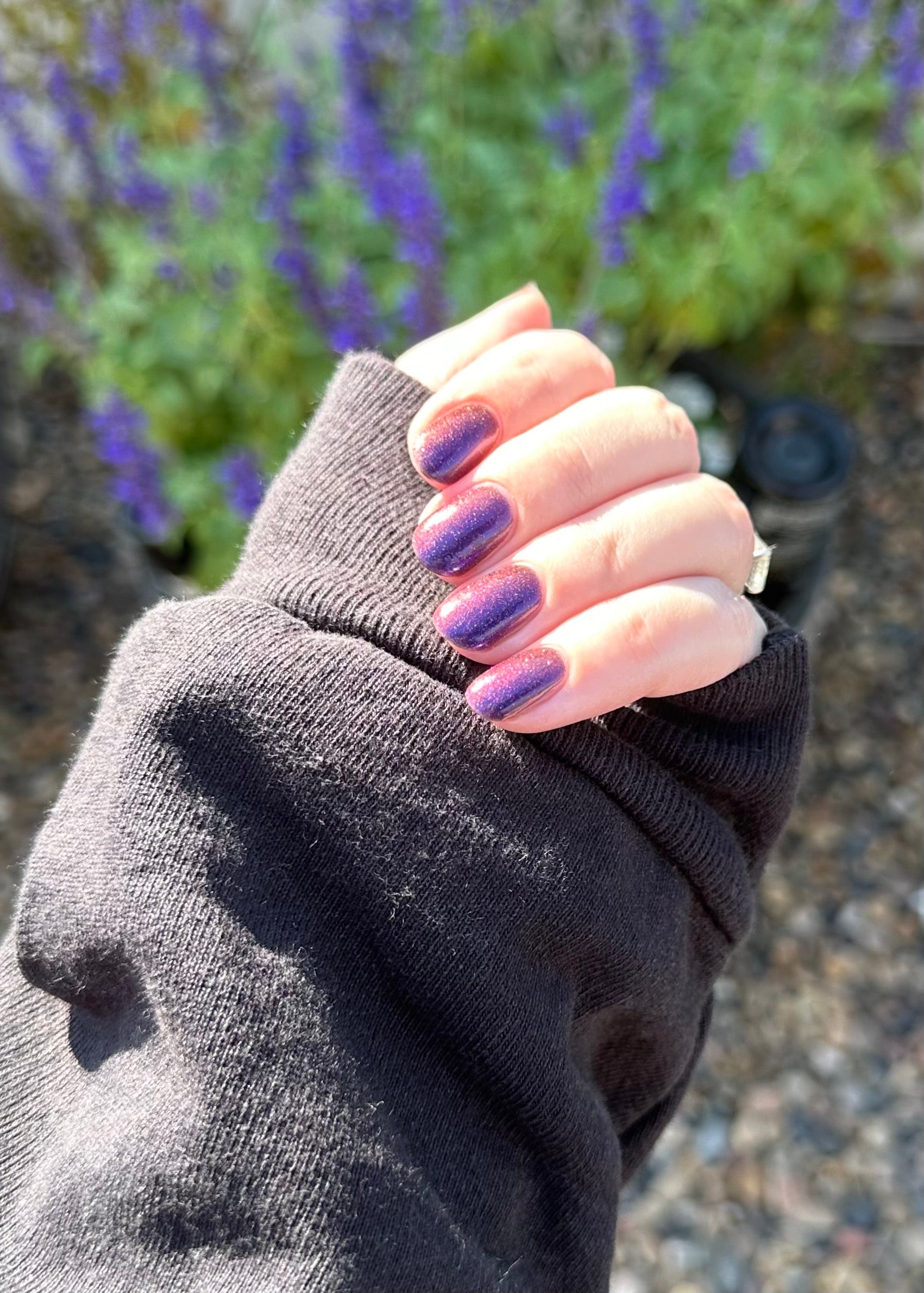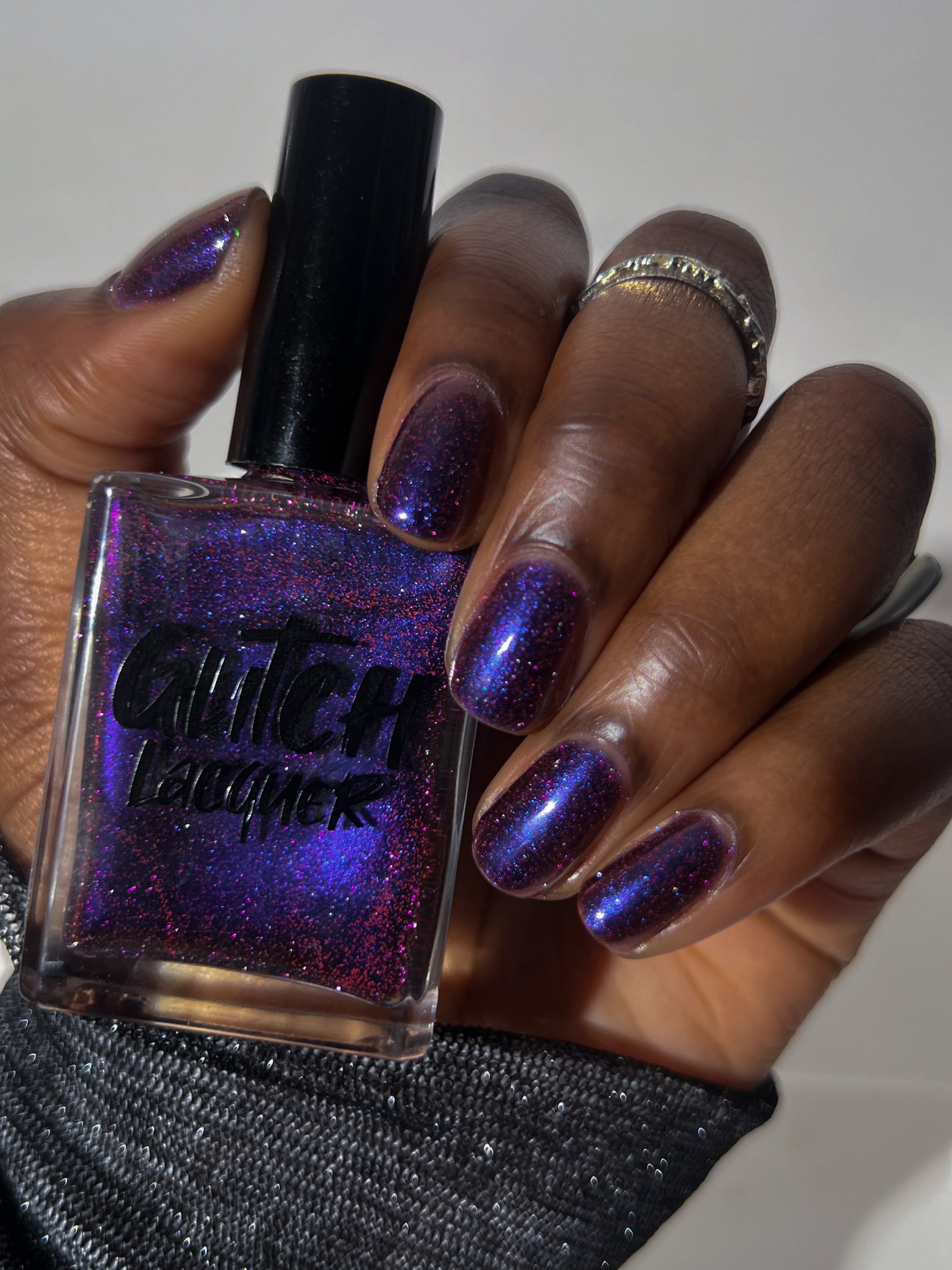 A blue multichrome that shifts to purple, red, and orange, plus pink reflective glitter. This polish is indulgent, just like a midnight snack should be.