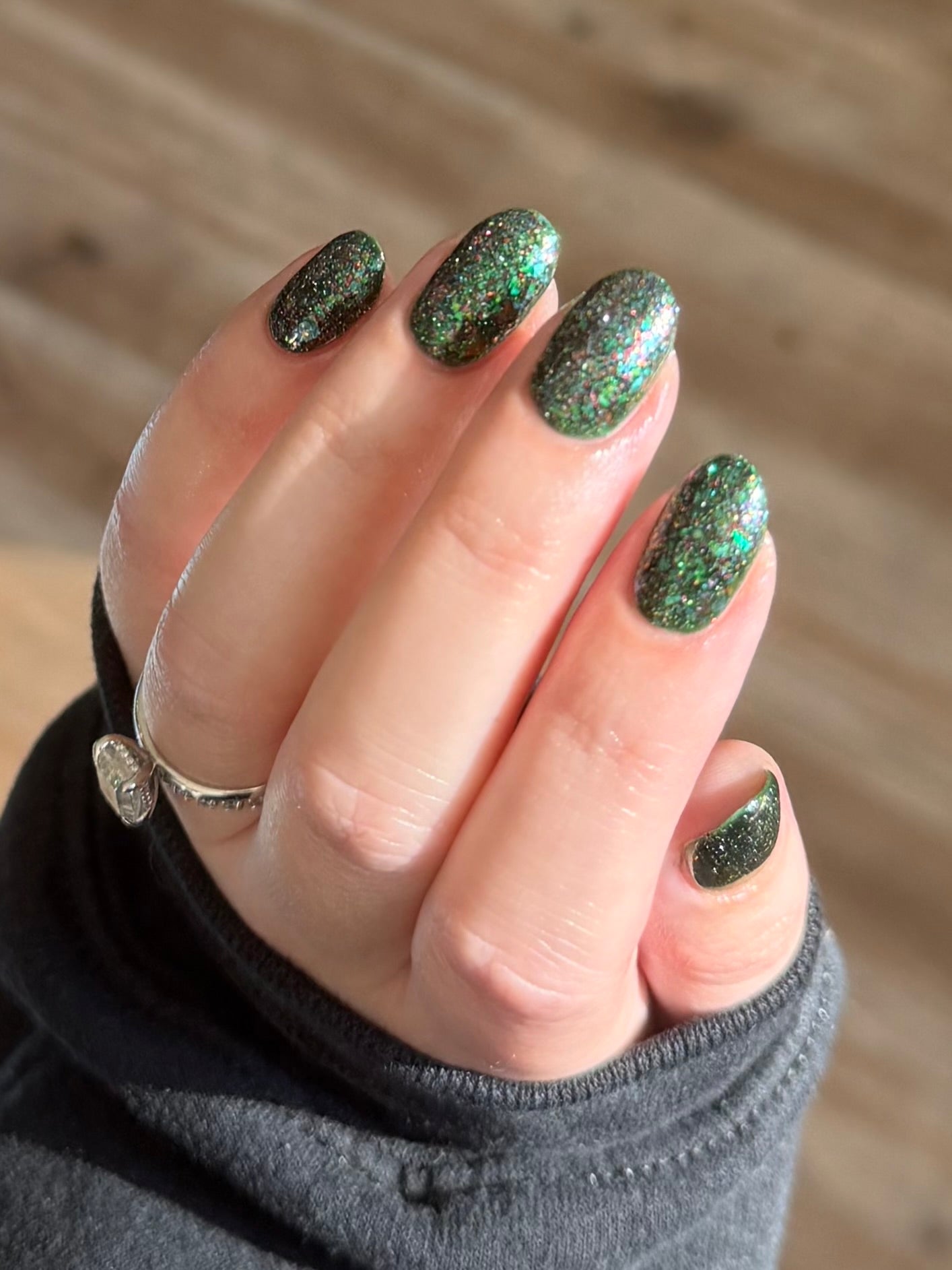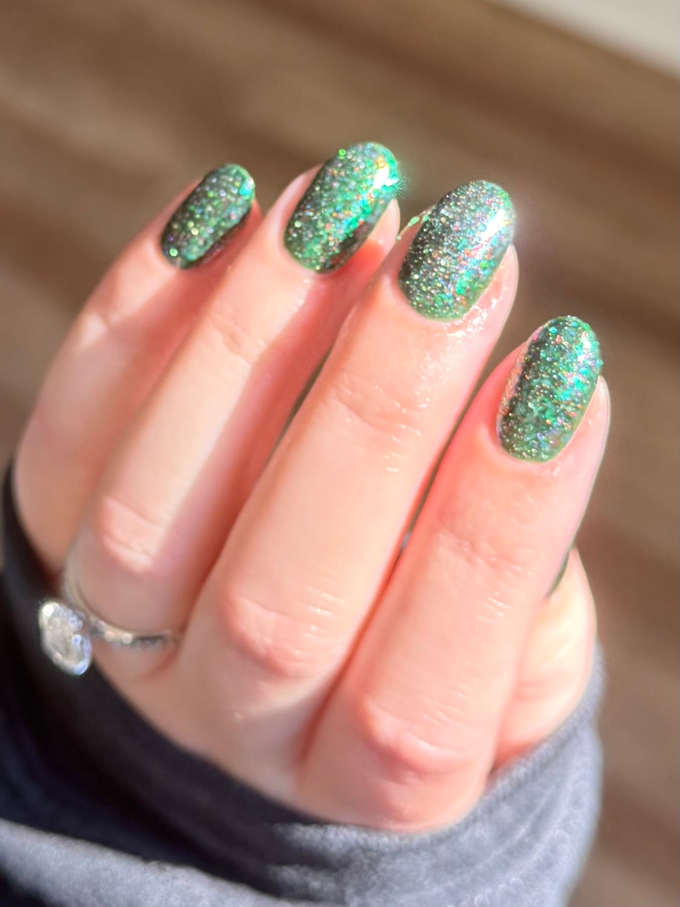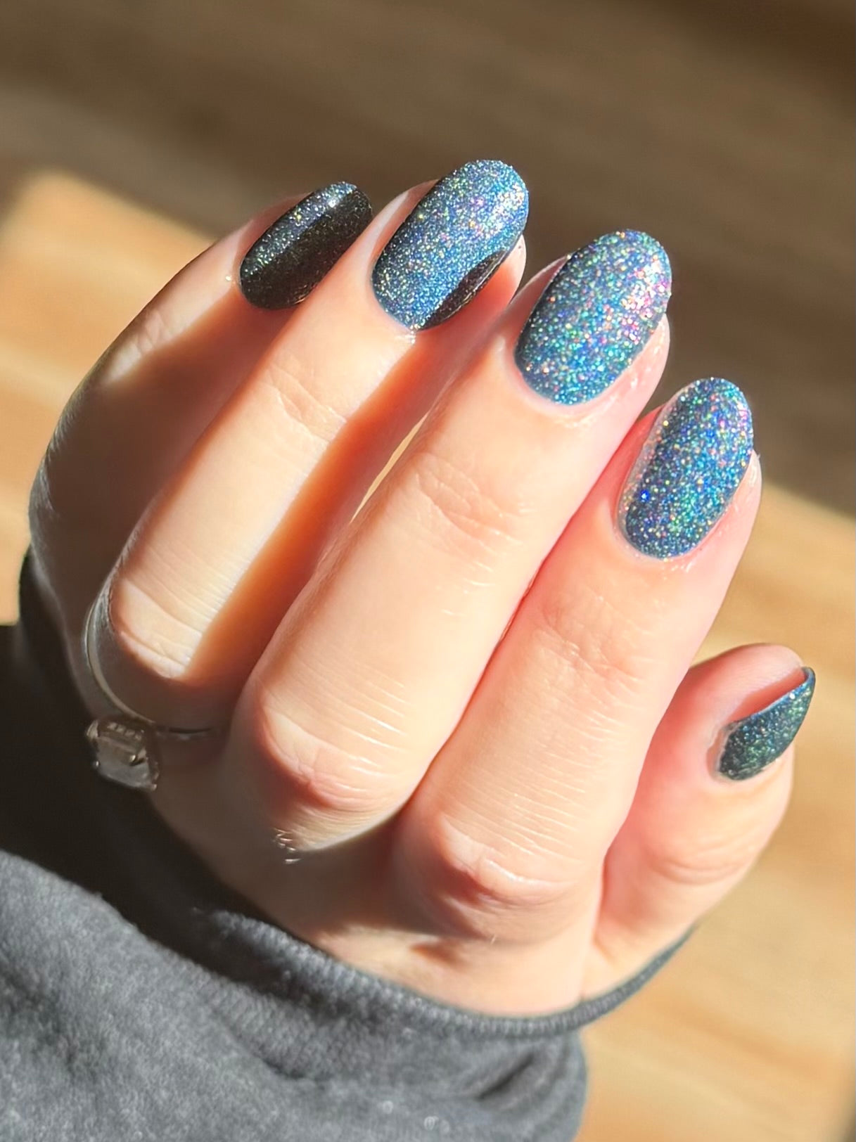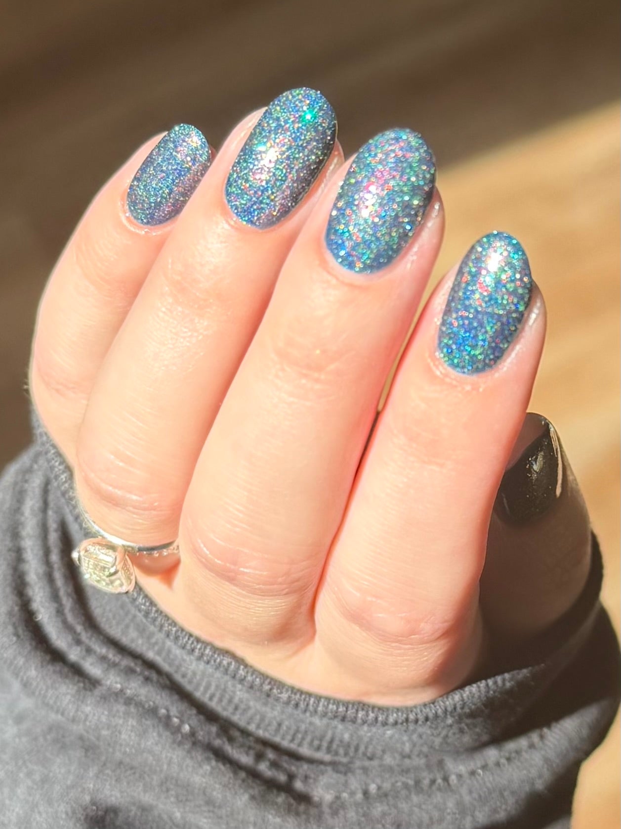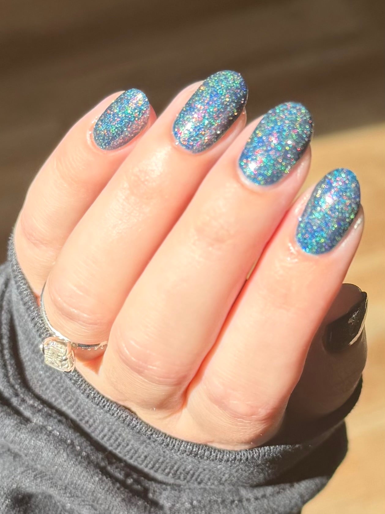 A reflective rainbow glitter topper with a very subtle purple sheen in the base. This polish looks beautiful on it's own but absolutely pops under flash.