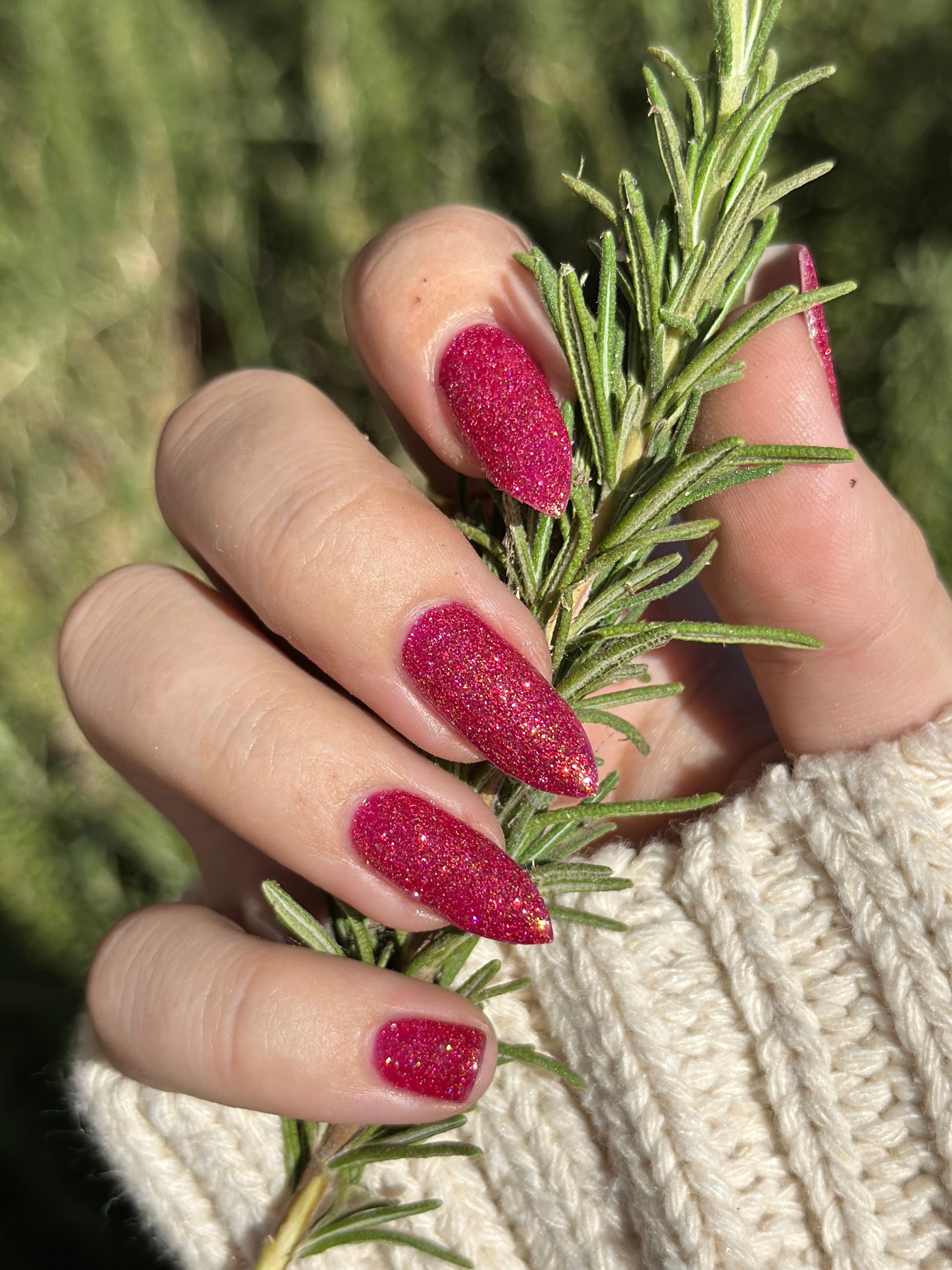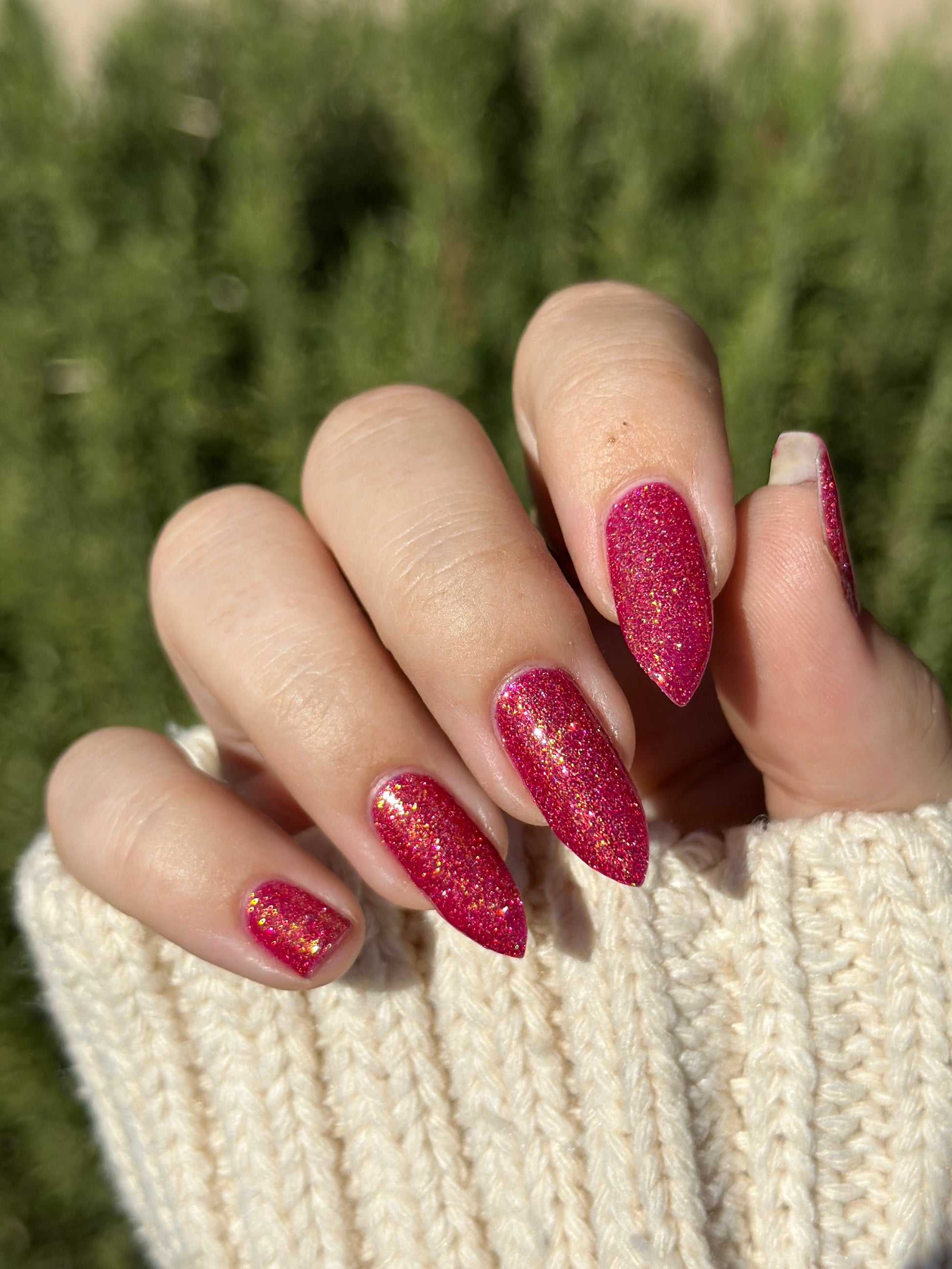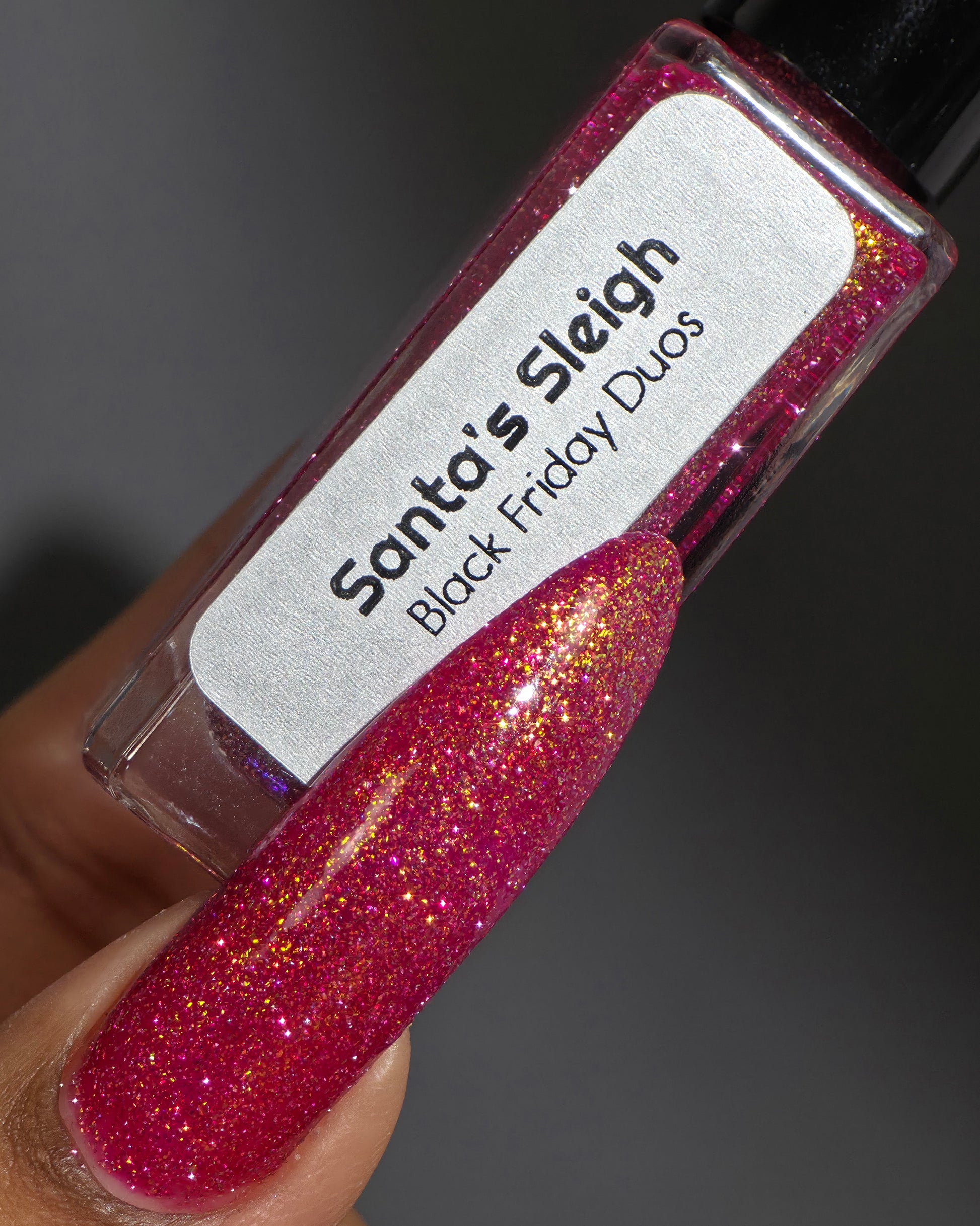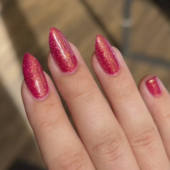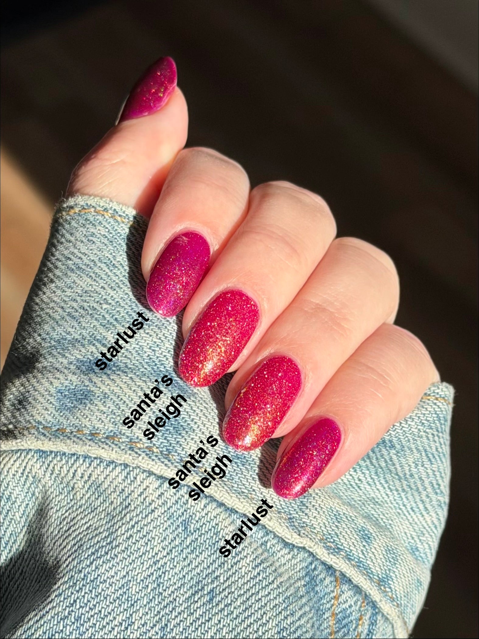 Santa’s Sleigh is a bright red base rich in pinky red reflective glitter & a gold green shift.