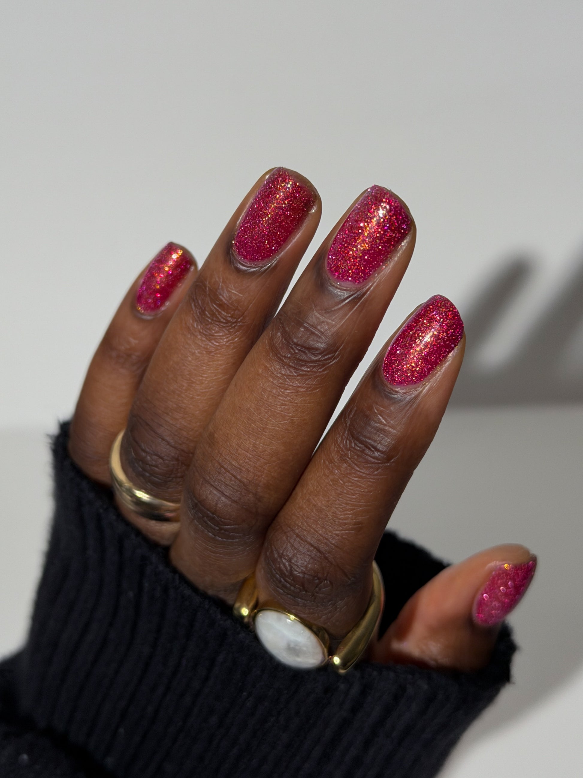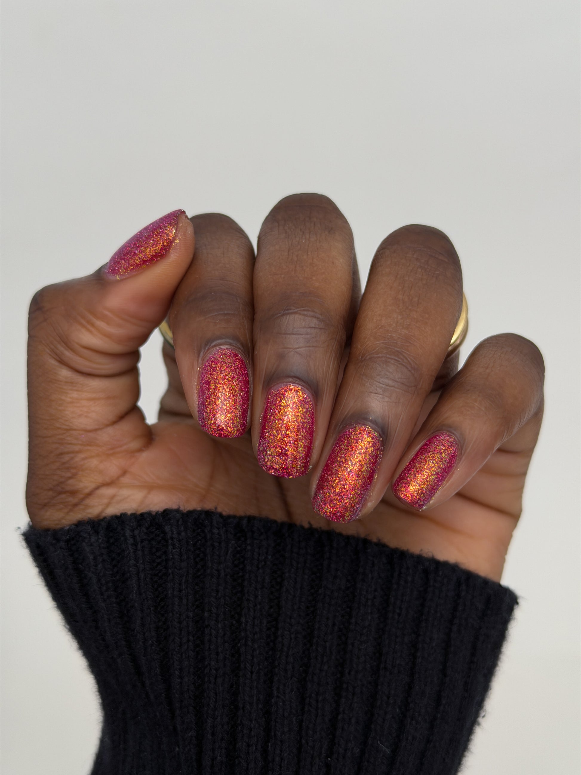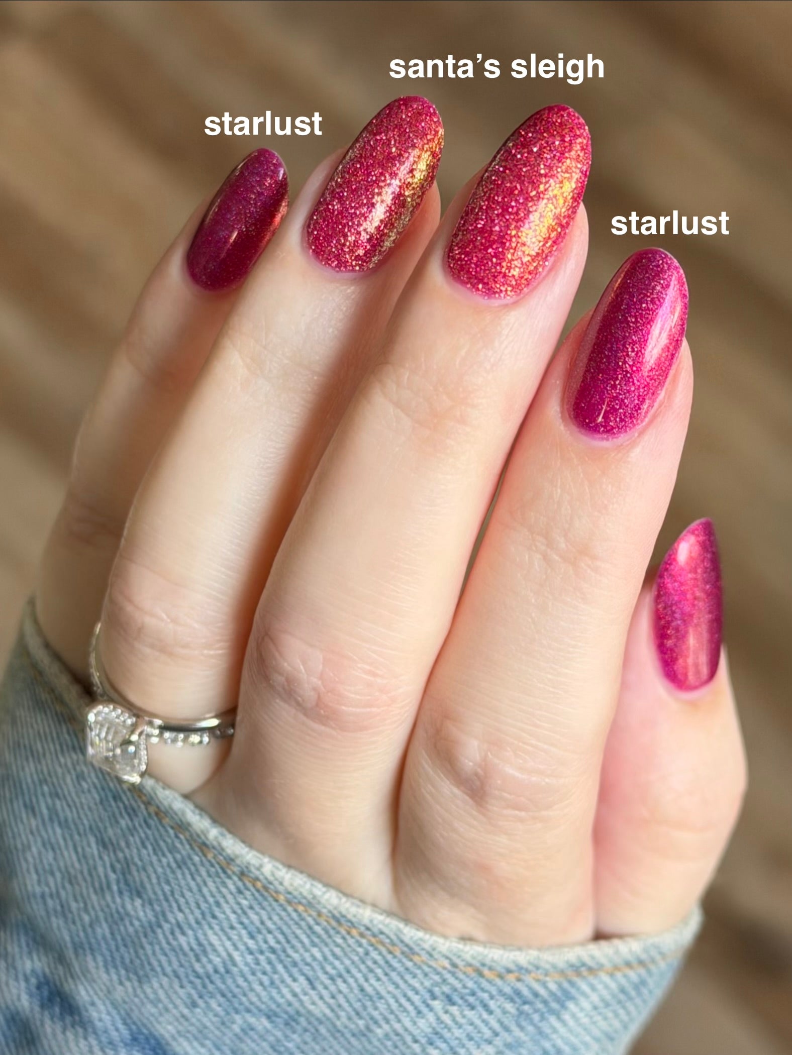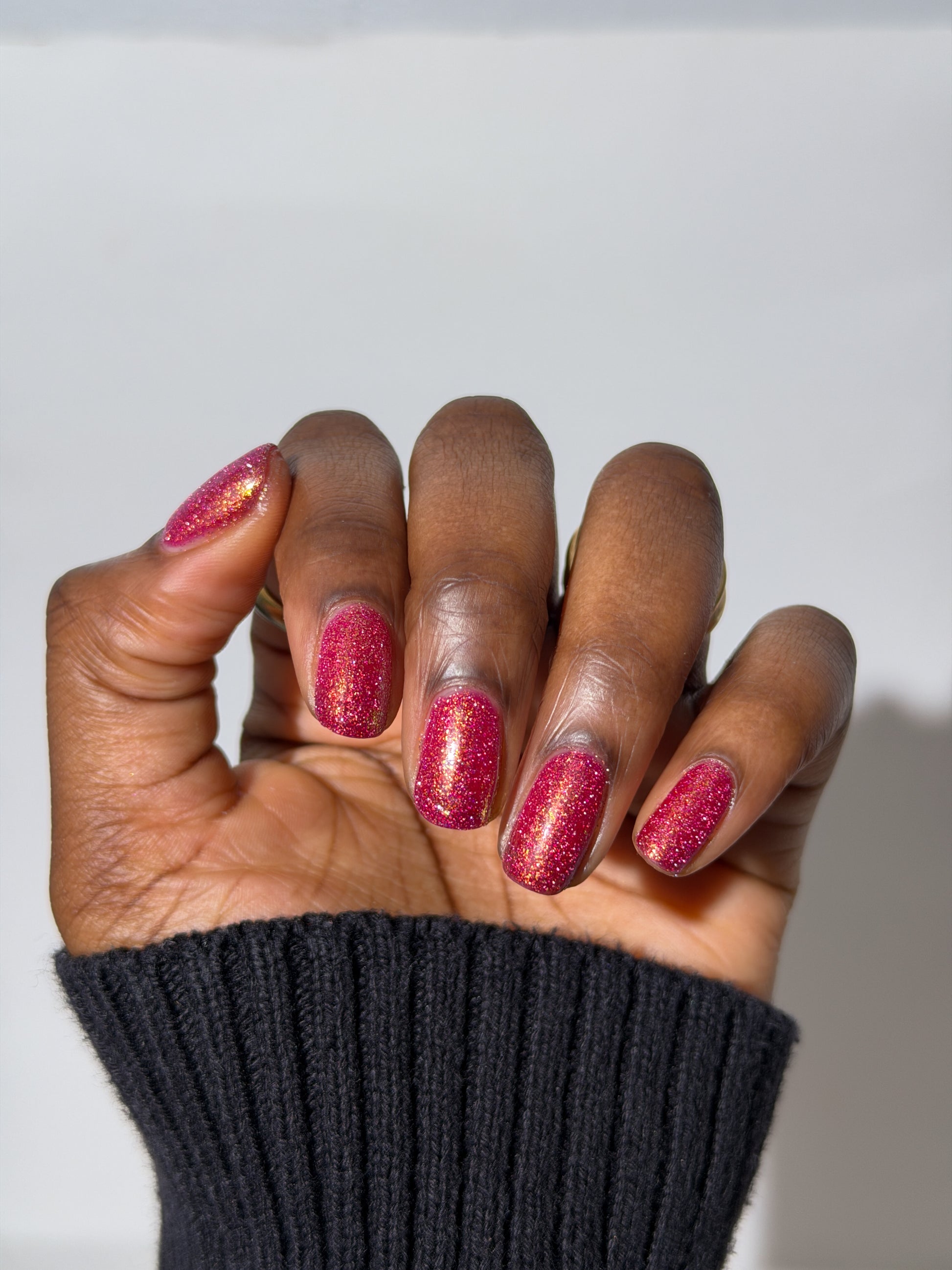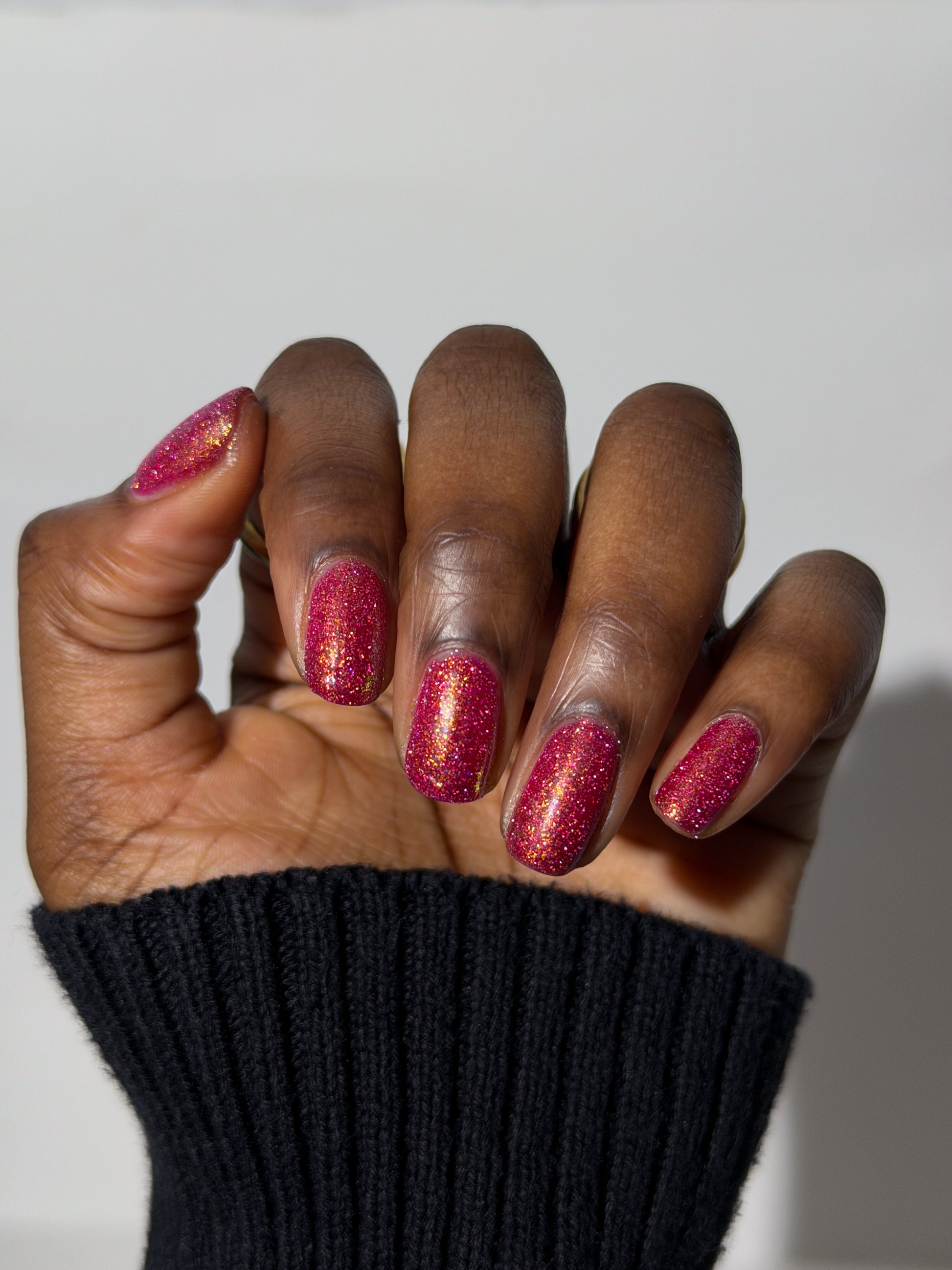 Santa’s Sleigh is a bright red base rich in pinky red reflective glitter & a gold green shift.