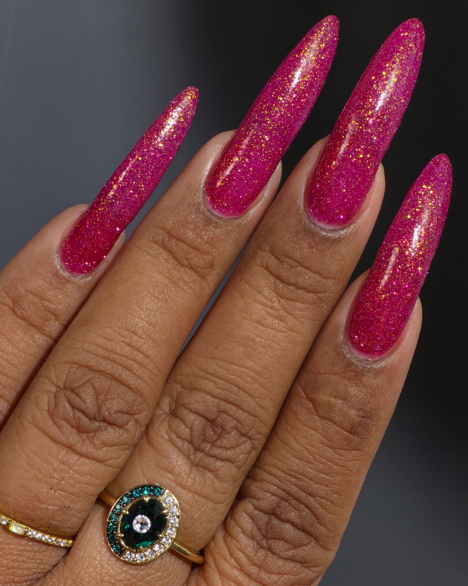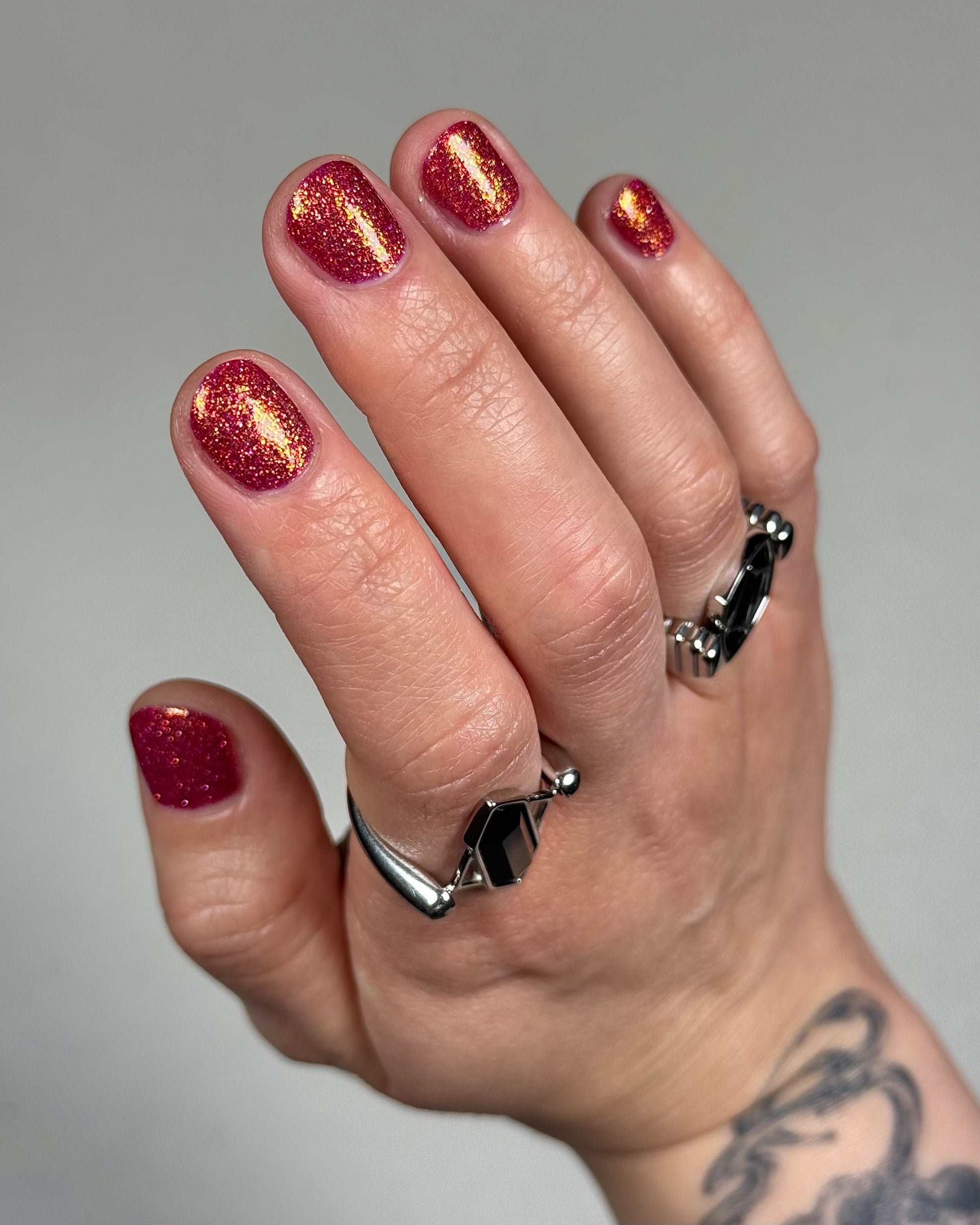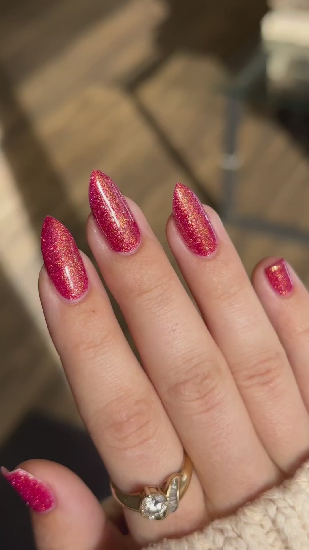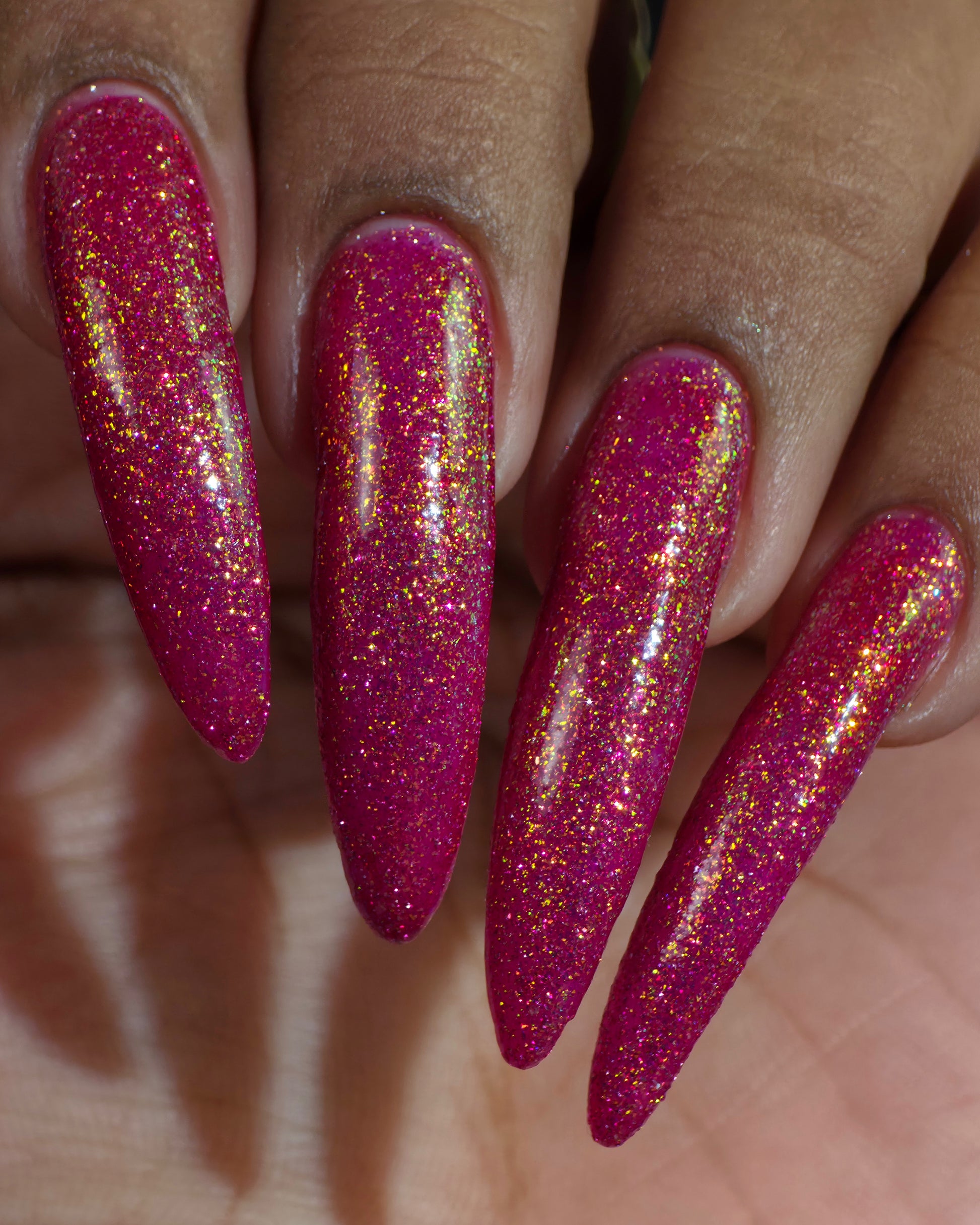 Santa’s Sleigh is a bright red base rich in pinky red reflective glitter & a gold green shift.