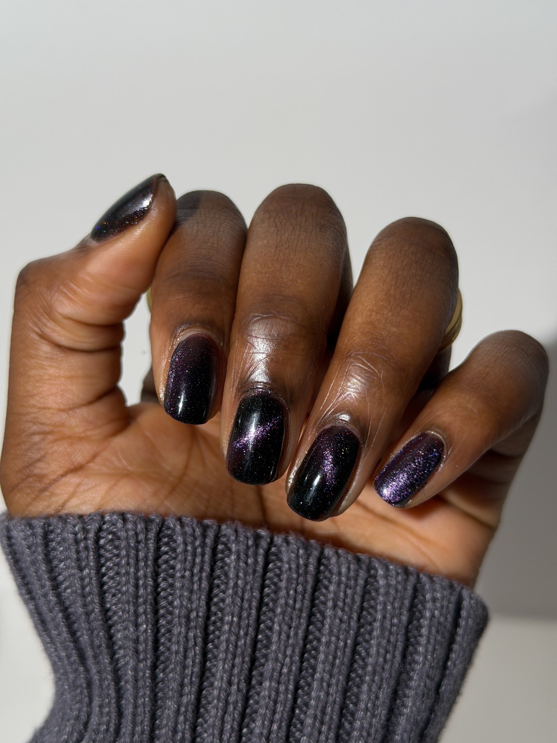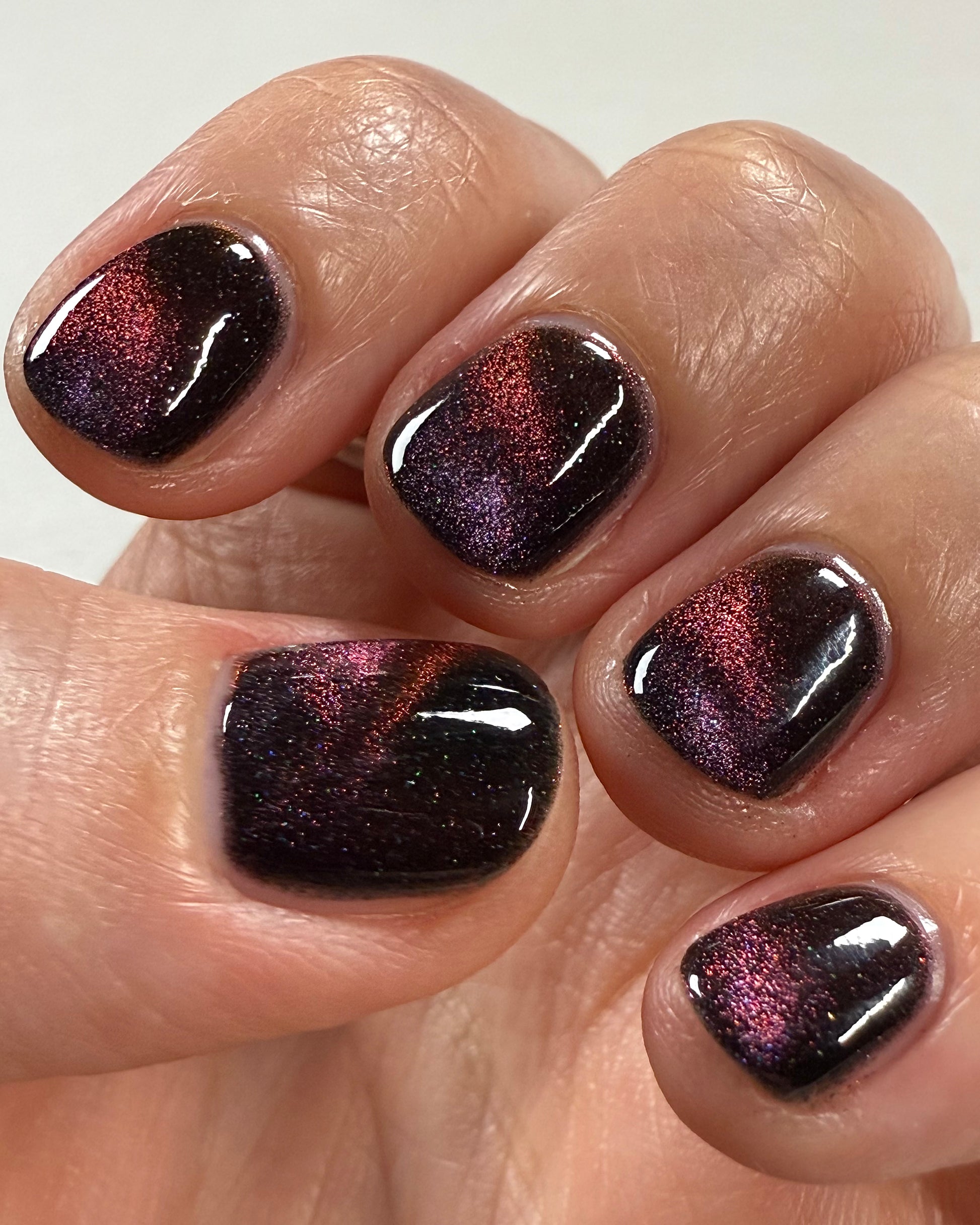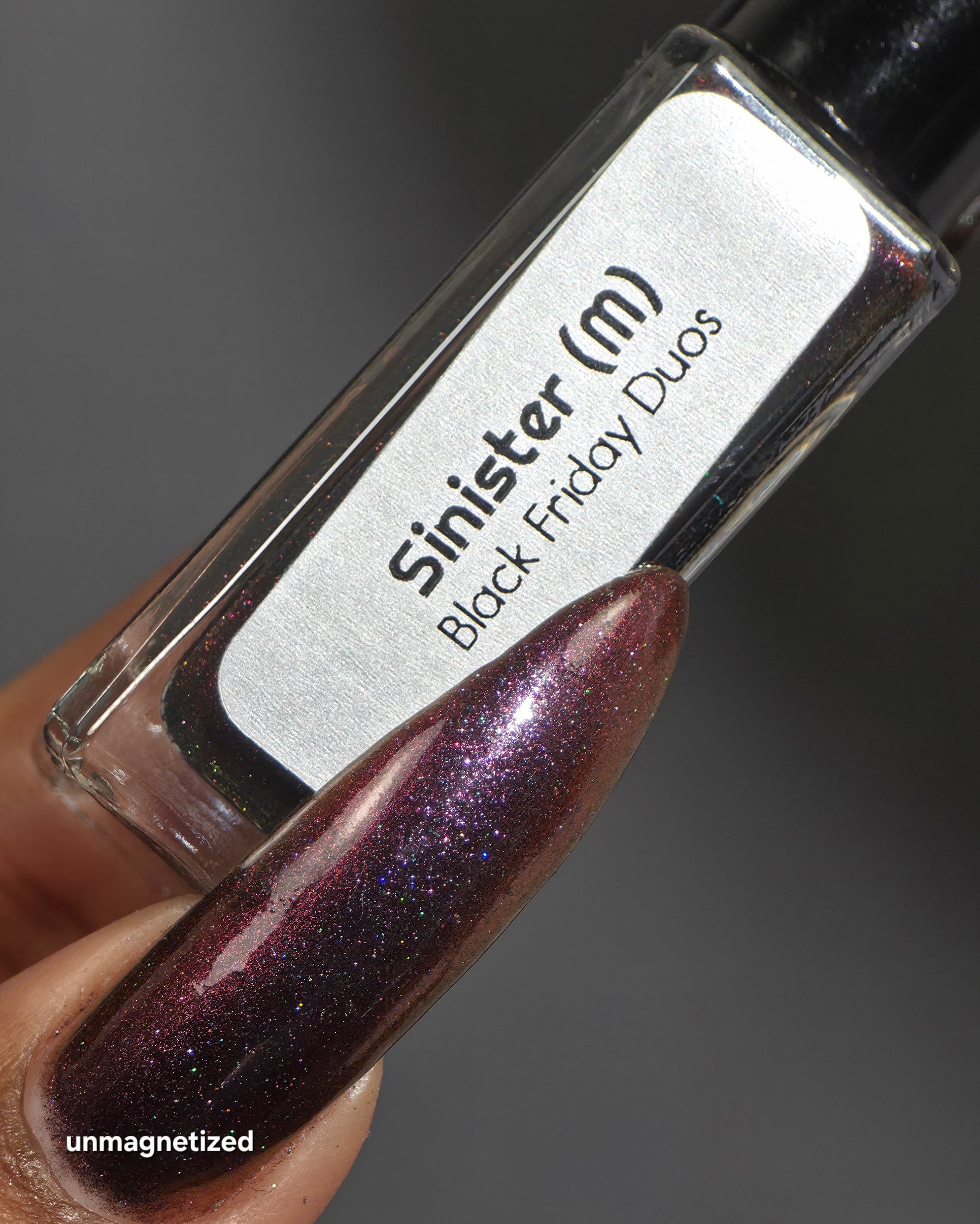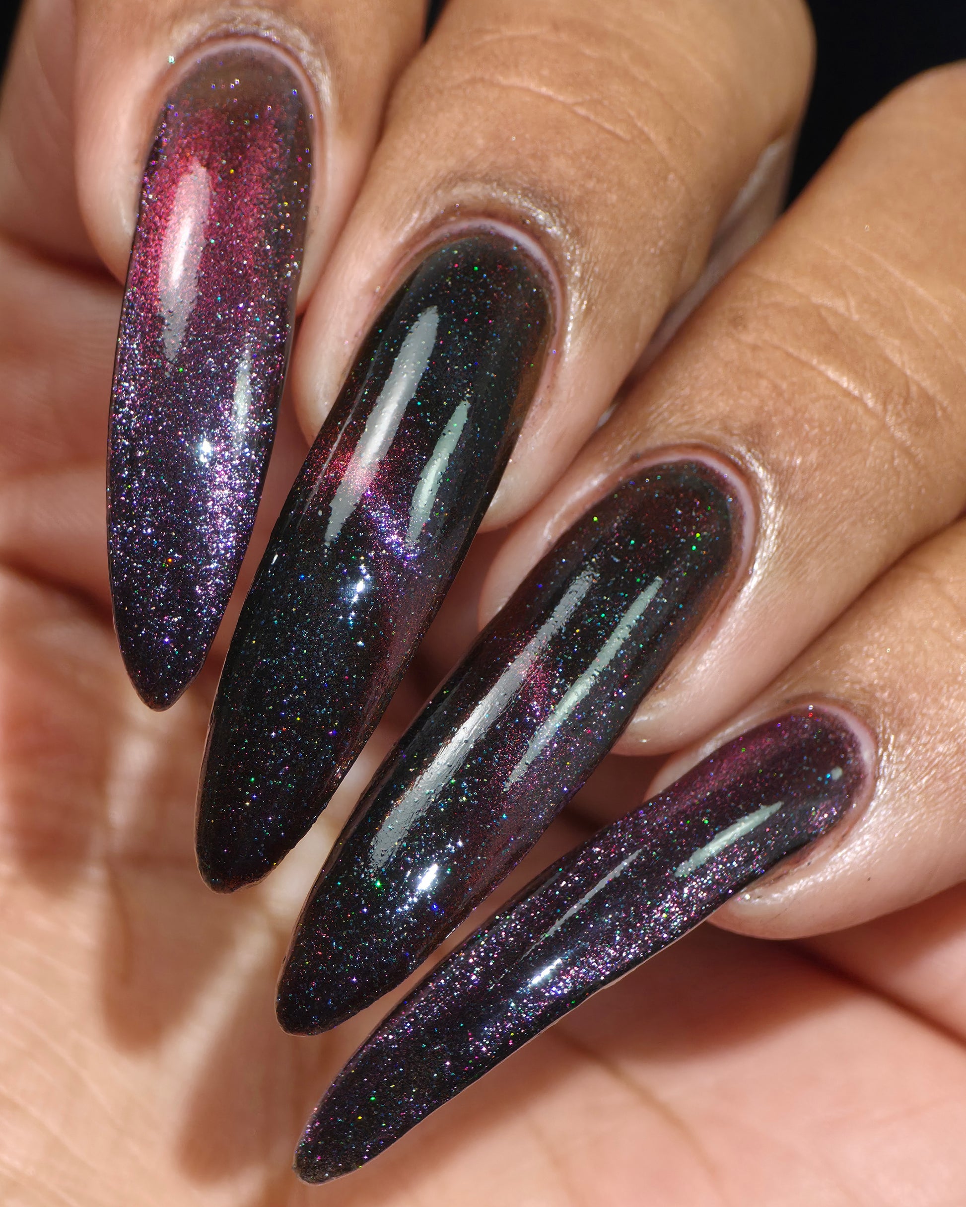 Sinister is a black base with a violet, red, and orange shifting magnetic with a dusting of black holo glitter for a scattered sparkle. The polish is a bit more sheer than others; three coats is recommended for maximum impact.