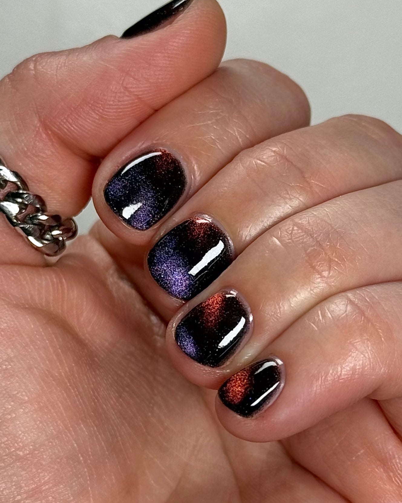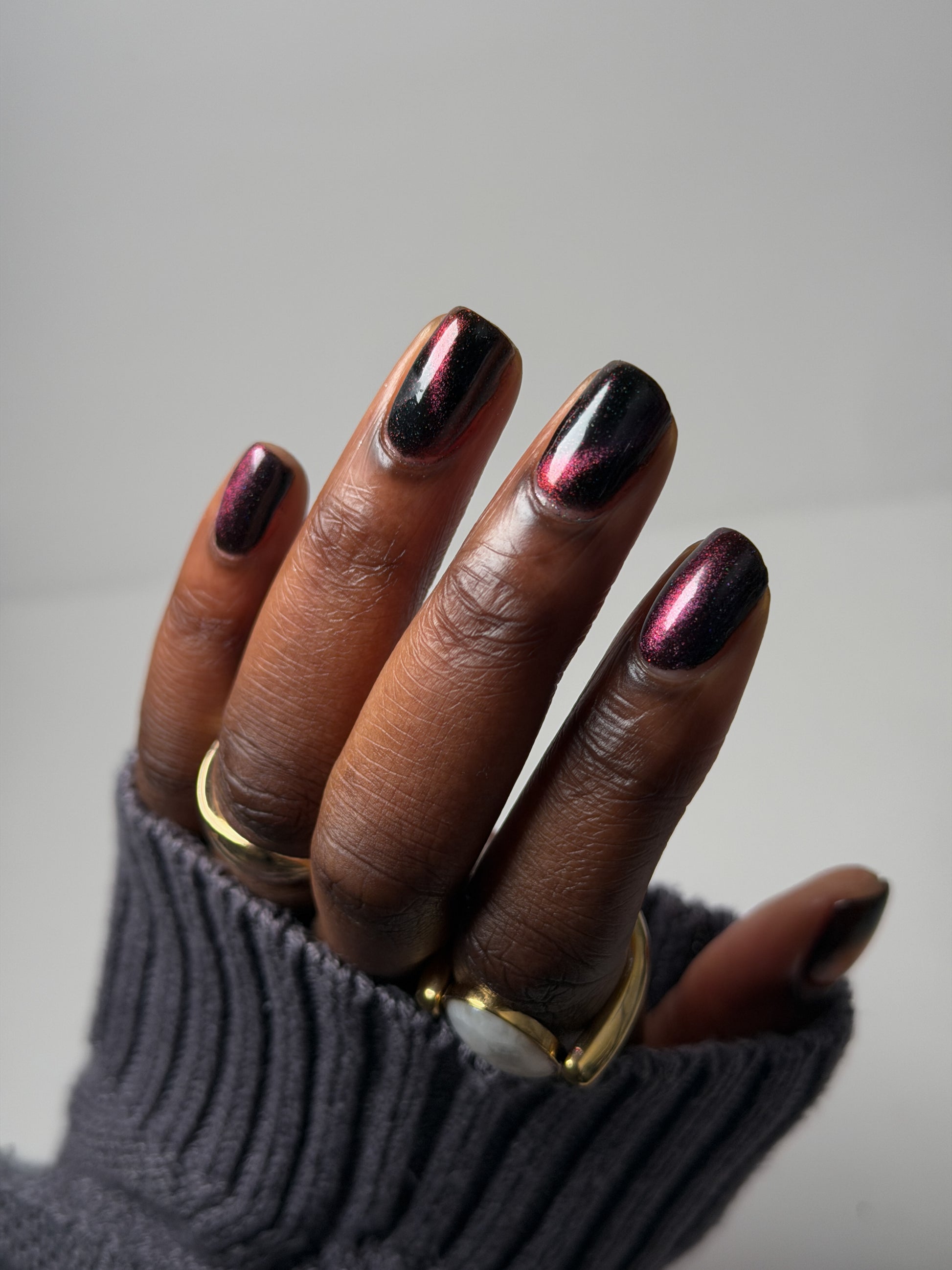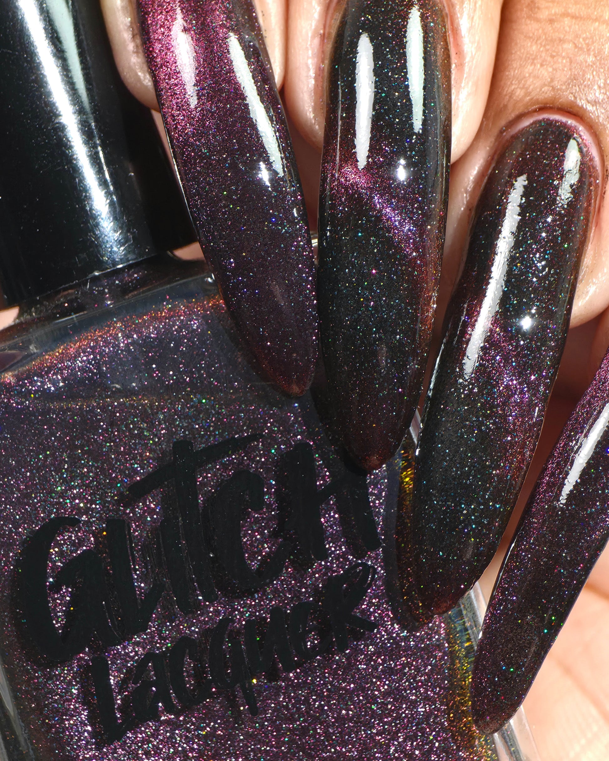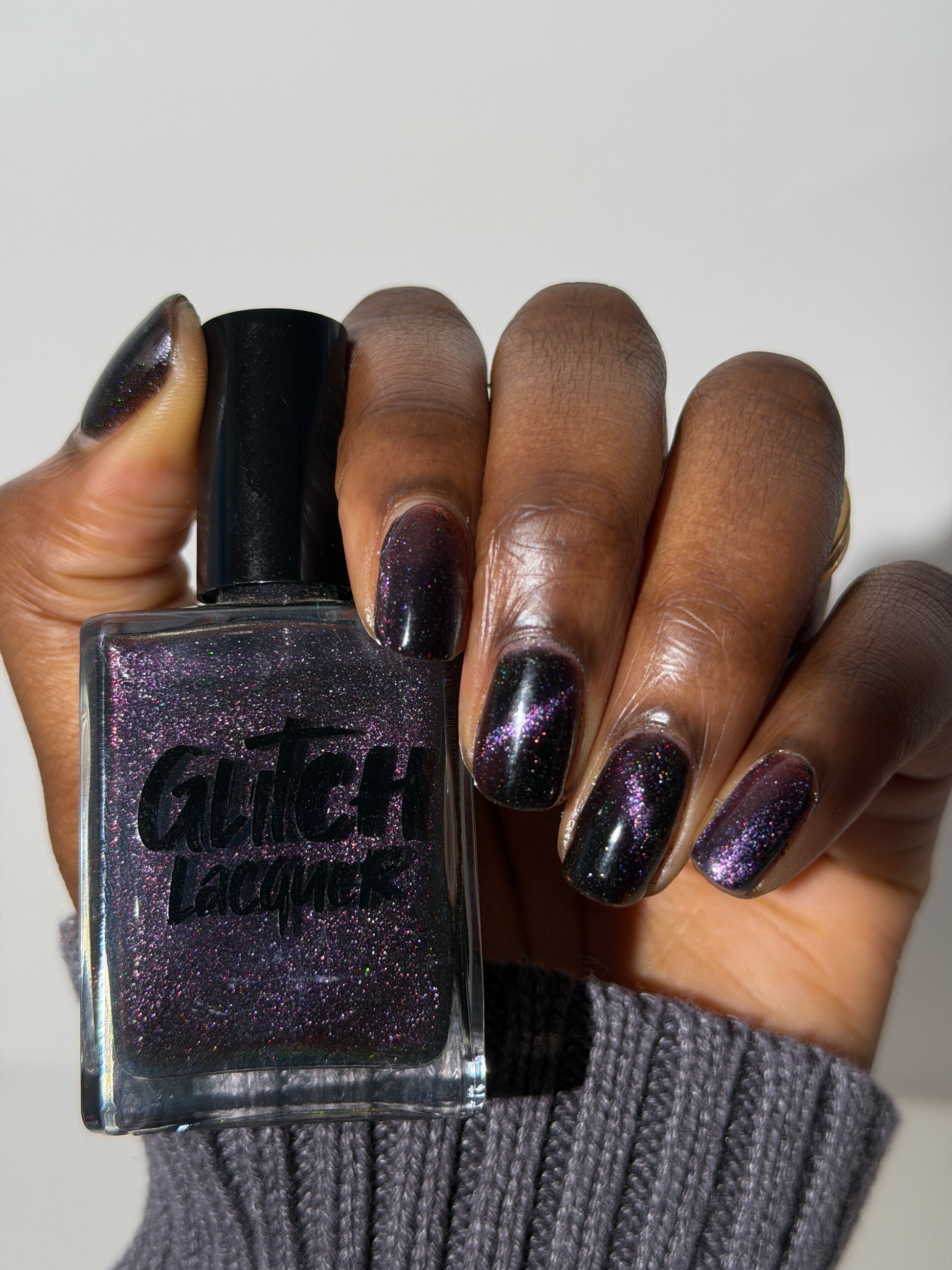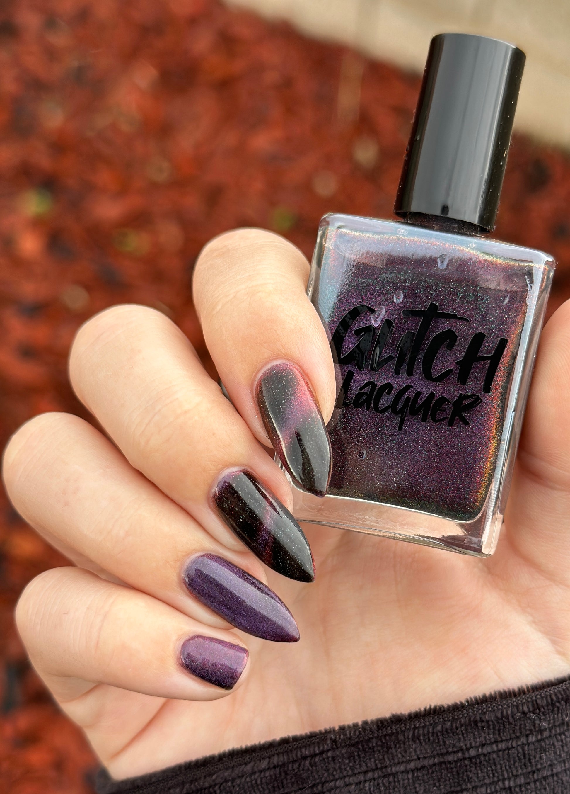 Sinister is a black base with a violet, red, and orange shifting magnetic with a dusting of black holo glitter for a scattered sparkle. The polish is a bit more sheer than others; three coats is recommended for maximum impact.