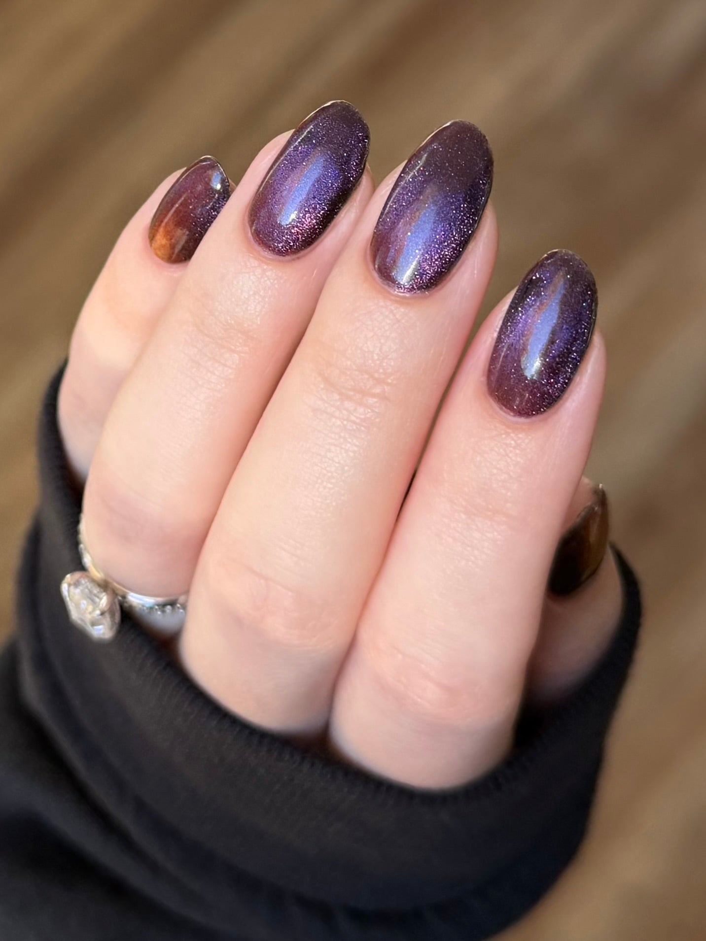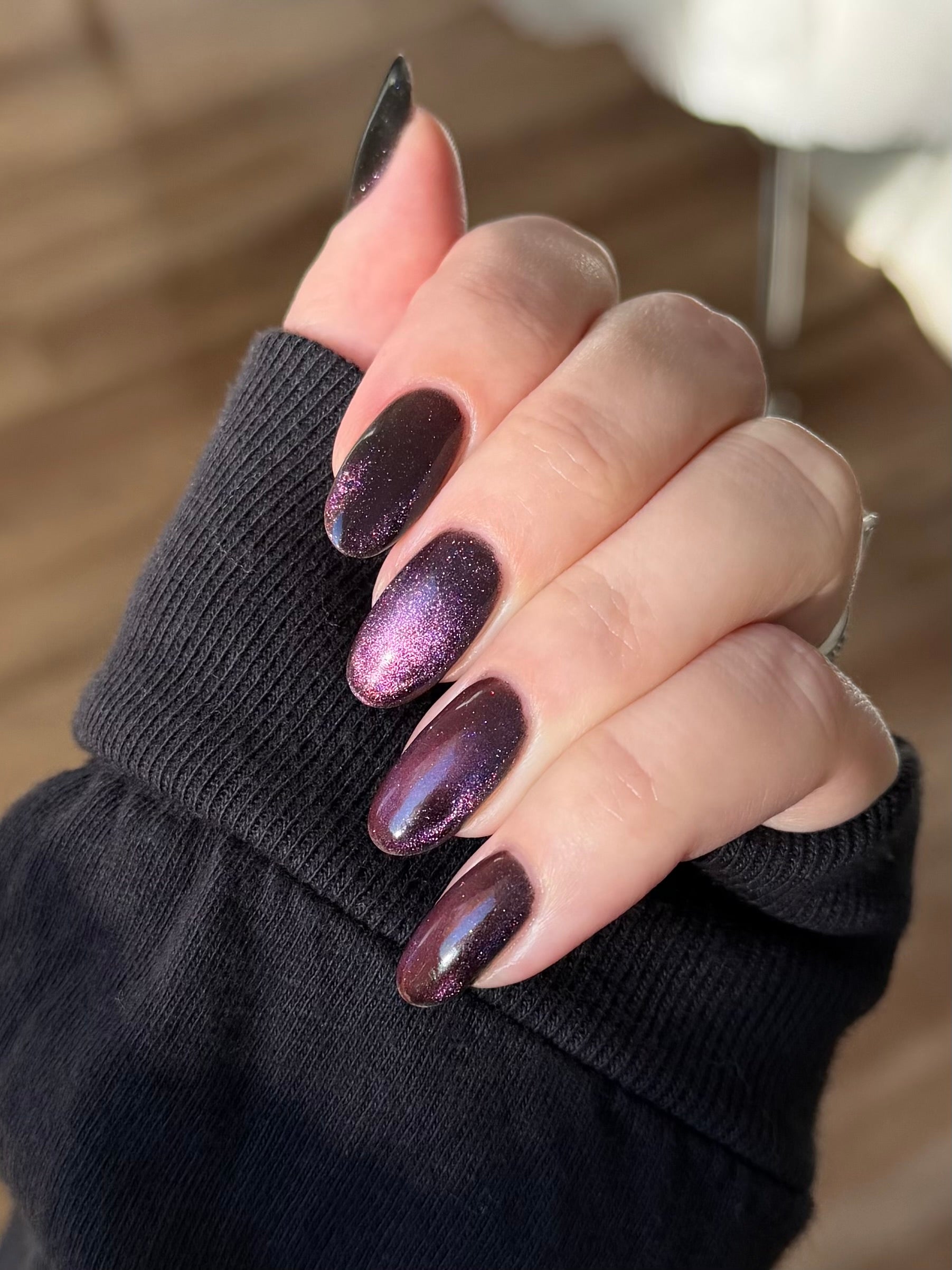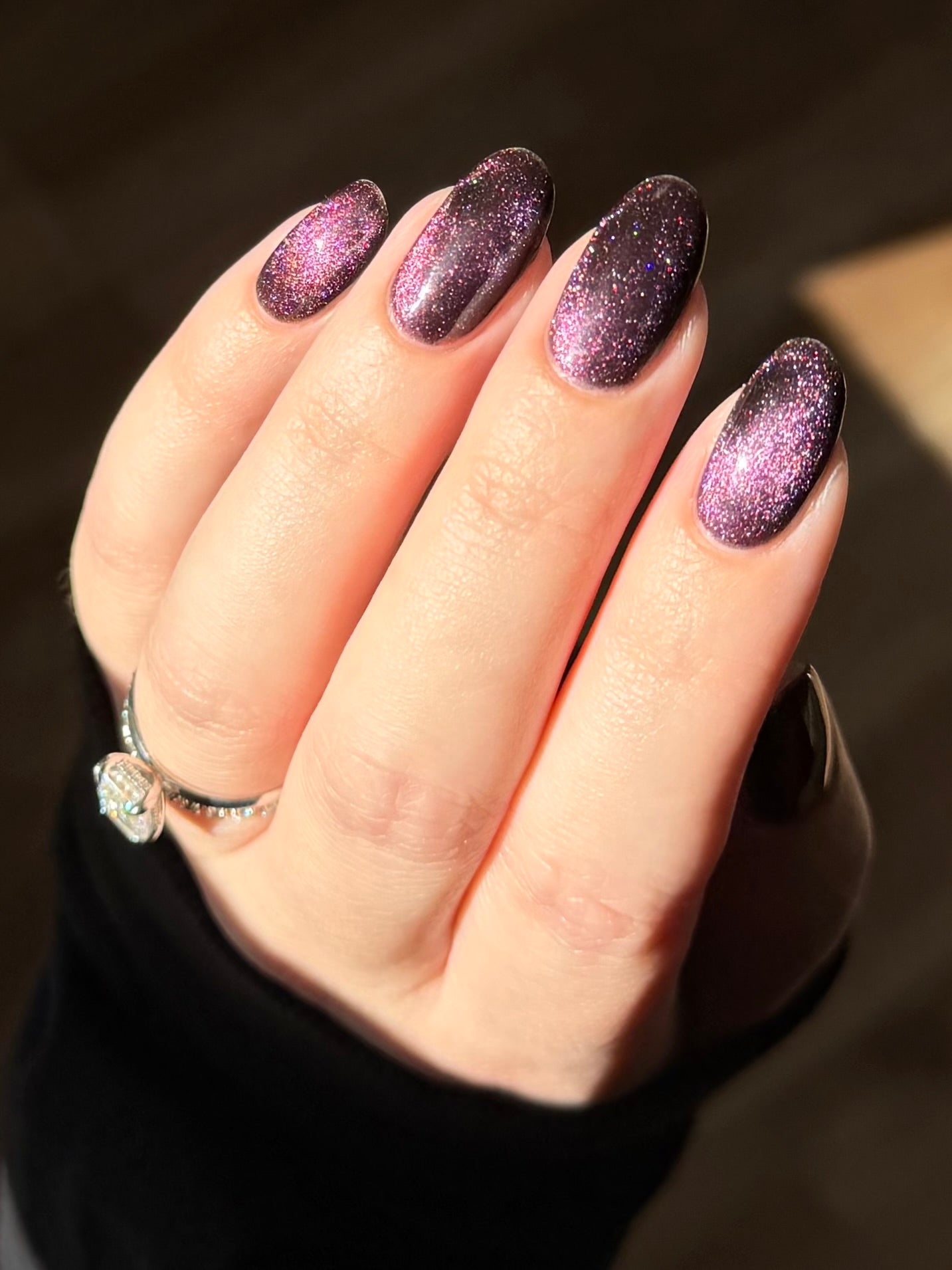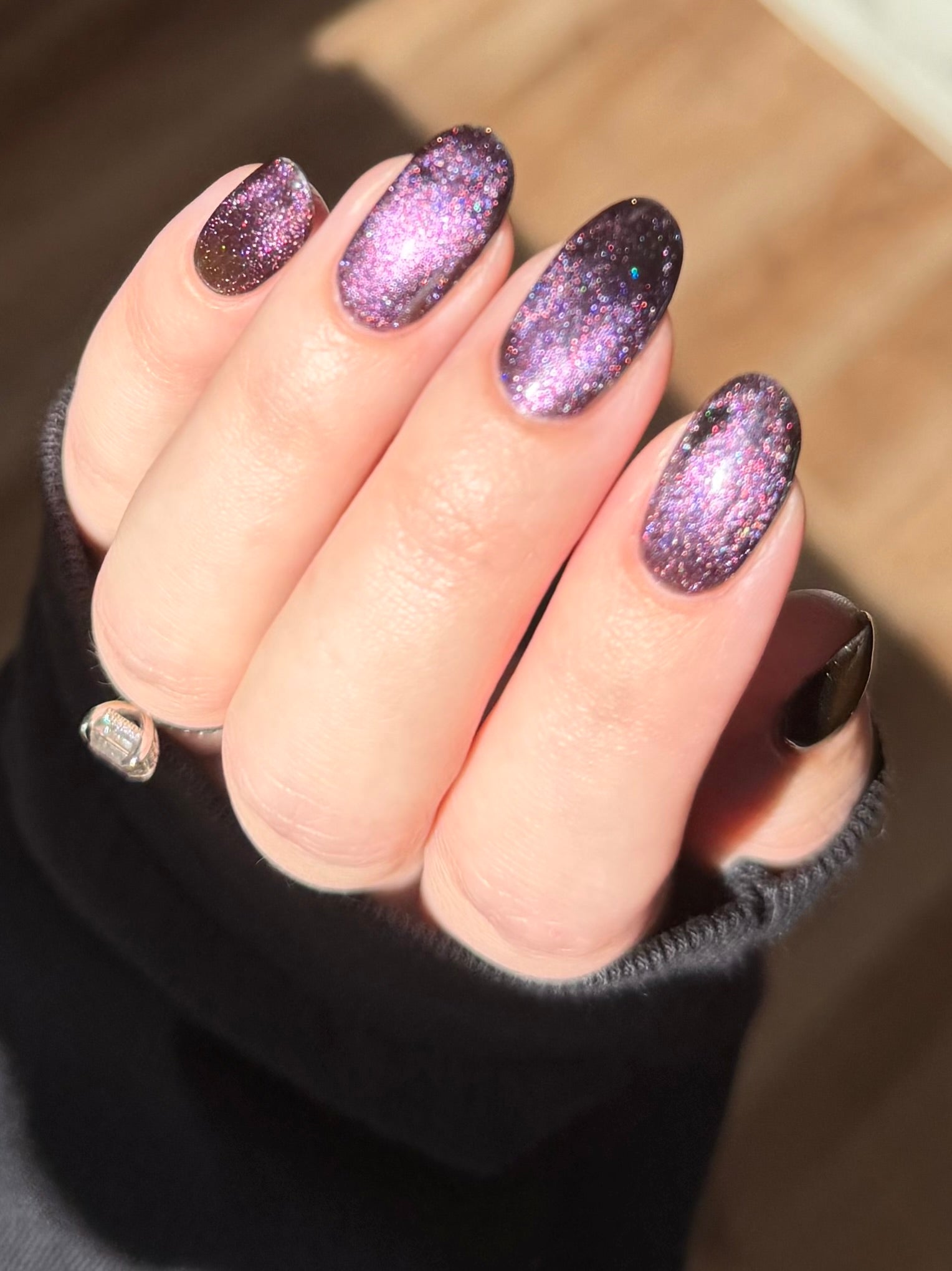 Sinister is a black base with a violet, red, and orange shifting magnetic with a dusting of black holo glitter for a scattered sparkle. The polish is a bit more sheer than others; three coats is recommended for maximum impact.