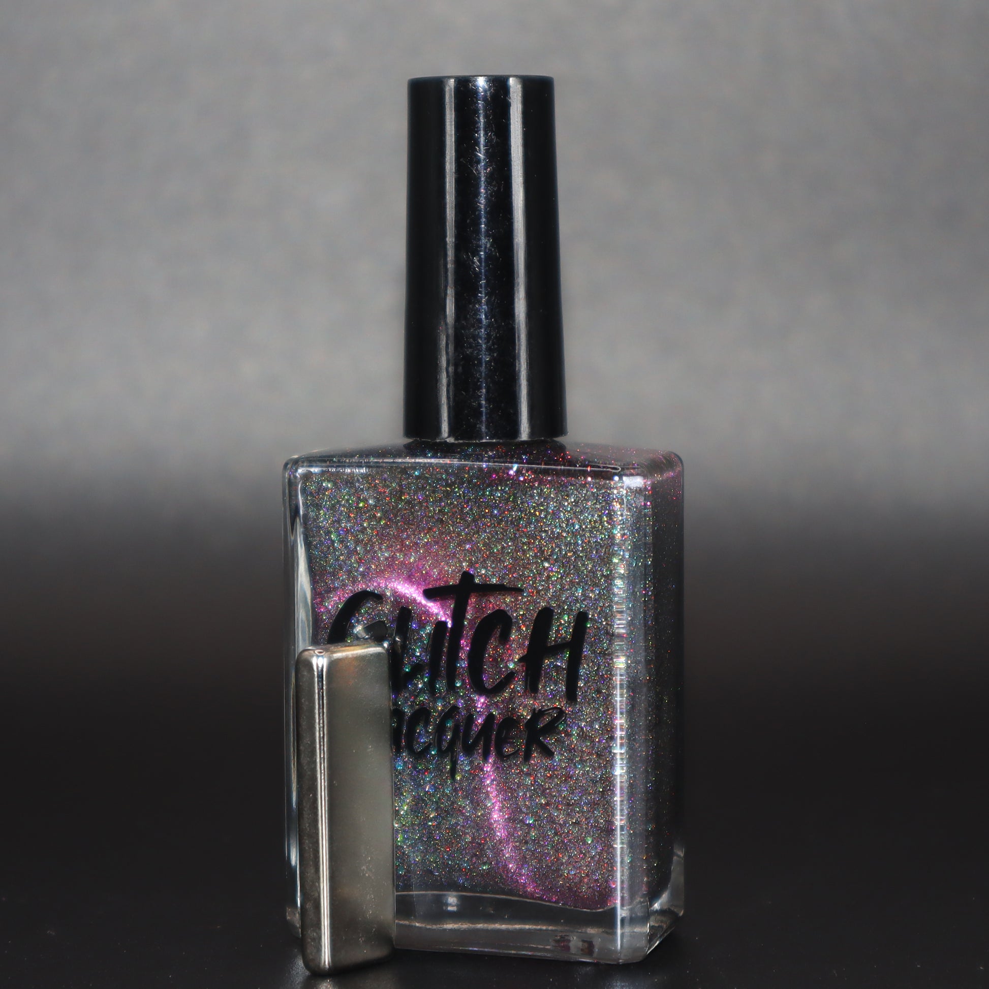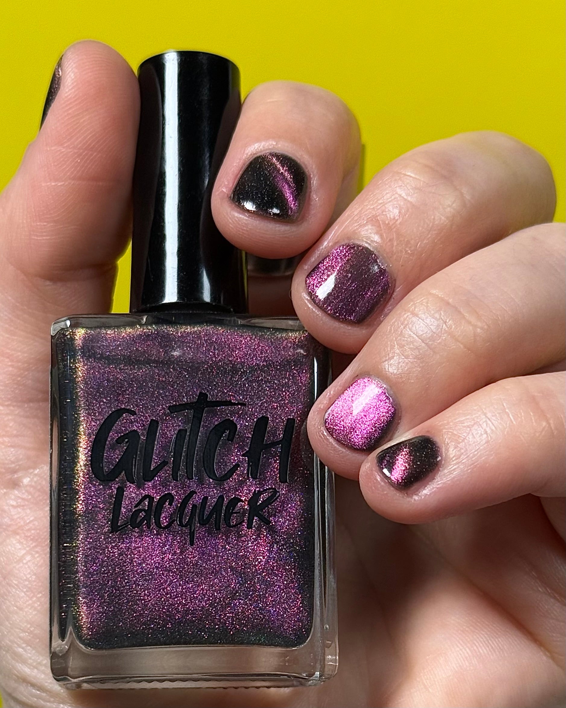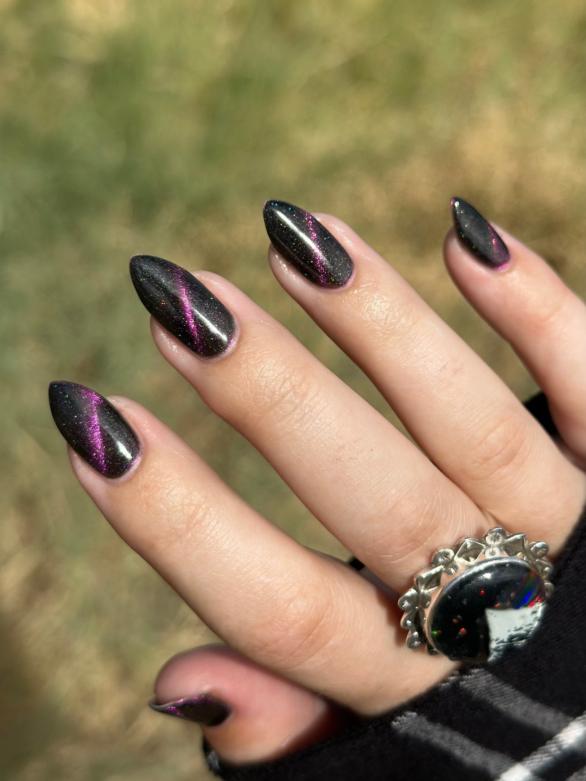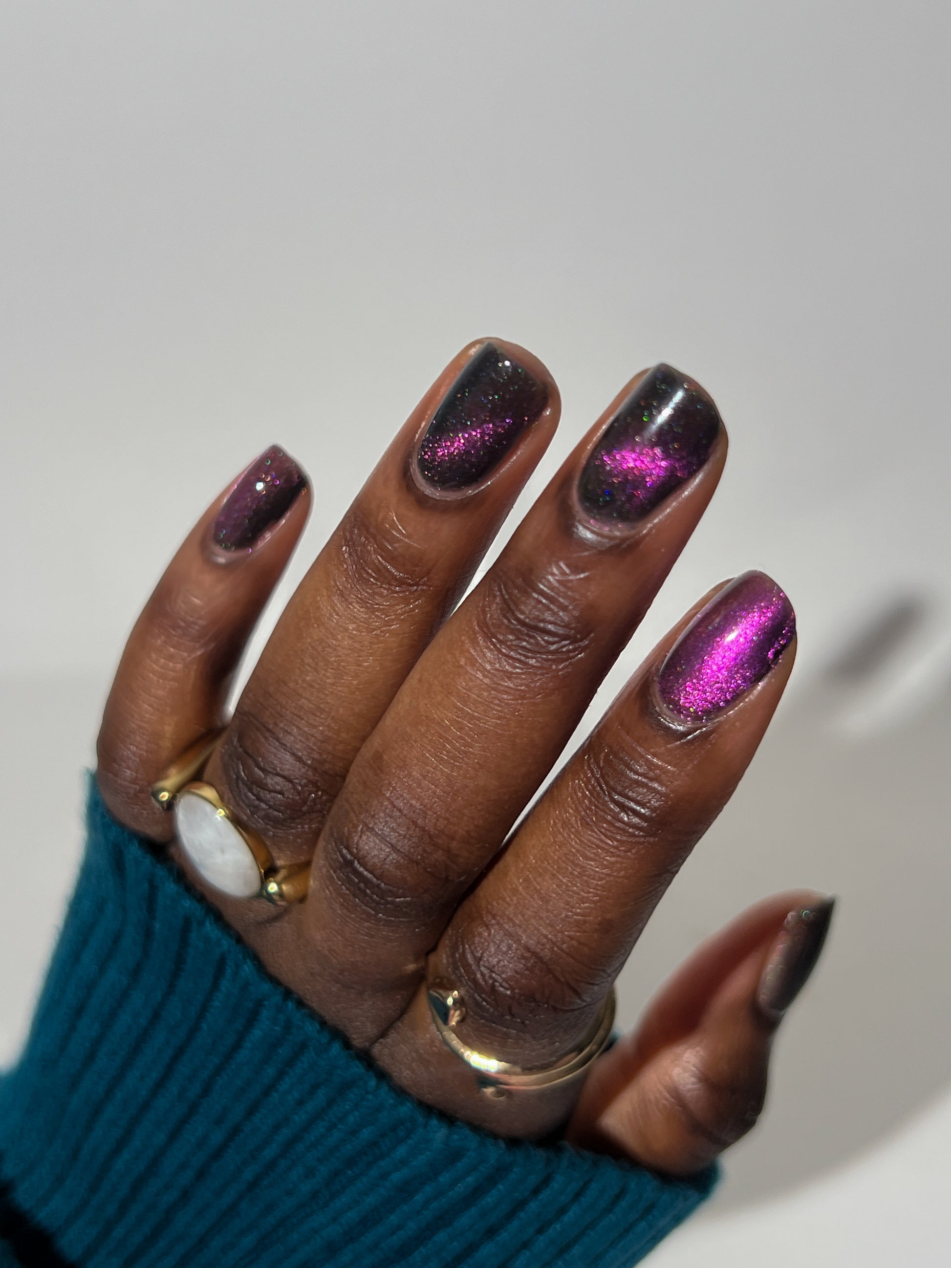 A magenta magnetic pigment in a black base with the lightest dusting of silver holographic glitter in the base.