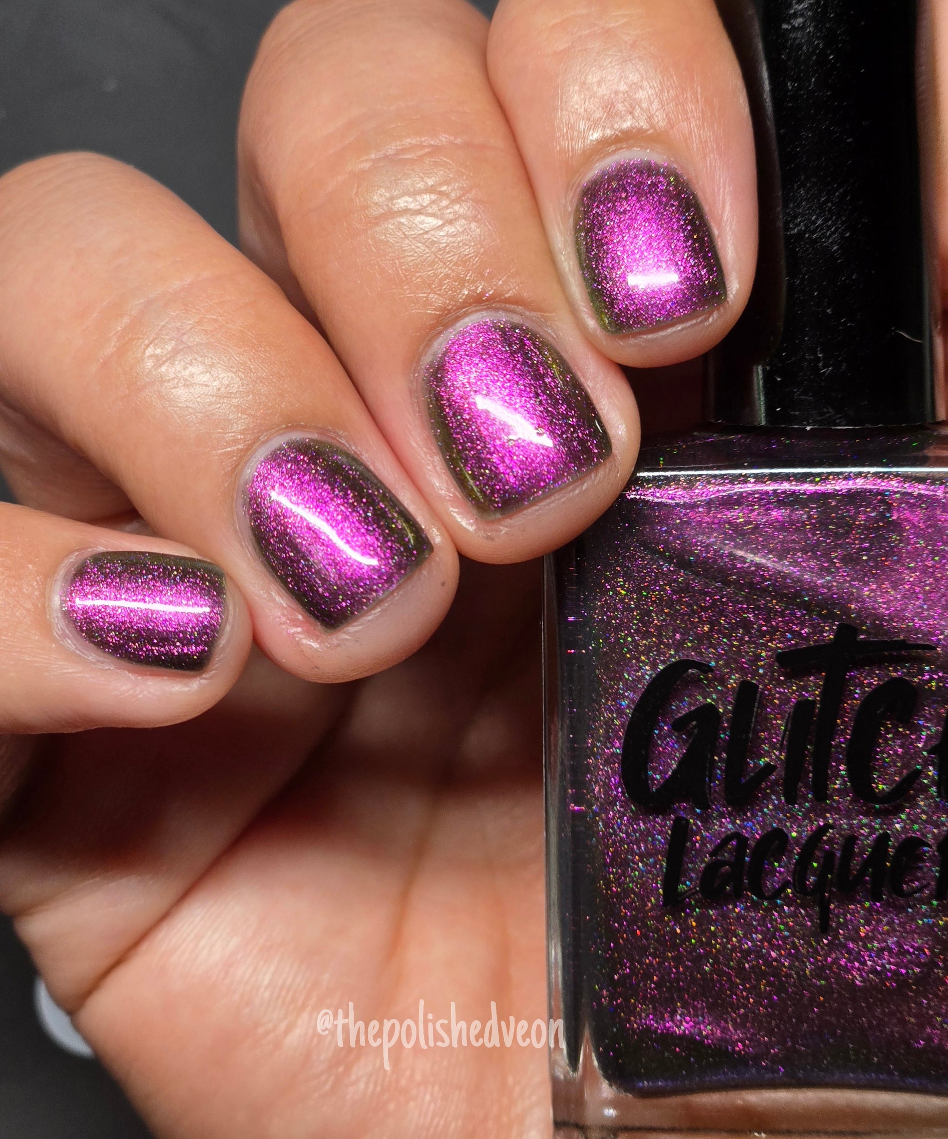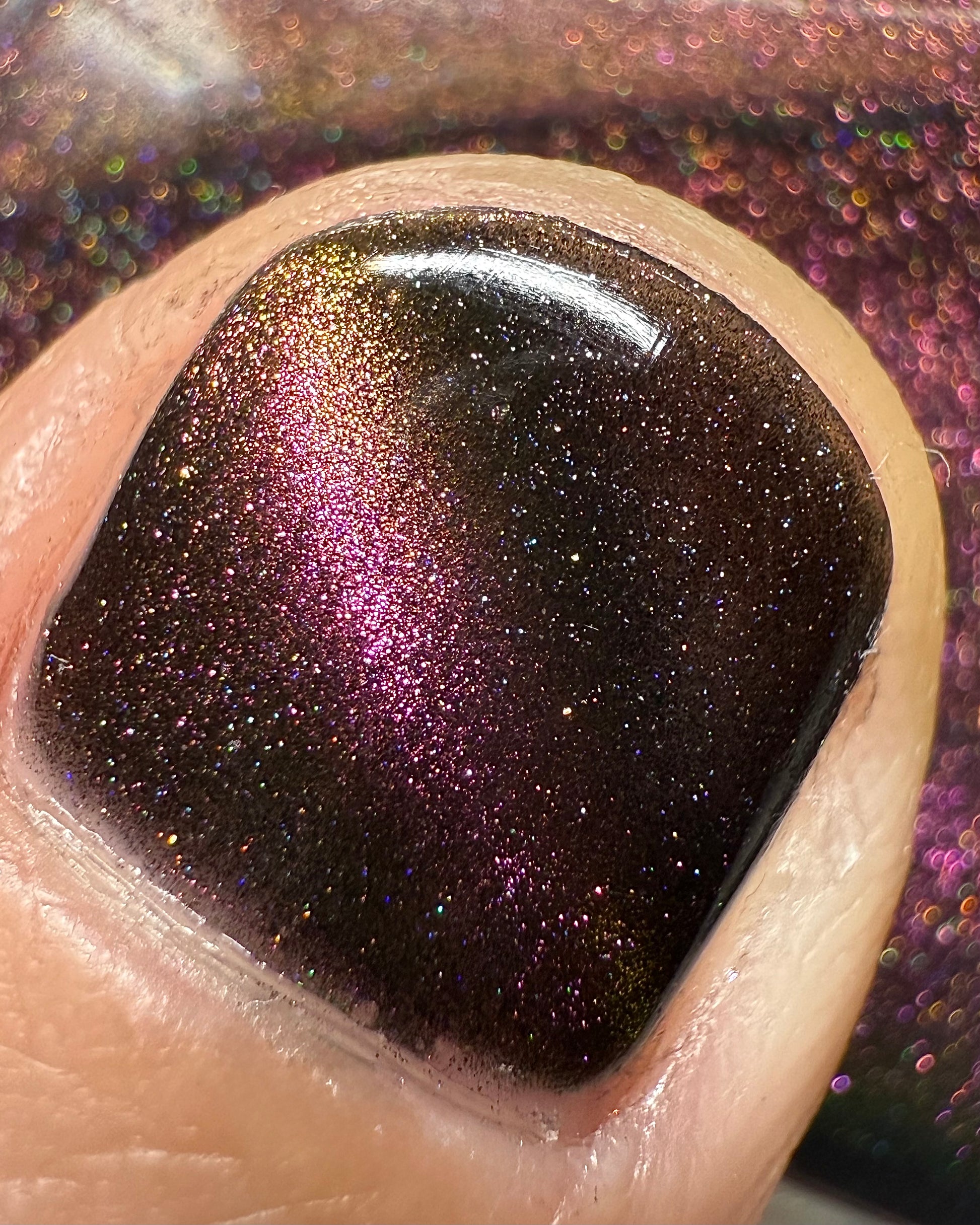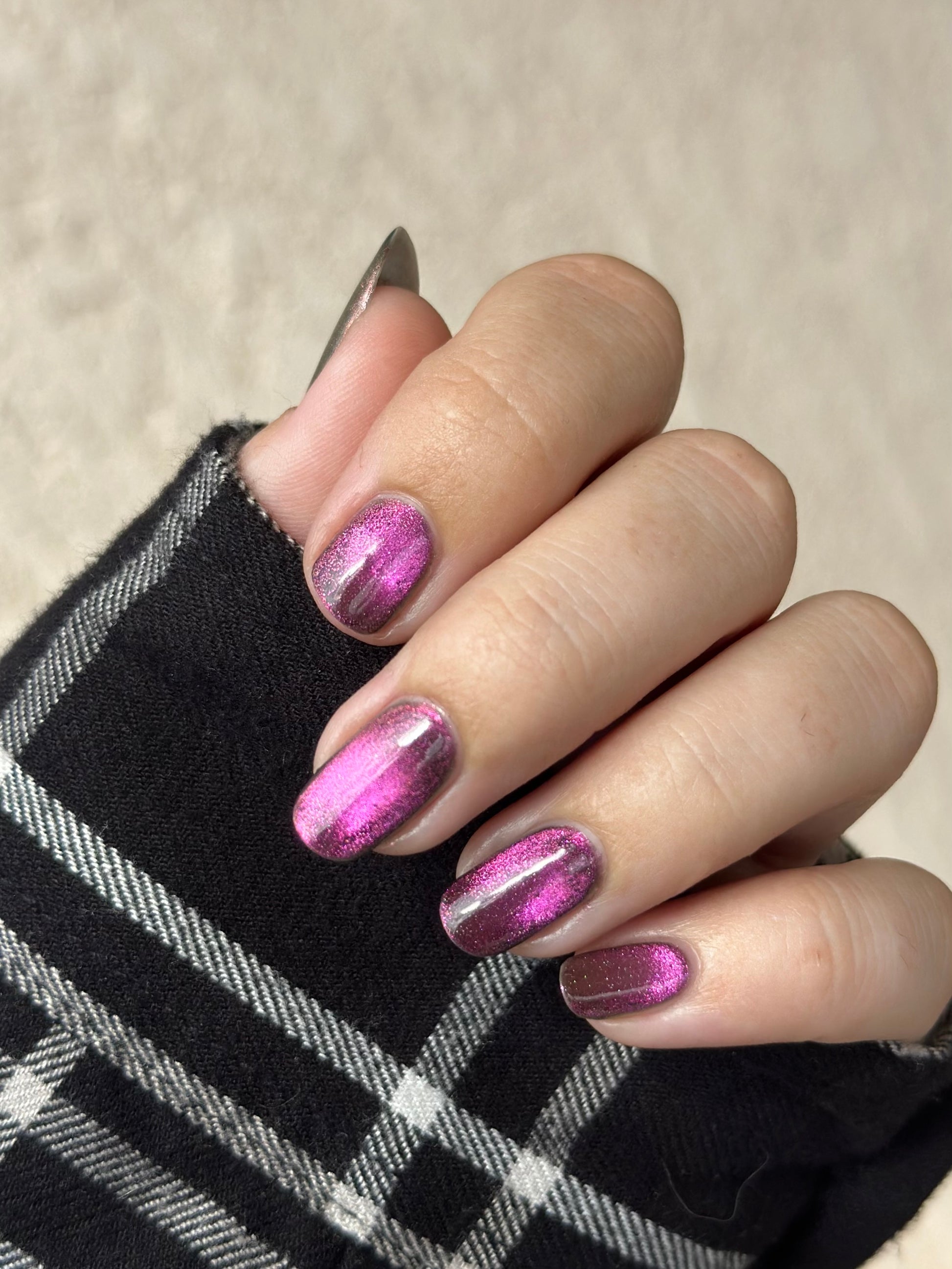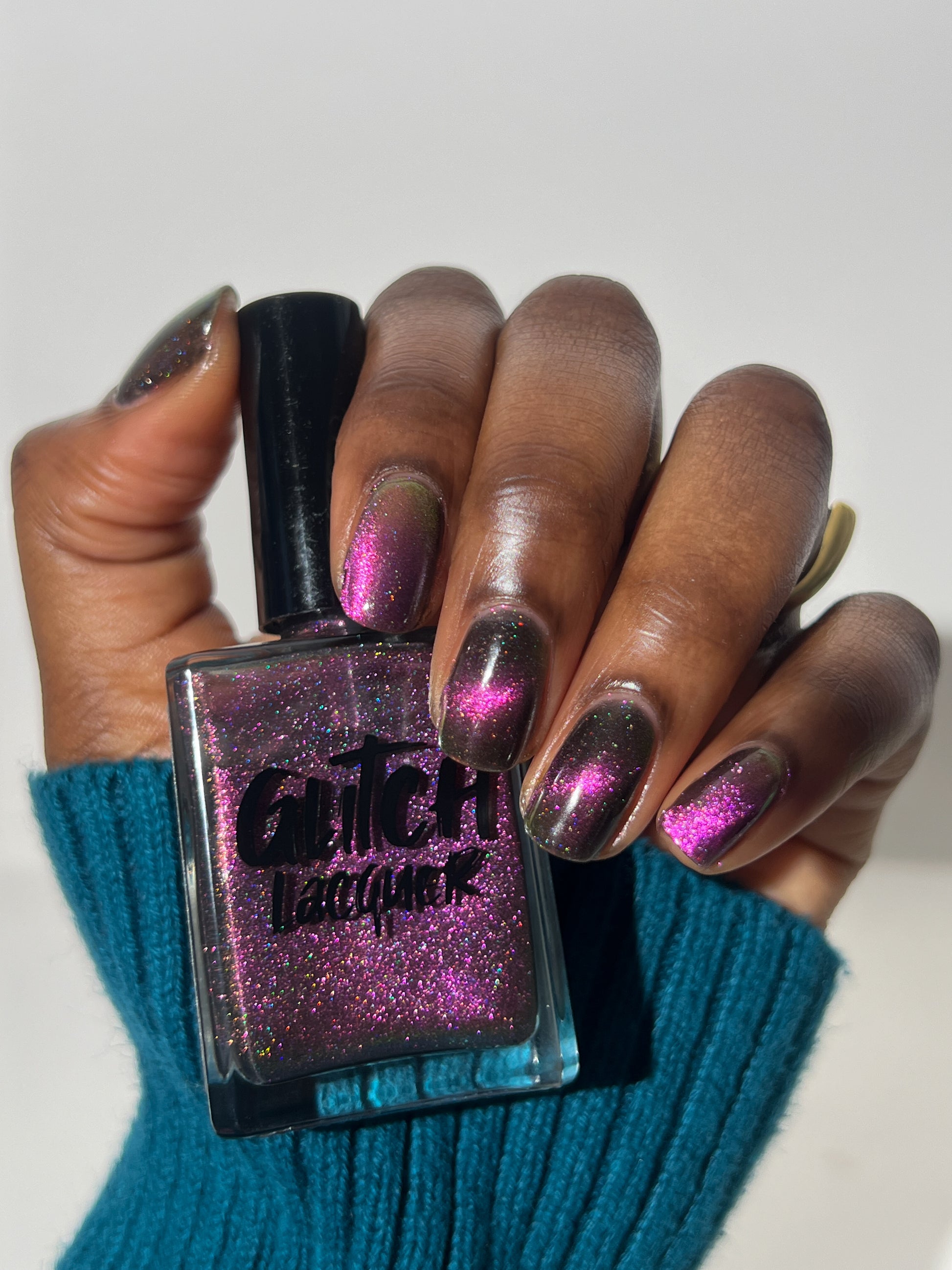 A magenta magnetic pigment in a black base with the lightest dusting of silver holographic glitter in the base.