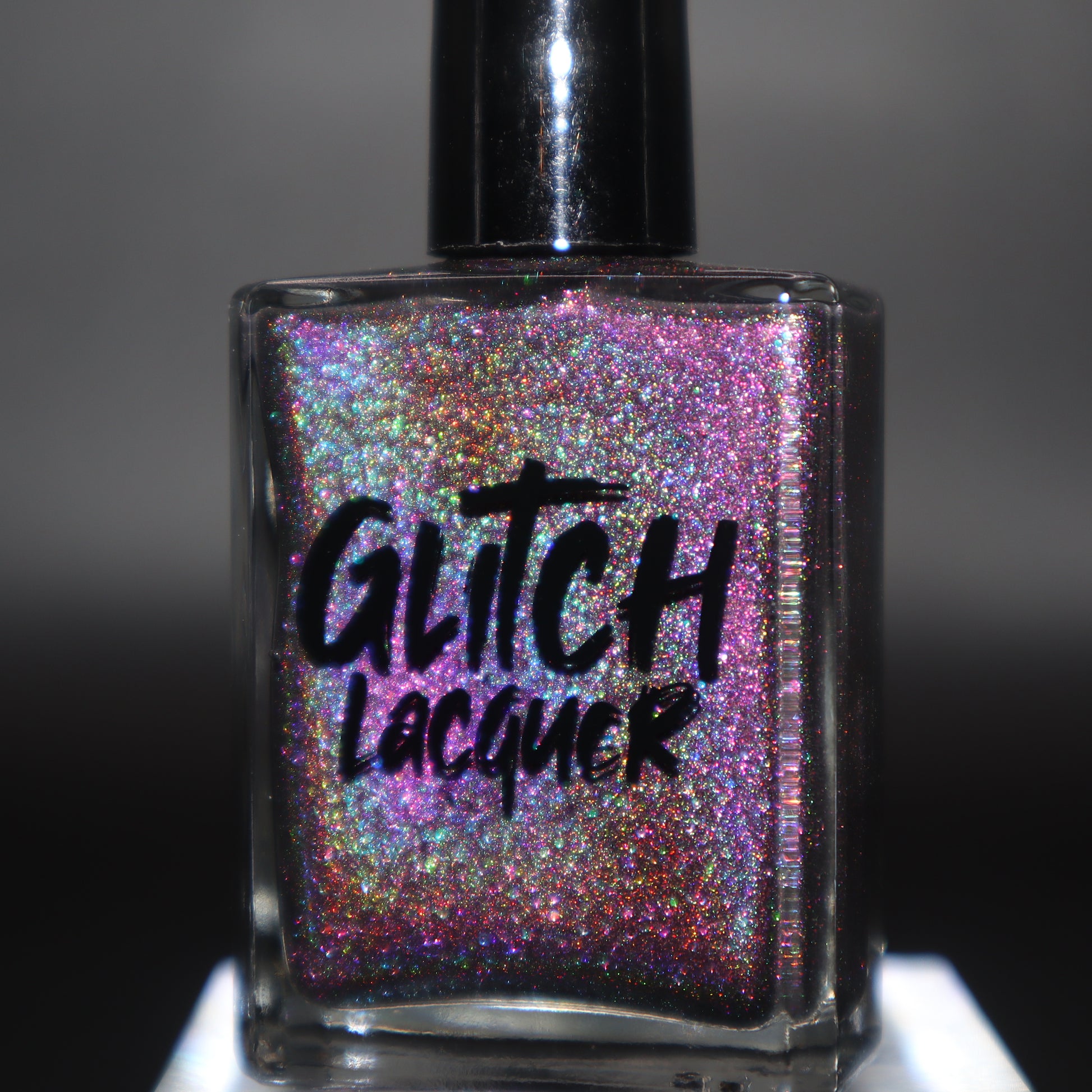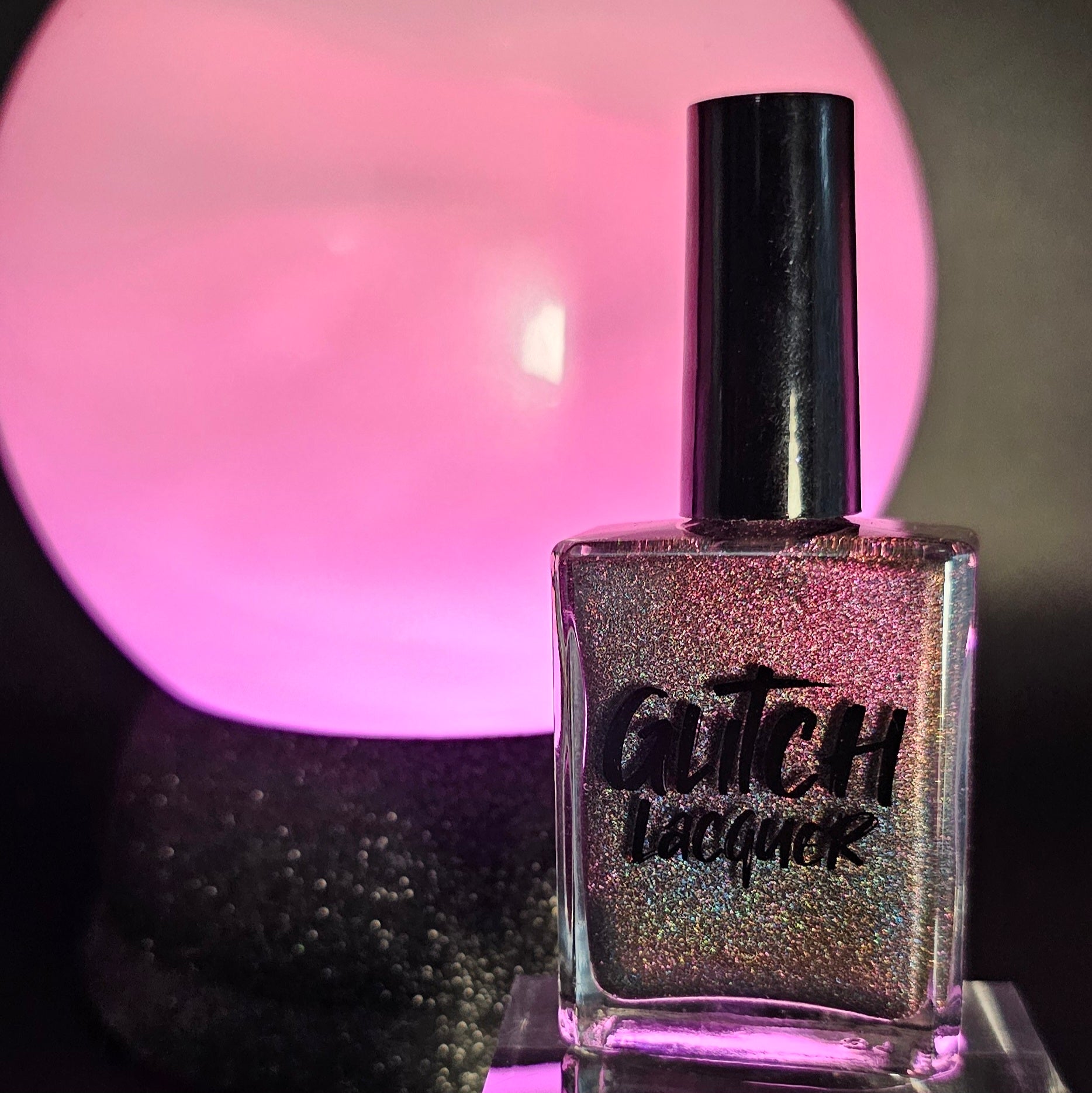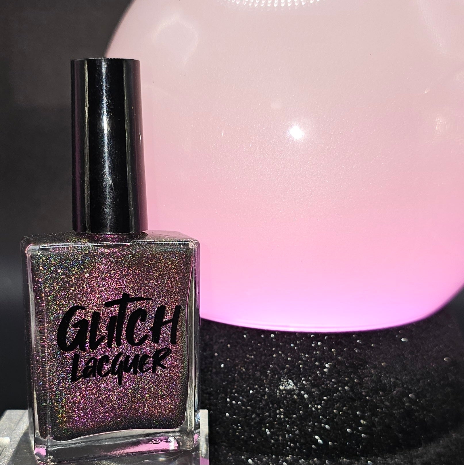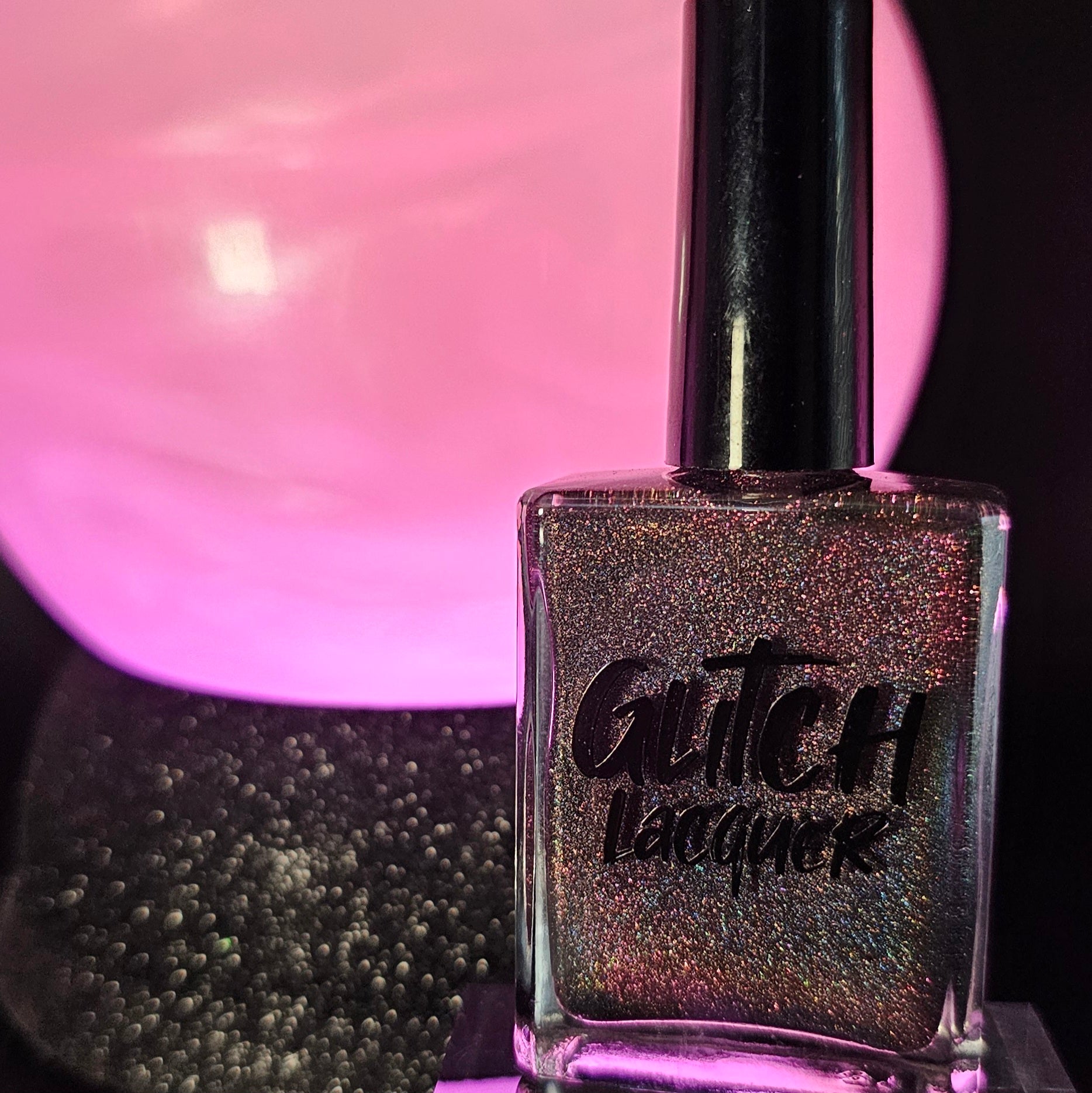 A magenta magnetic pigment in a black base with the lightest dusting of silver holographic glitter in the base.