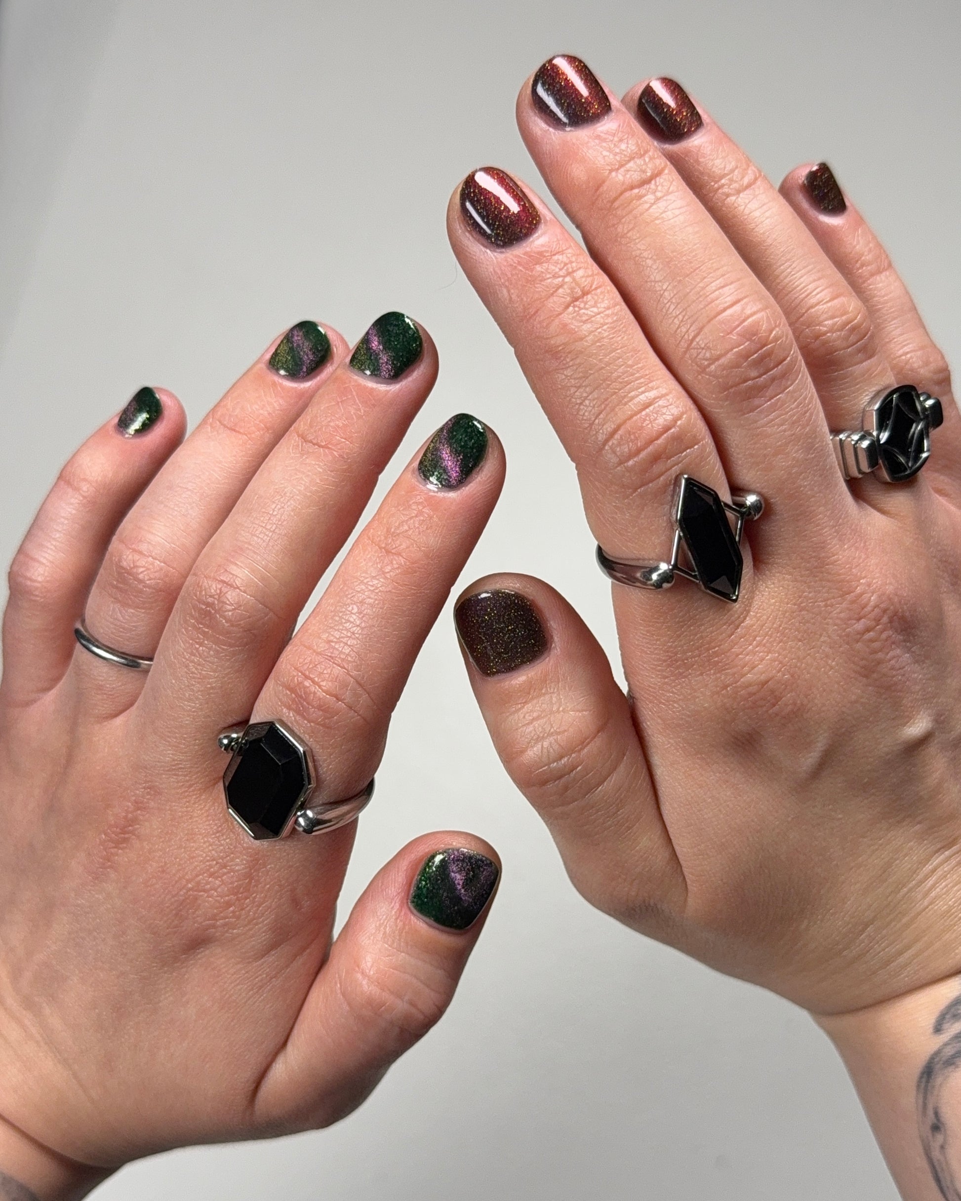 Arcadia is a deep green jelly base with mini gold flakes and a pink to gold to green magnetic pigment. This polish is inspired by Sleep Token’s Even in Arcadia.