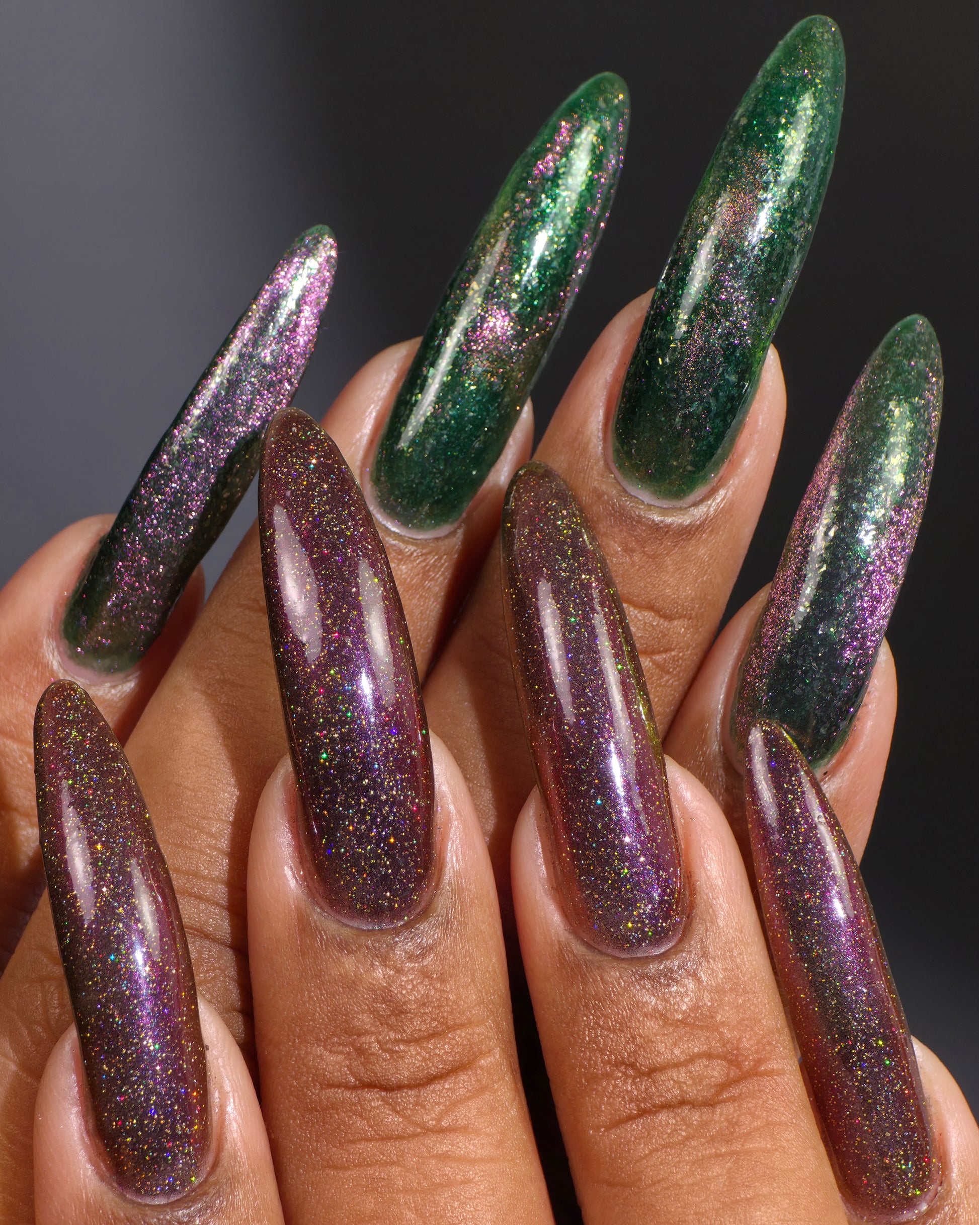 Memento Mori is a deep brown to red to orange to green multichrome with a dusting of gold holo glitters. The polish is more sheer than others; three to four coats is recommended for maximum impact.
