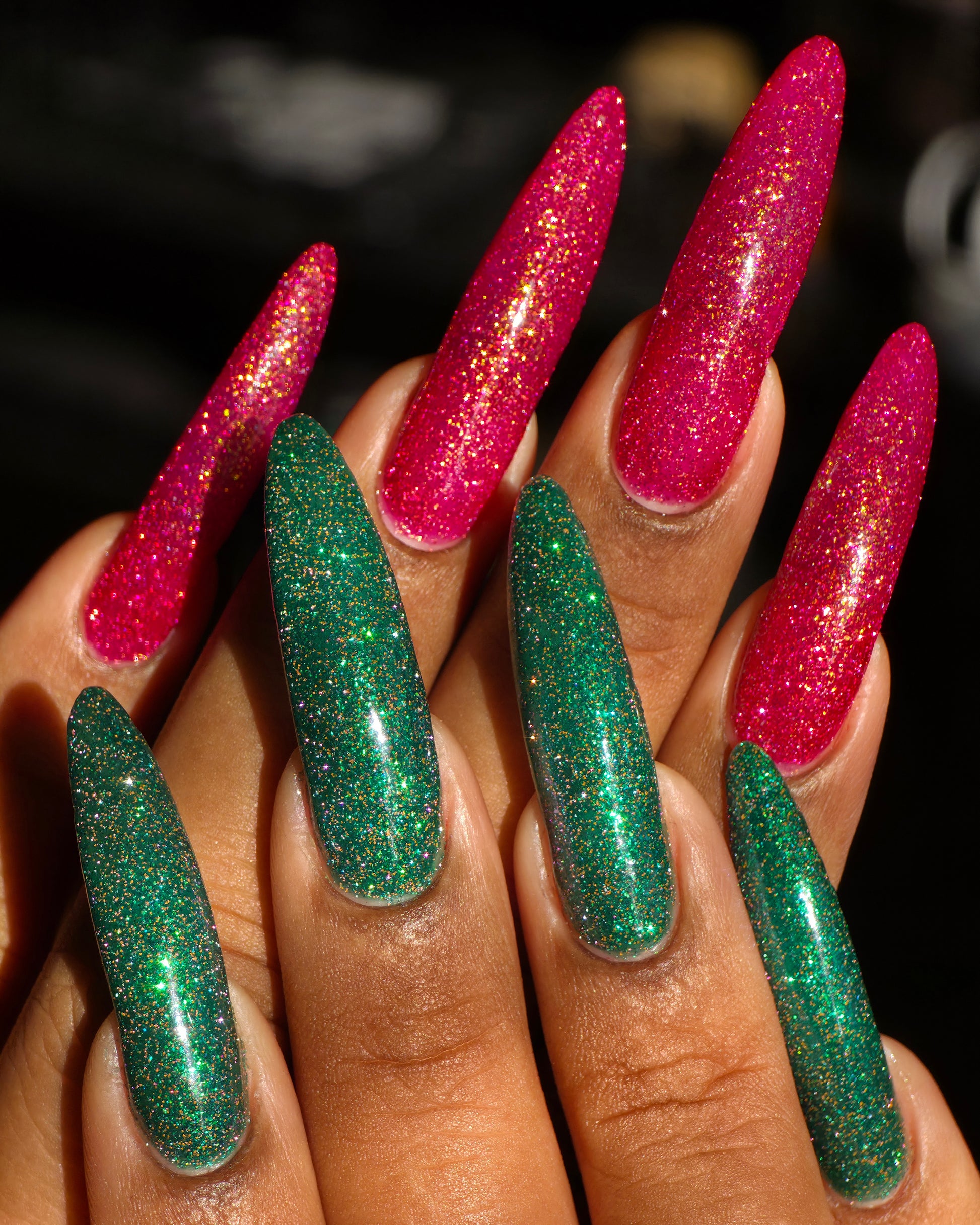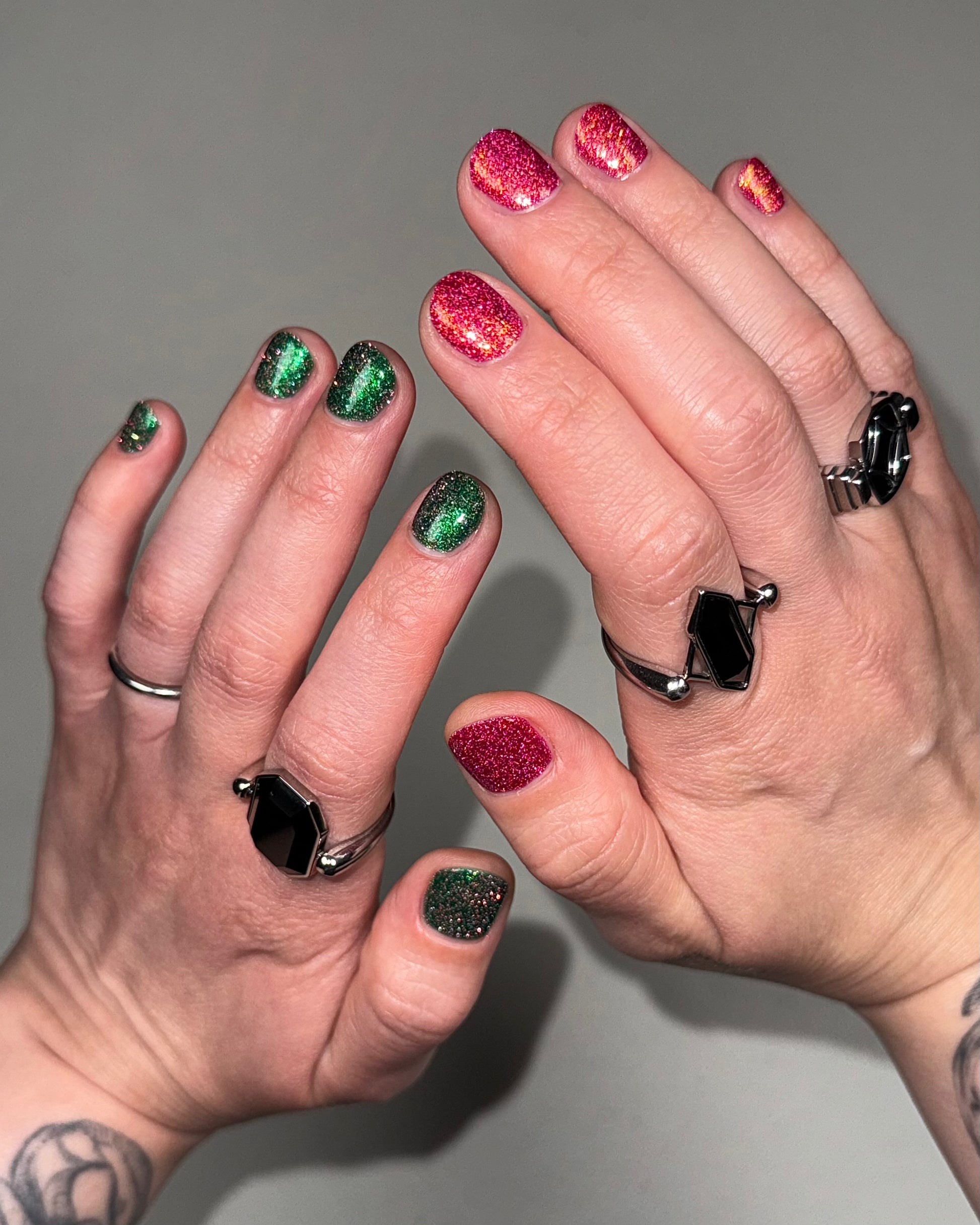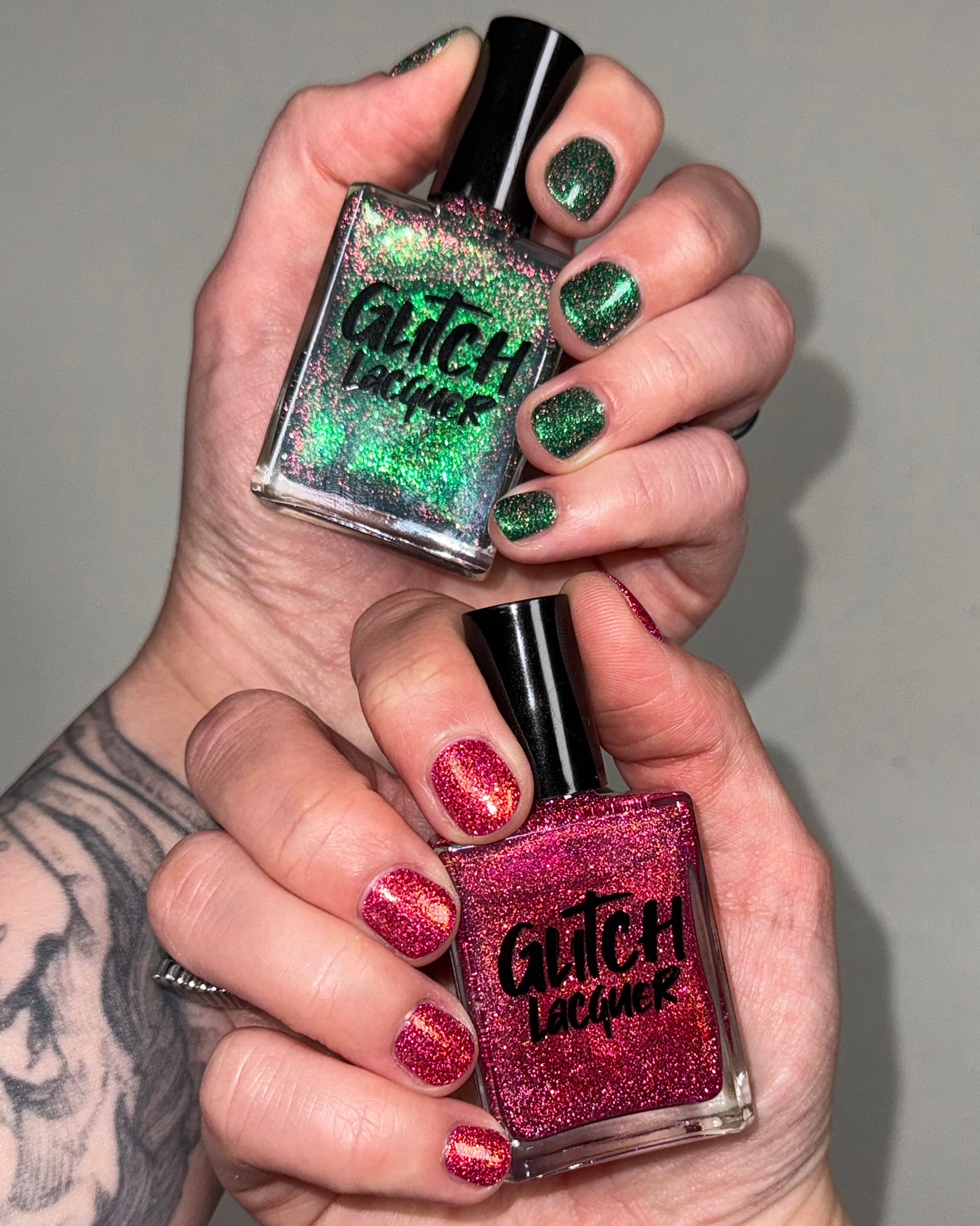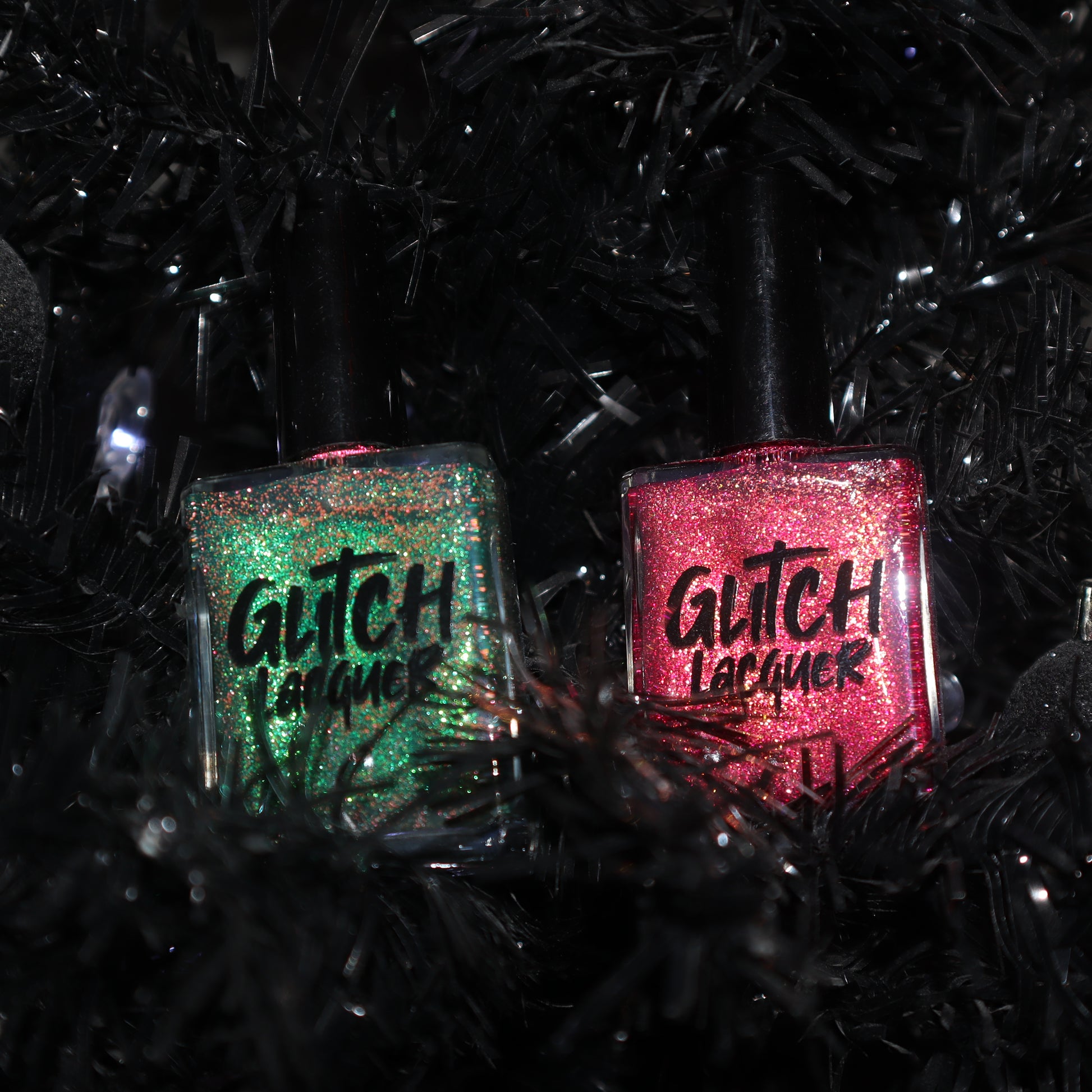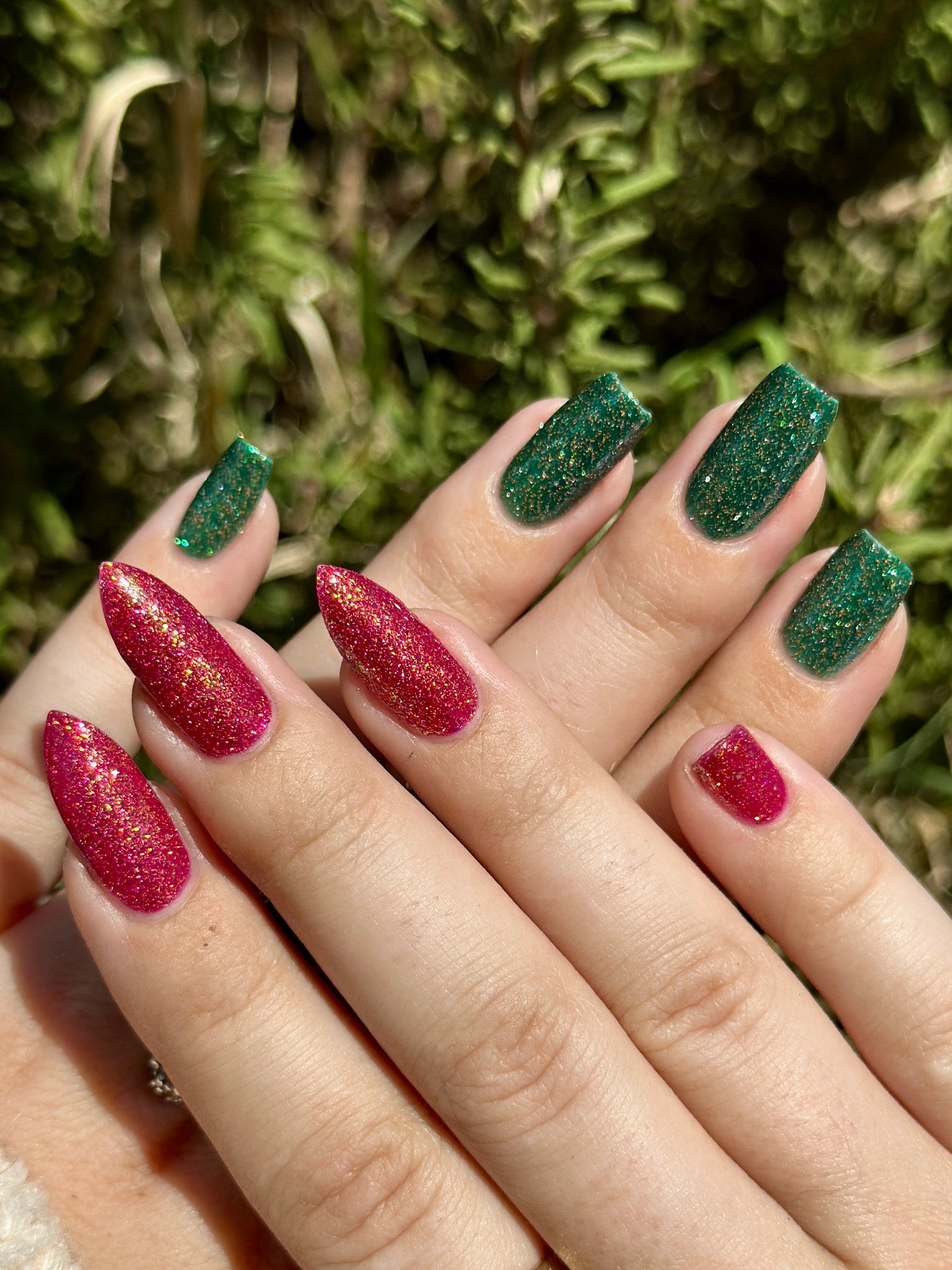 Christmas Tree is an emerald green base bursting with with pinky red reflective glitter & a bright green to purple shift.